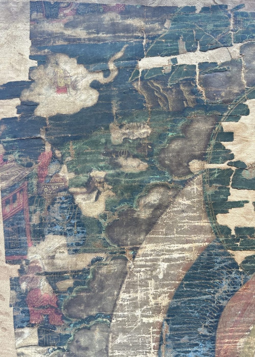 This weathered Tibetan Thangka painting features a meditative Buddha seated within a radiant mandorla, his calm expression and mudra conveying spiritual wisdom and inner peace. Despite its aged and worn condition, the artwork retains its sacred essence, with traces of vibrant pigments and background iconography hinting at divine realms and celestial beings. A powerful relic of devotional practice, it reflects the enduring legacy of Tibetan Buddhist art.