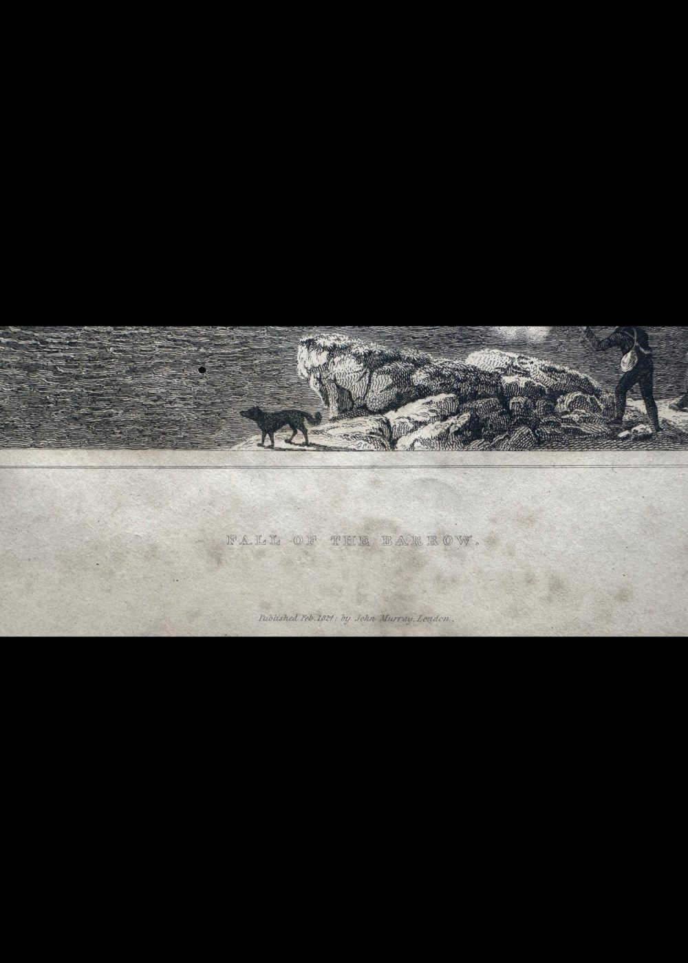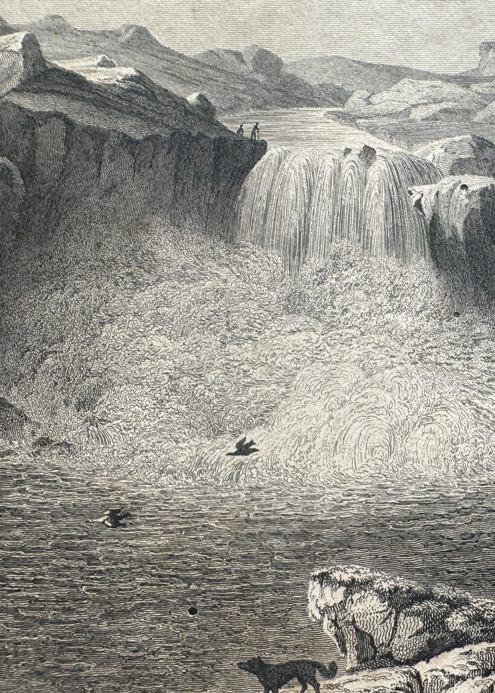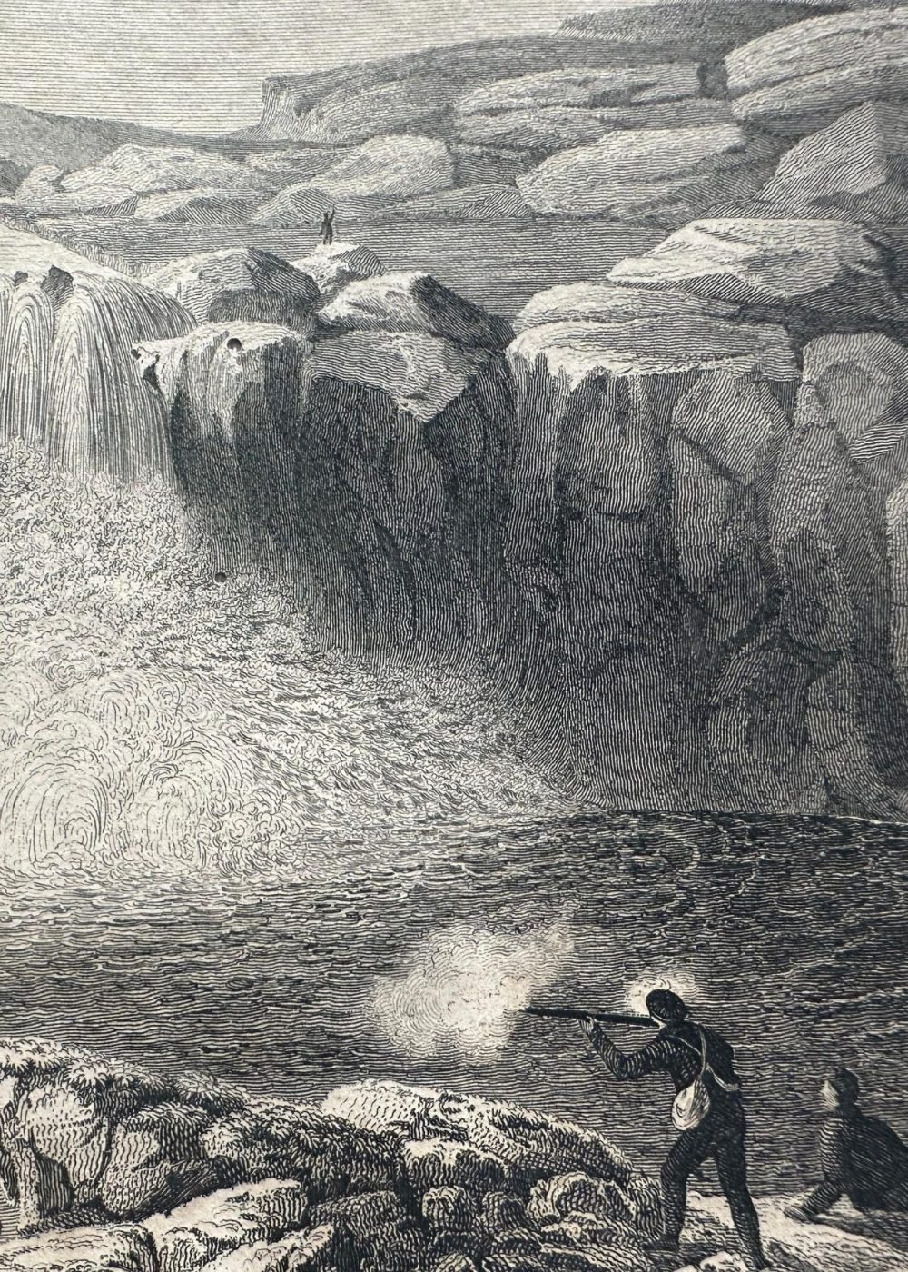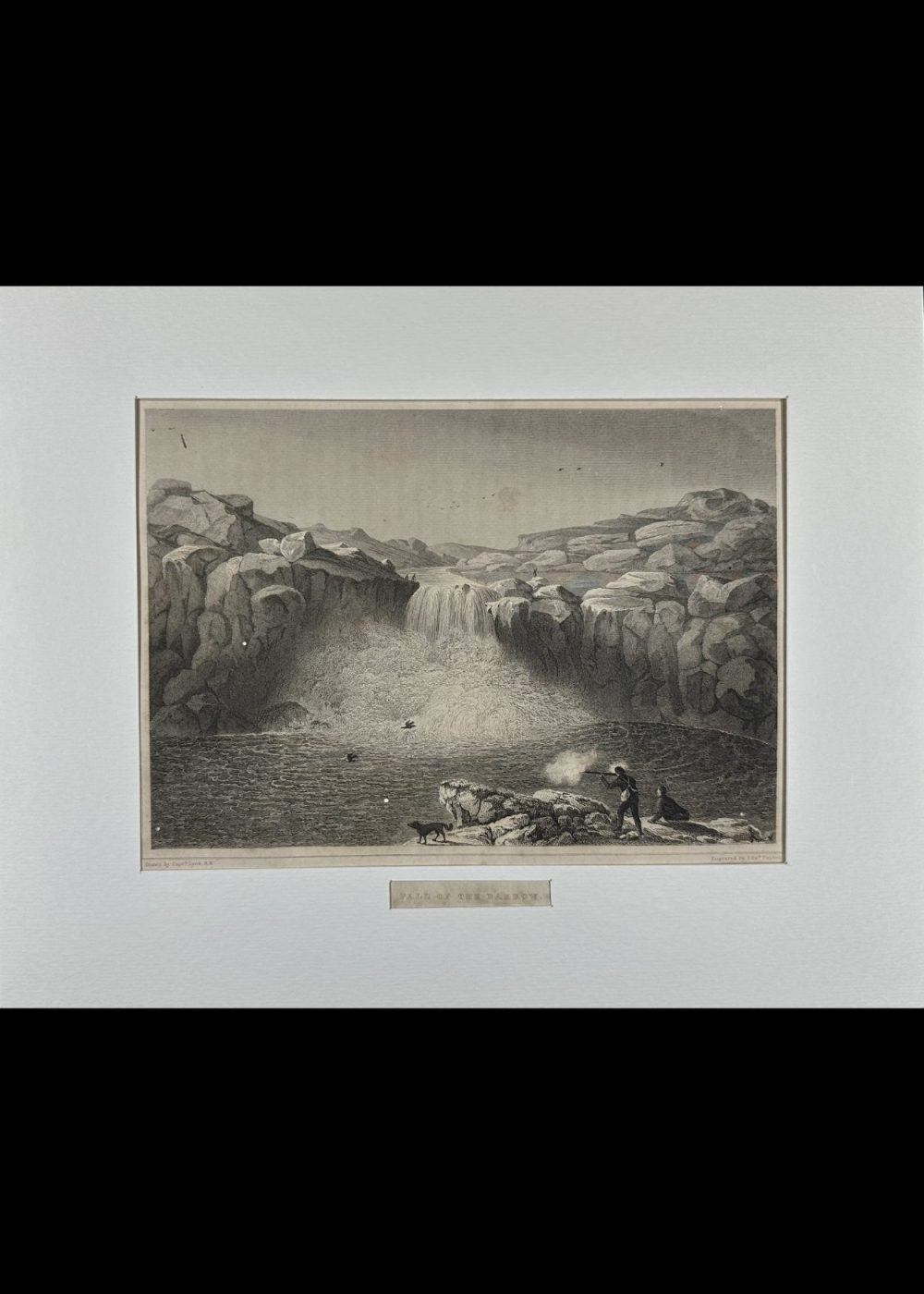This dramatic engraving, drawn by Captain Lyon R.N. and engraved by Edward Finden, depicts a striking Arctic waterfall scene known as the “Fall of the Wild-Fowl.” Surrounded by rugged rock formations, the powerful cascade plunges into a wide pool teeming with birds. In the foreground, a hunter fires at the wildfowl while another figure looks on, highlighting the area’s importance as a hunting ground. The composition conveys both the majesty of untamed nature and the resourceful presence of human activity within it, emphasizing themes of survival and exploration in the Arctic wilderness.