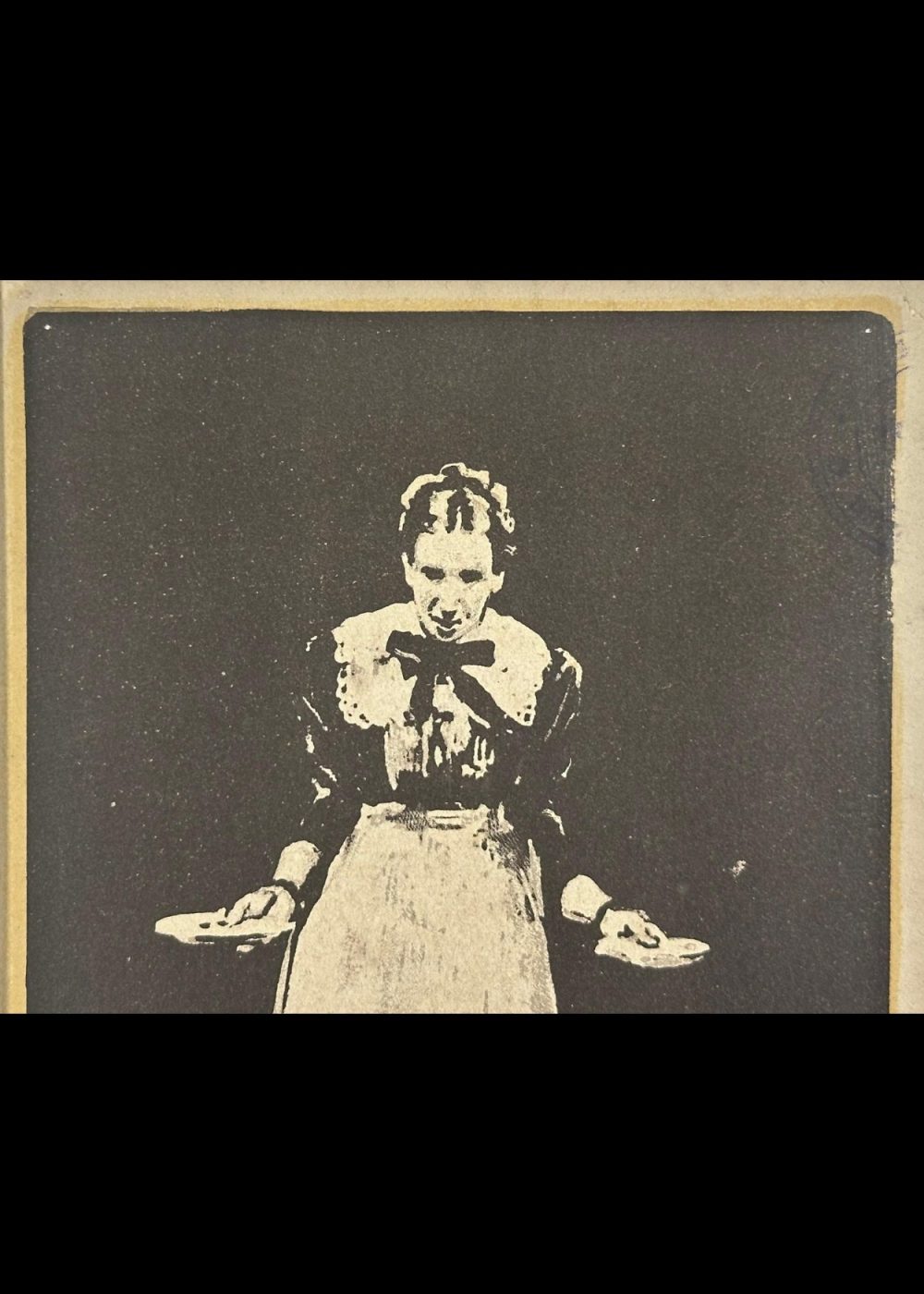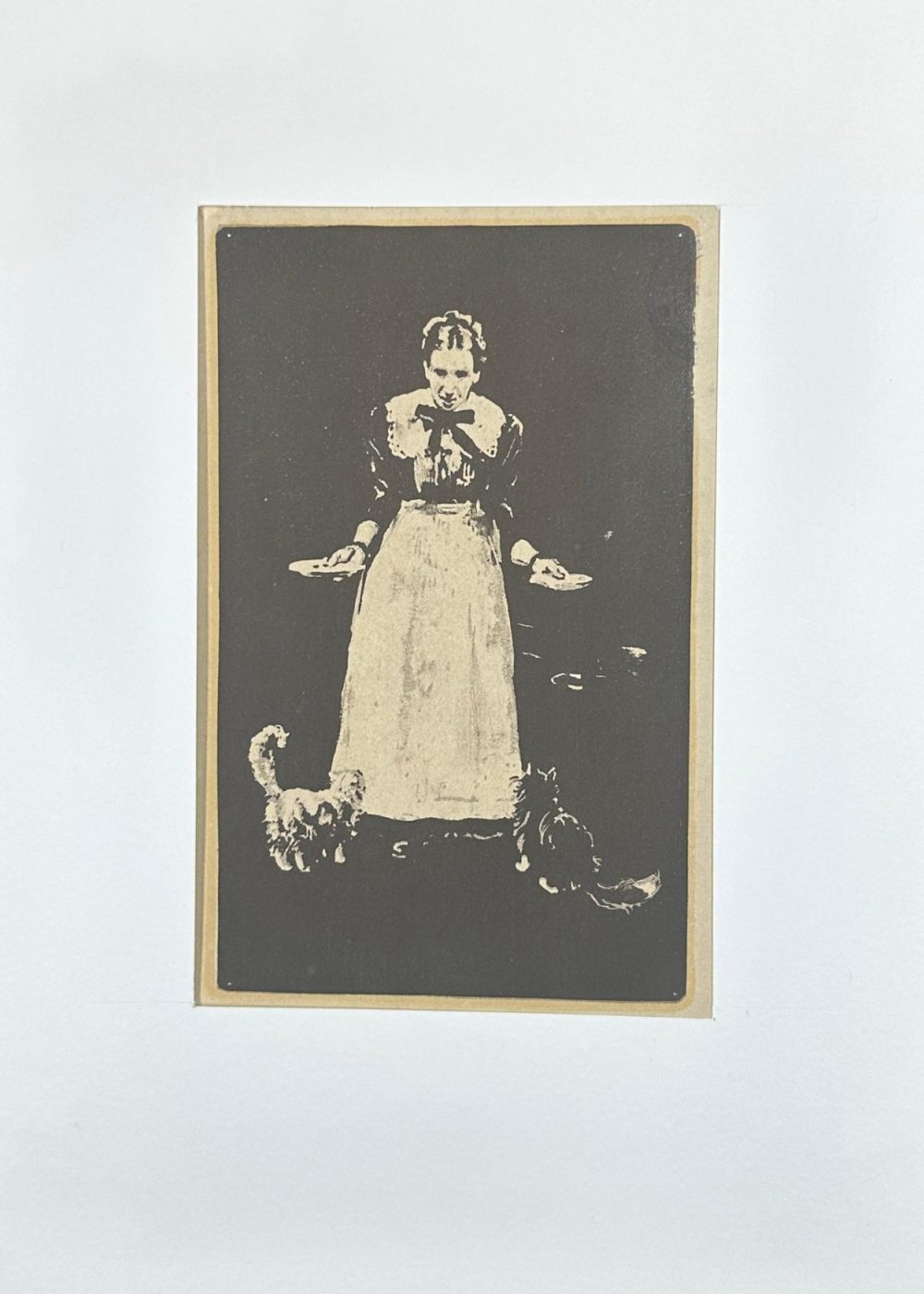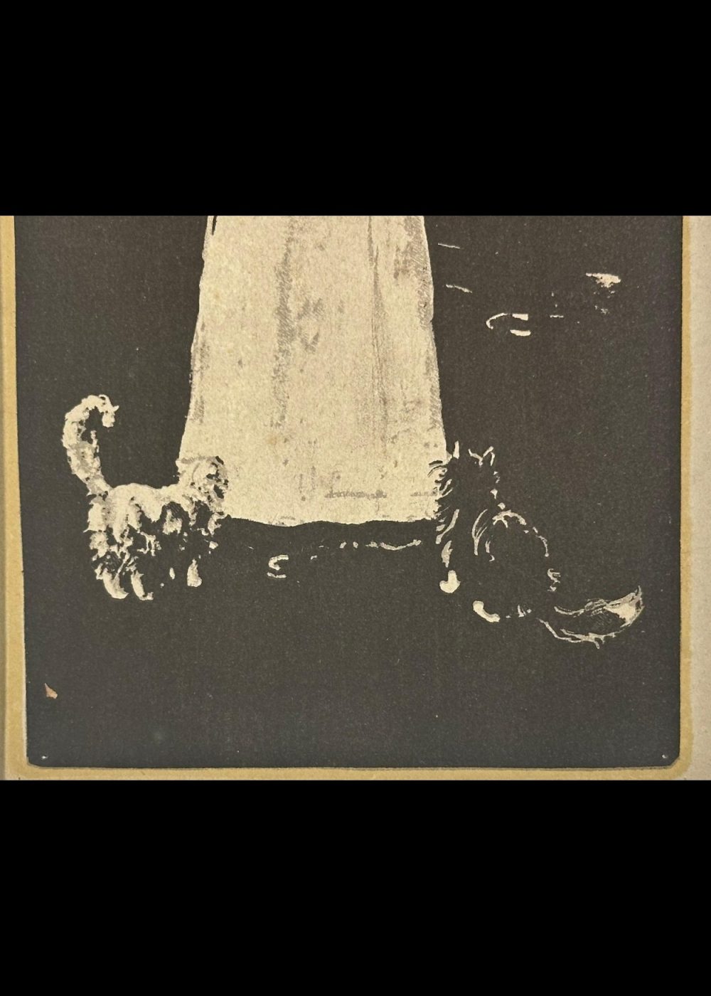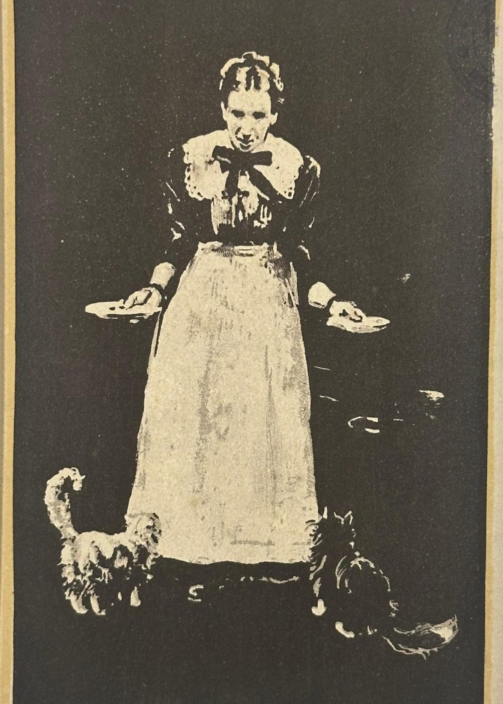 This charming lithograph depicts a domestic scene centered around a woman preparing to feed two eager cats. Dressed in a traditional maid’s uniform with a lace collar and apron, the woman stands frontally, holding a plate in each hand while the animals wait attentively at her feet. The stark contrast of light and shadow creates a theatrical focus on her figure, isolating it against a near-black background and heightening the sense of moment and routine. The composition balances intimacy with formality, capturing a quiet ritual of care and companionship. Likely created during a time when domestic service and animal-keeping were central elements of middle-class life, this image offers a nostalgic glimpse into early 20th-century household rhythms, rendered with warmth and simplicity.