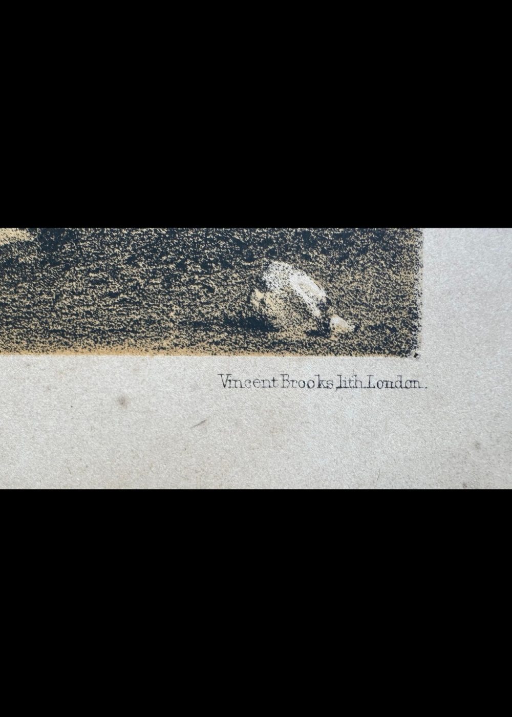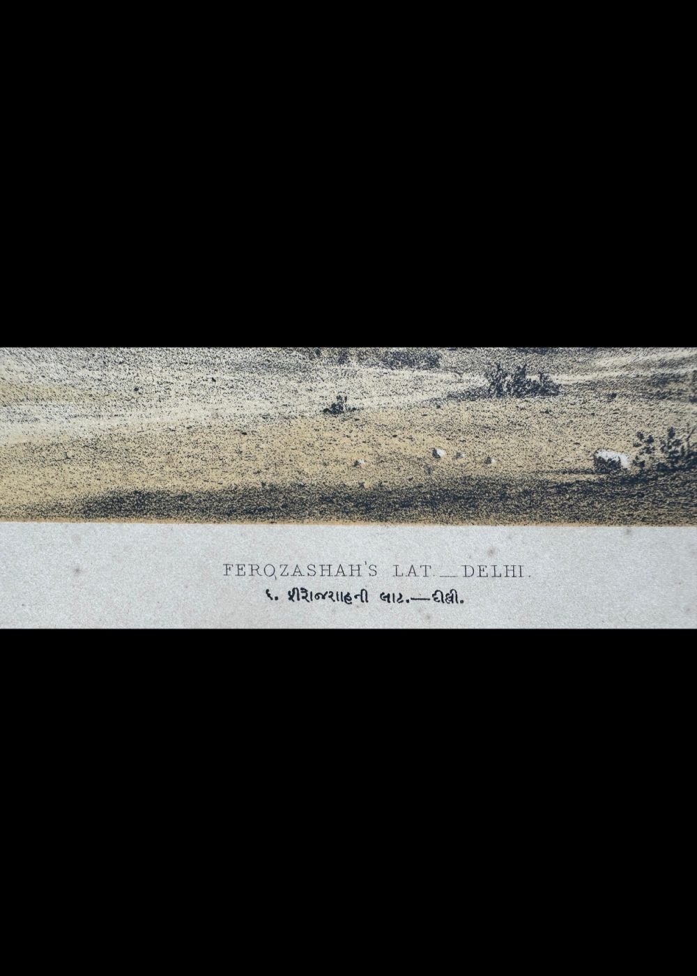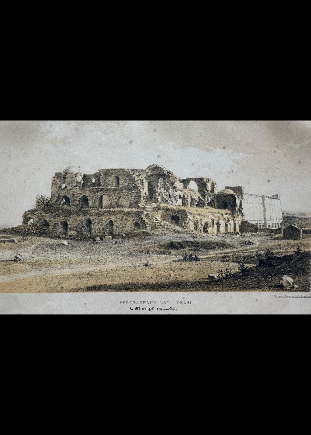 This chromo-lithograph depicts the ruins of Feroz Shah’s Lat (also known as Feroz Shah Kotla), a historical monument in Delhi, India. The image captures the crumbling structure with its distinctive arched windows and remnants of the walls. In the background, you can see a building that contrasts with the older ruins, likely representing the changing landscape of Delhi during the British colonial period. The lithograph, produced by Vincent Brooks in London, is part of the “Travels of India” series, offering a glimpse of the architectural heritage of the time. The text at the bottom identifies the site as “Feroz Shah’s Lat, Delhi.”