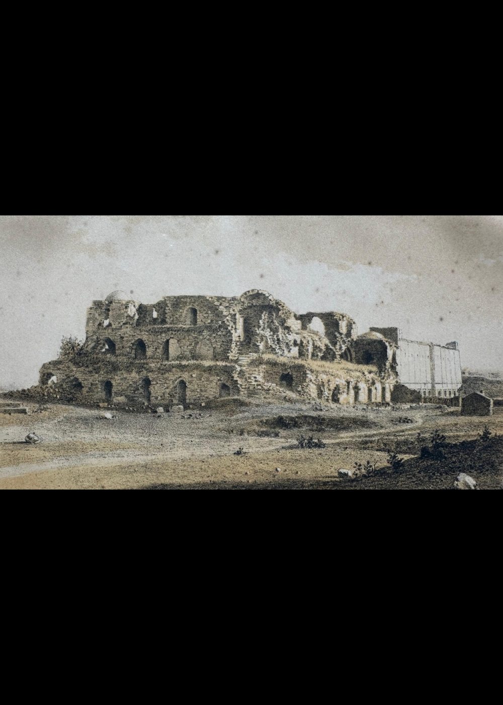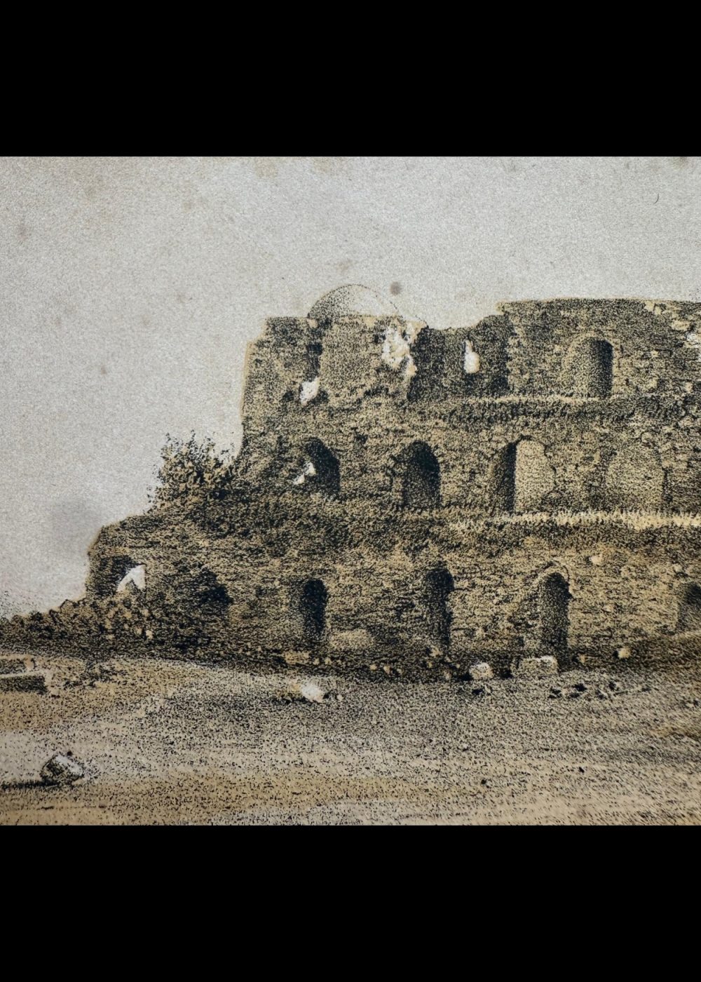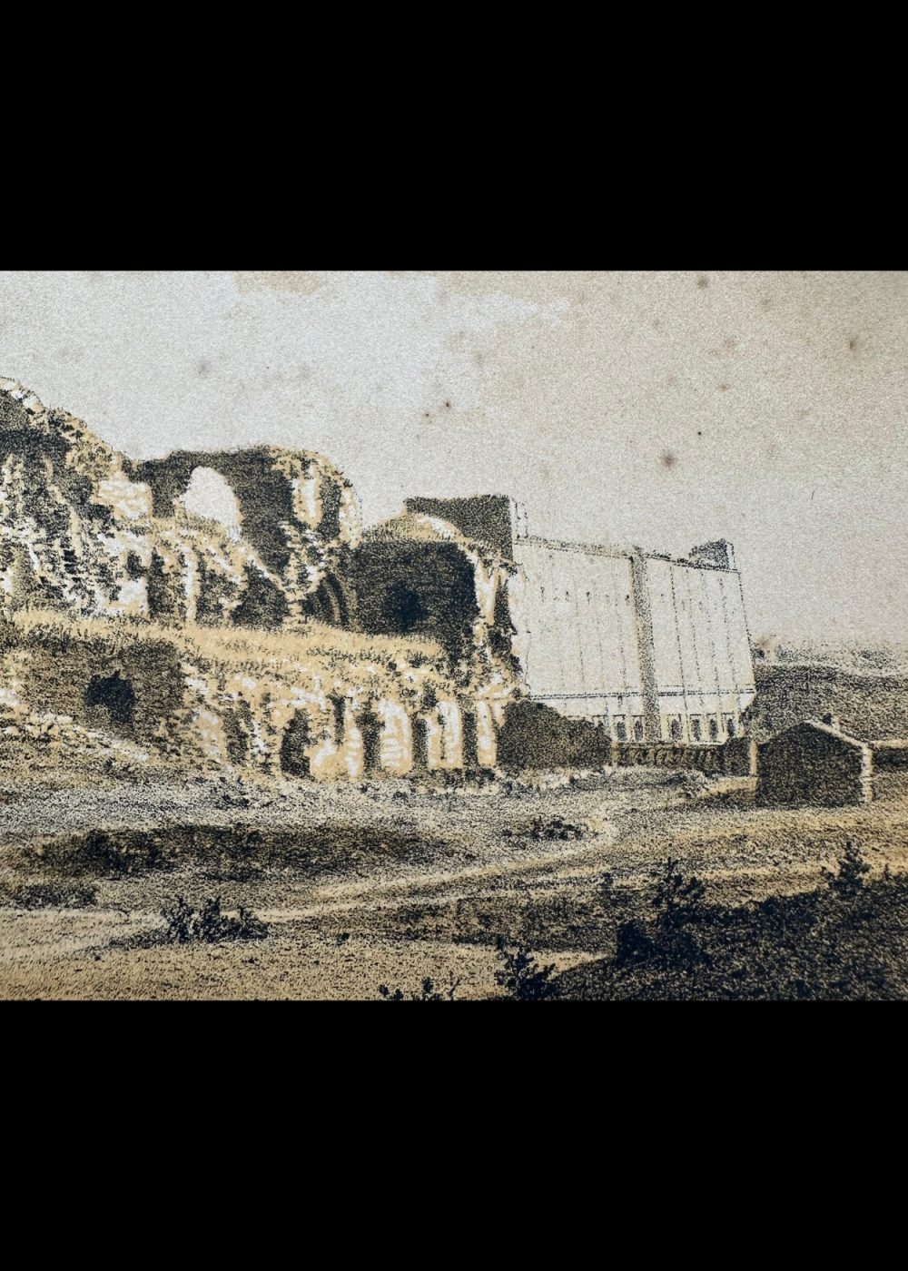 This chromo-lithograph depicts the ruins of Feroz Shah’s Lat (also known as Feroz Shah Kotla), a historical monument in Delhi, India. The image captures the crumbling structure with its distinctive arched windows and remnants of the walls. In the background, you can see a building that contrasts with the older ruins, likely representing the changing landscape of Delhi during the British colonial period. The lithograph, produced by Vincent Brooks in London, is part of the “Travels of India” series, offering a glimpse of the architectural heritage of the time. The text at the bottom identifies the site as “Feroz Shah’s Lat, Delhi.”