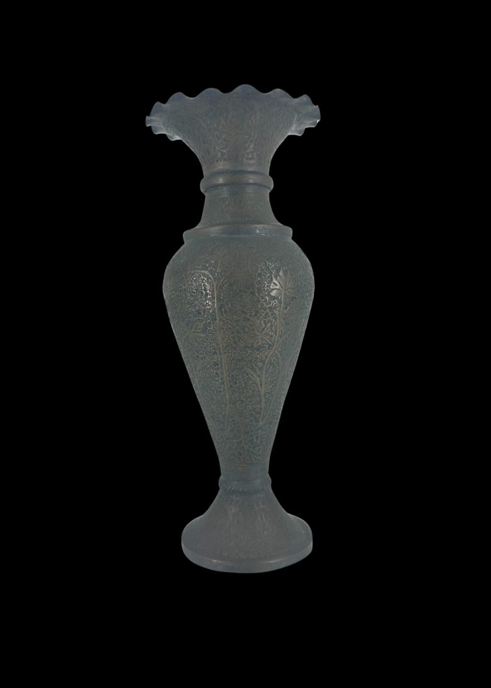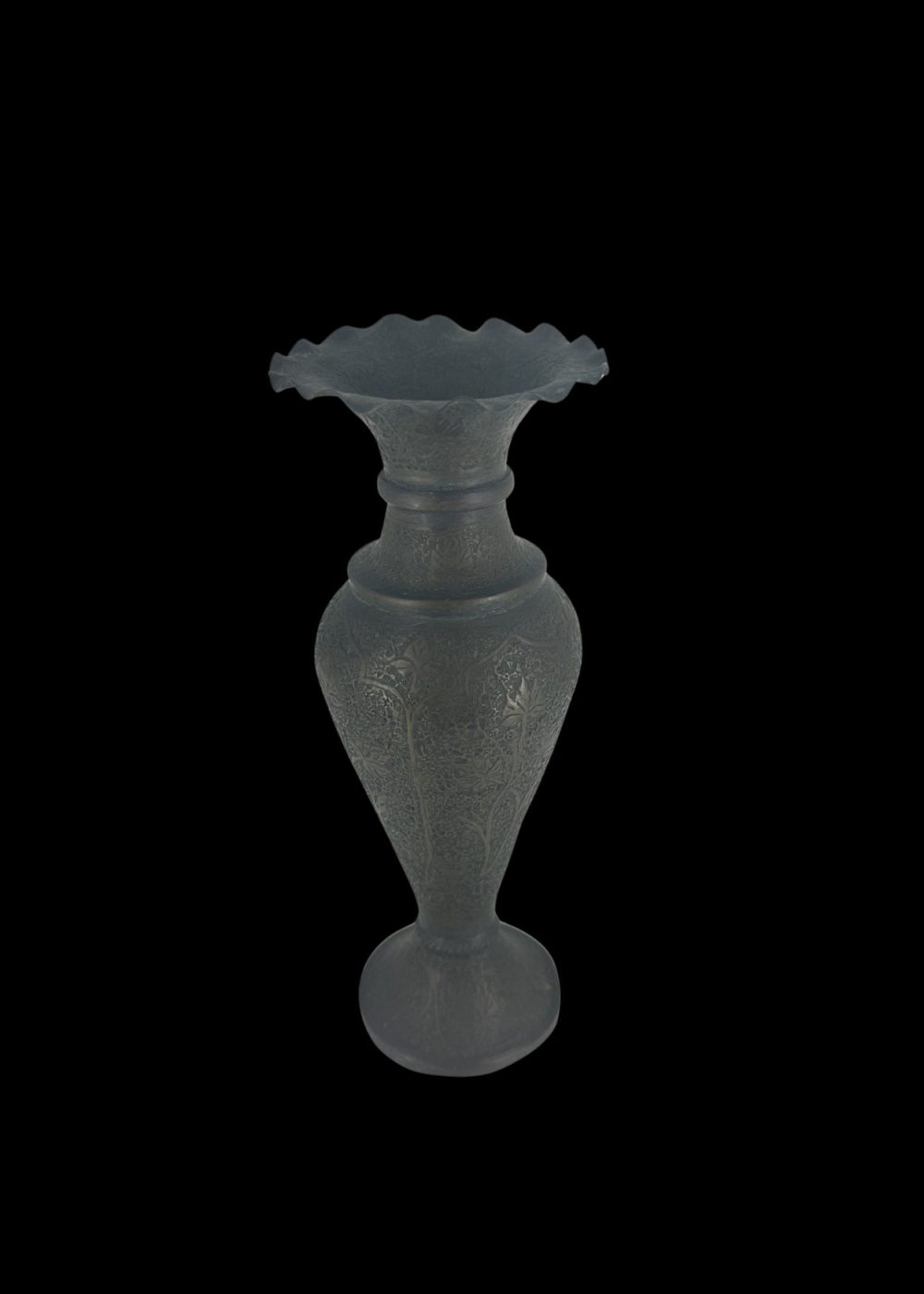 Kashmiri bronze vase features a flared rim and rounded body, embellished with incised floral scrolls and geometric bands. The repoussé-style ornamentation reflects regional design sensibilities, merging refined metalwork with botanical motifs. Likely used decoratively or ritually, the piece embodies the elegance and craftsmanship of Kashmir’s artisanal traditions.