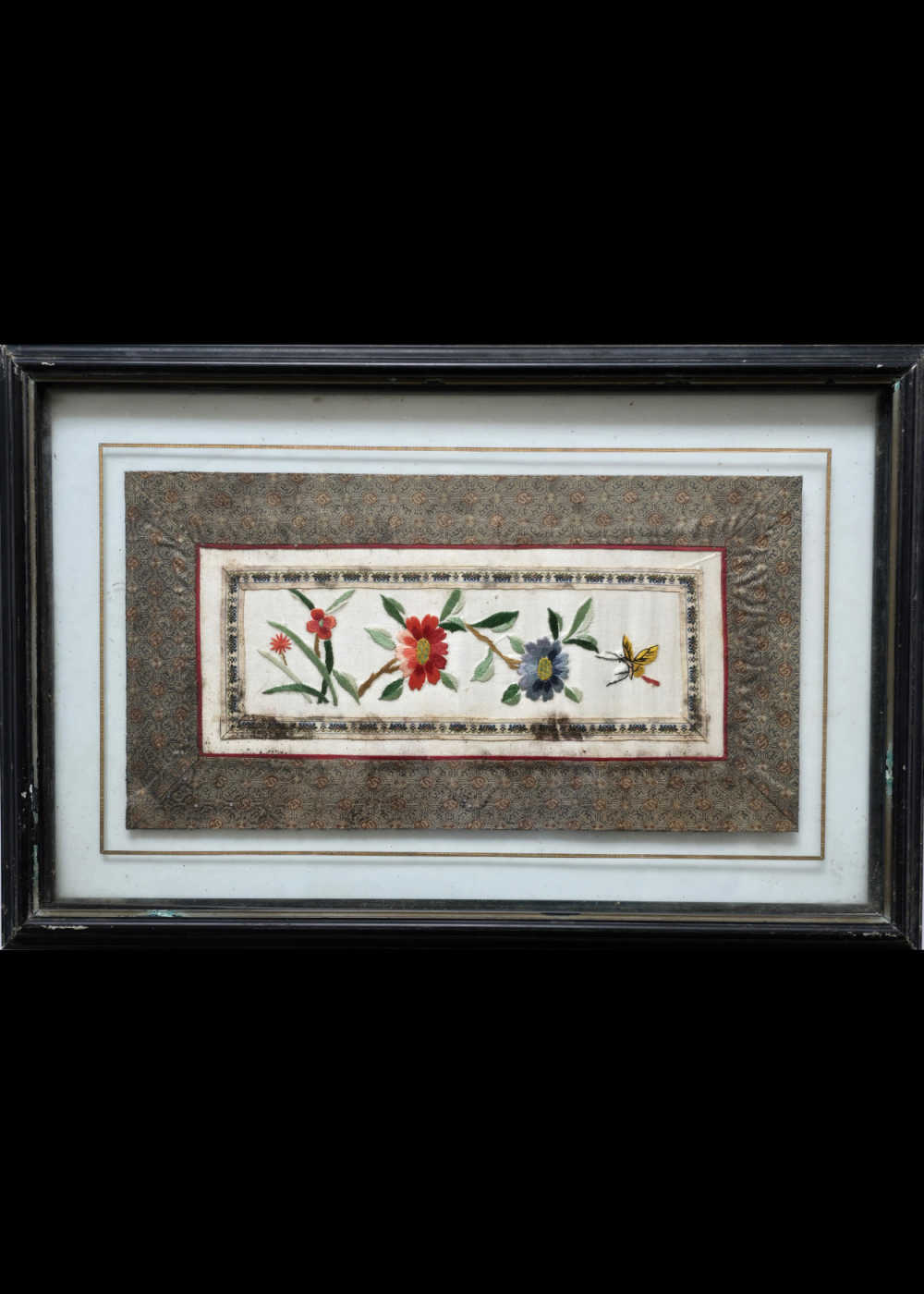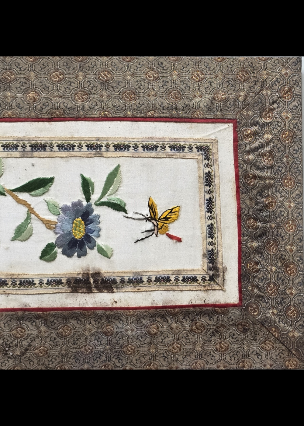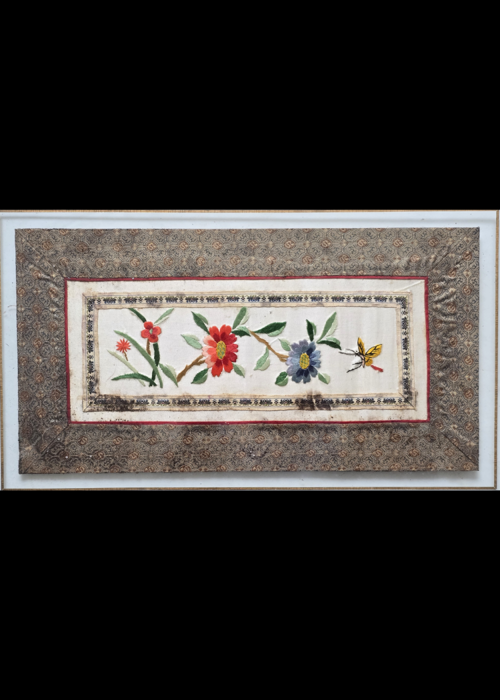 This framed textile artwork features a delicate hand-embroidered panel depicting blooming flowers in vibrant reds, blues, and greens, accompanied by a small yellow butterfly. The central design is bordered by a fine patterned frame and mounted on traditional brocade fabric, showcasing intricate detailing and cultural craftsmanship. Signs of aging and wear at the bottom edge suggest its vintage nature, adding to its charm and authenticity.