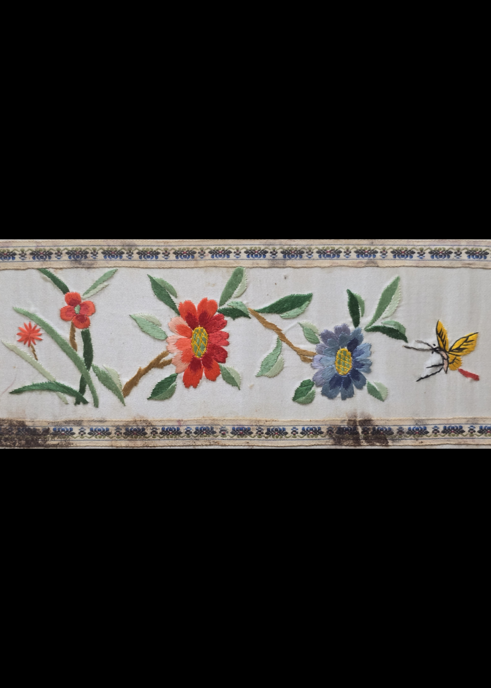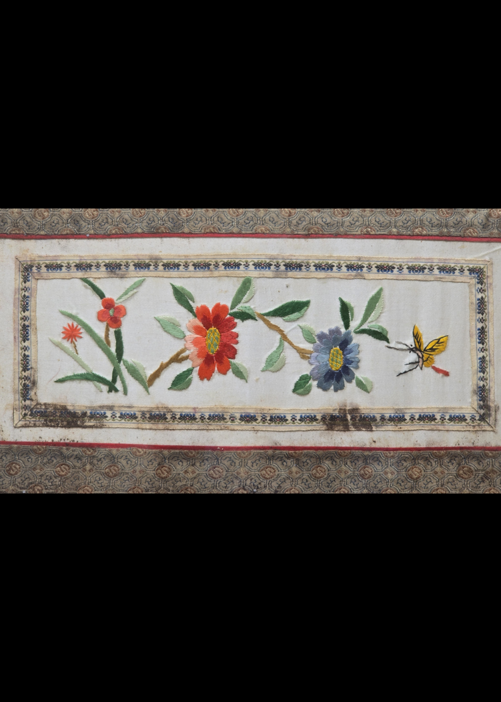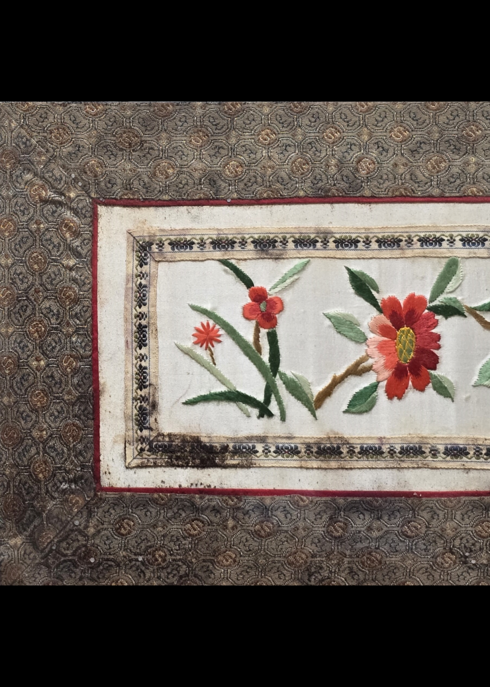 This framed textile artwork features a delicate hand-embroidered panel depicting blooming flowers in vibrant reds, blues, and greens, accompanied by a small yellow butterfly. The central design is bordered by a fine patterned frame and mounted on traditional brocade fabric, showcasing intricate detailing and cultural craftsmanship. Signs of aging and wear at the bottom edge suggest its vintage nature, adding to its charm and authenticity.