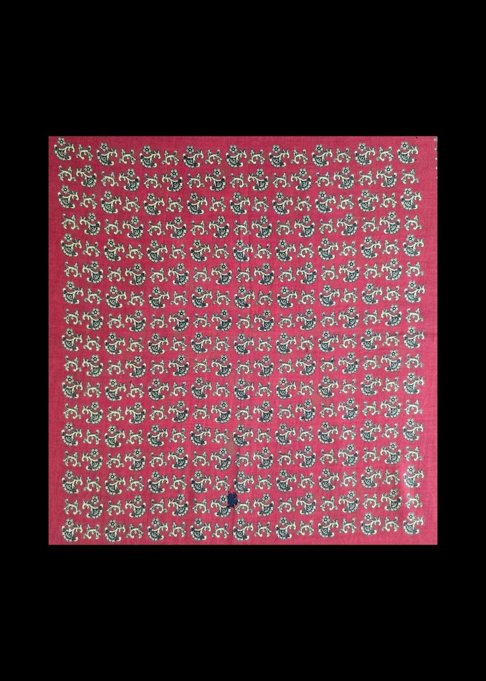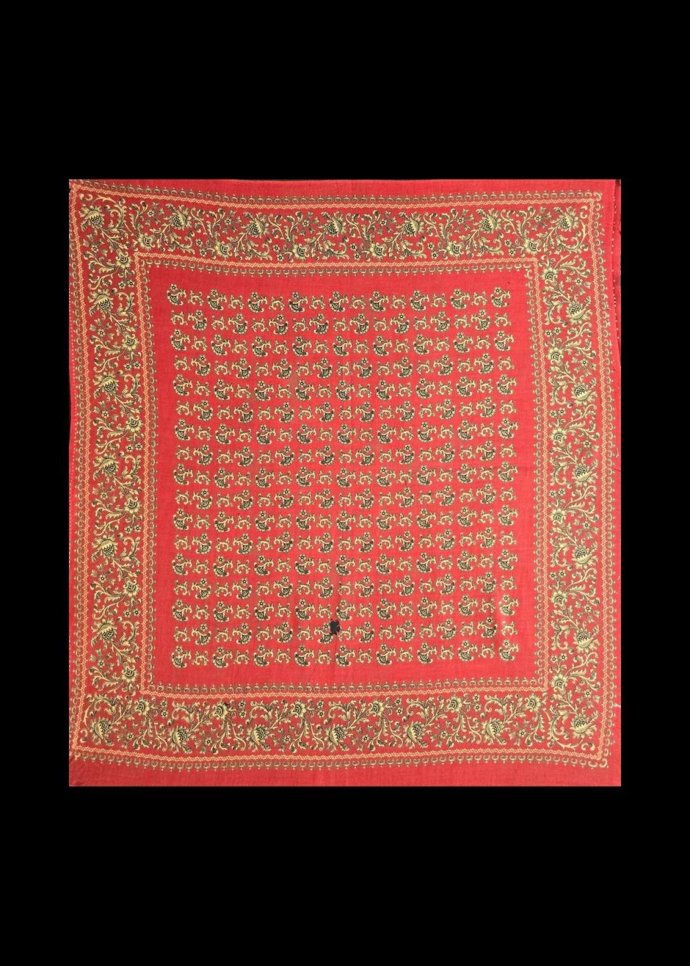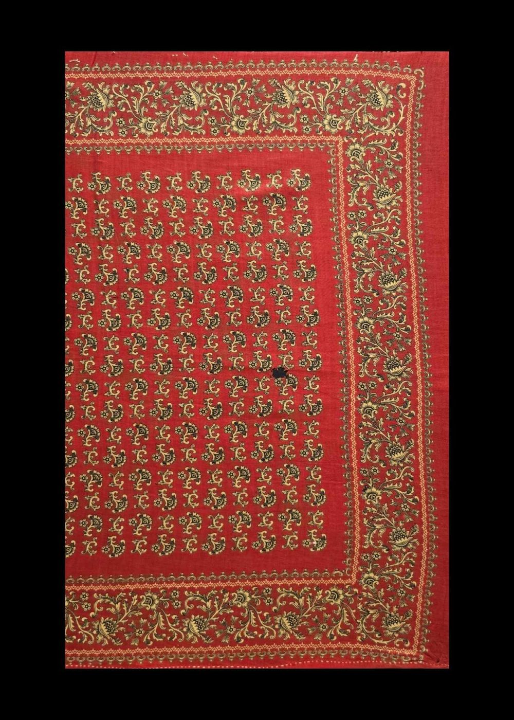This is a roller-printed chakla produced in Manchester, England, specifically for the Indian market during the late 19th to early 20th century. The cloth features a striking red background, densely patterned with small floral buta motifs arranged in a symmetrical grid. The center field is framed by an elaborate floral border, showcasing fine detail and vibrant colors—primarily yellow and black, typical of export textiles designed to suit Indian aesthetic preferences. Such textiles were widely used in households across India for ritual, decorative, and everyday purposes, and reflect the historical influence of British industrial textile production on South Asian material culture.