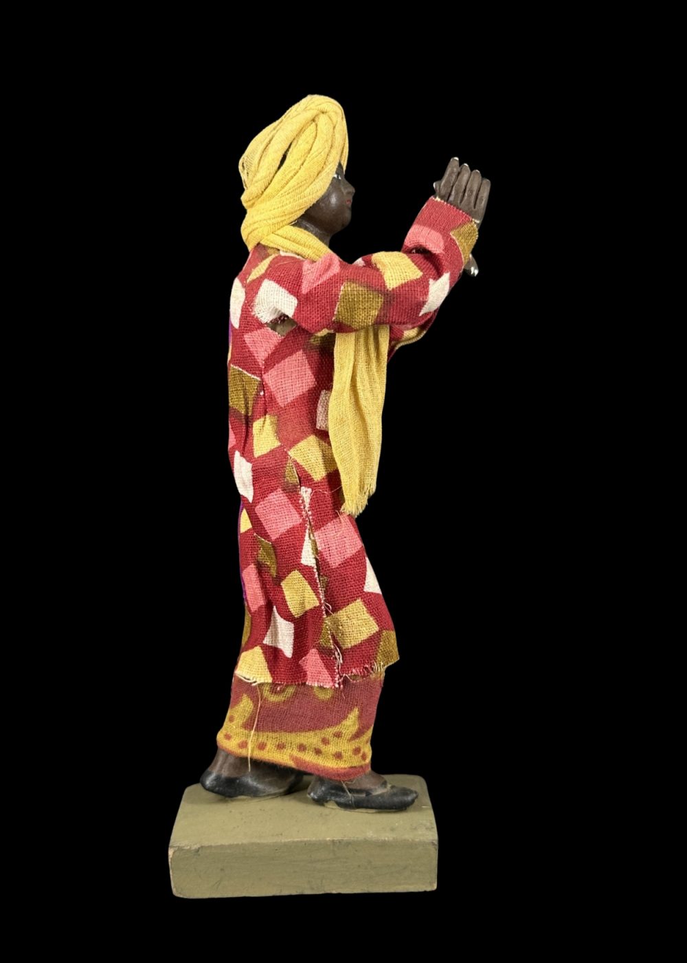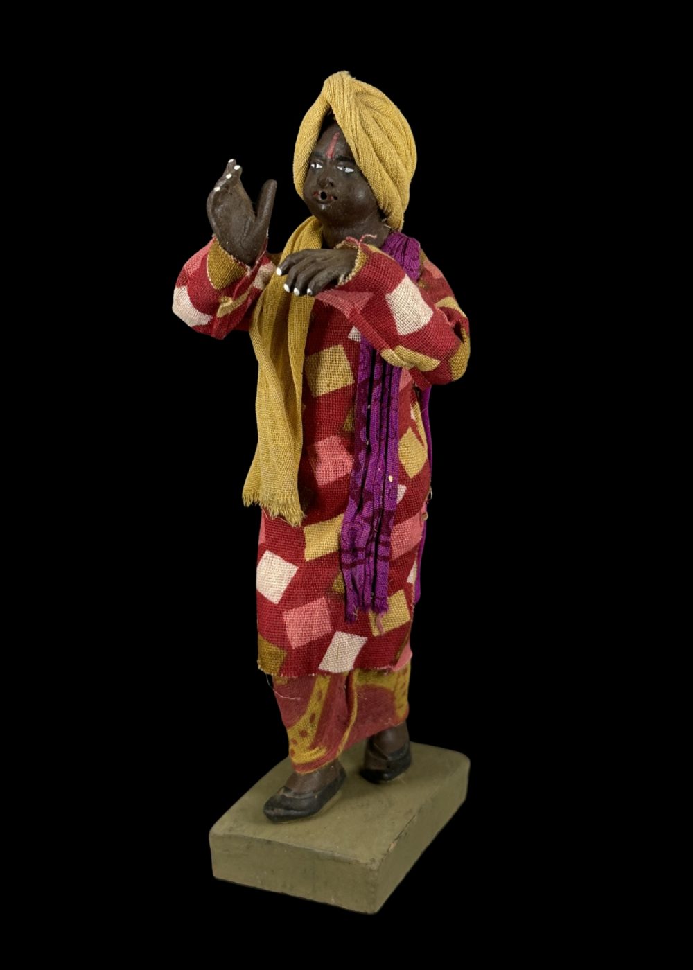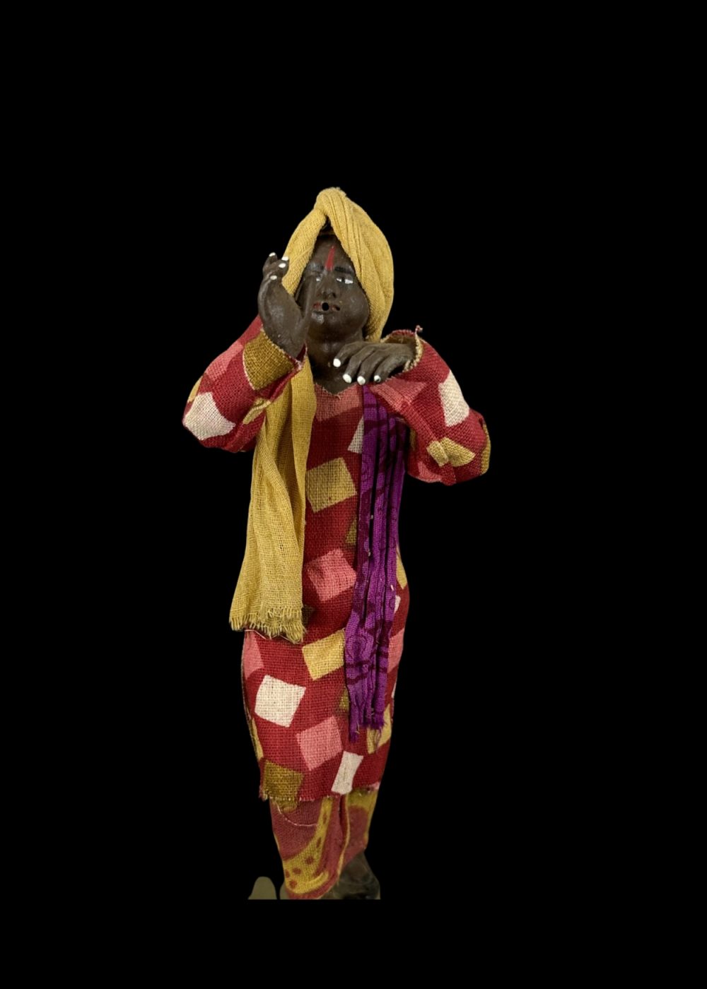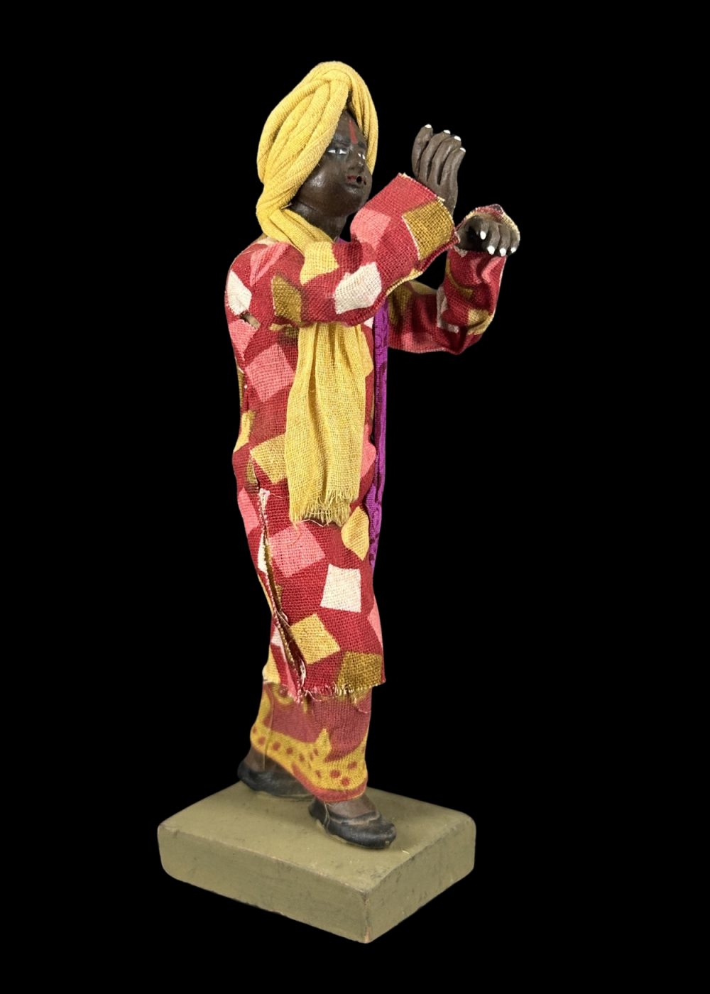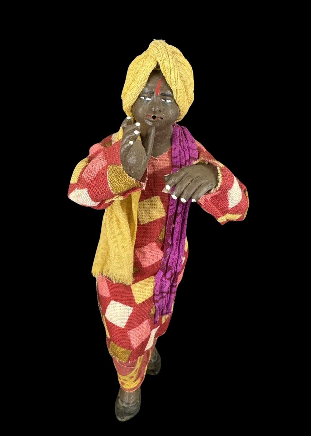This vibrant figurine showcases a folk musician dressed in a colorful patterned outfit and a yellow turban, playing a flute. The dark-toned figure, adorned with ornaments and expressive gestures, captures the essence of traditional Indian street or village performers. Representing joy, rhythm, and cultural expression, the figurine reflects the integral role of music in rural festivities, storytelling, and devotional life. The pose and attire highlight the diversity and vibrancy of regional Indian traditions.