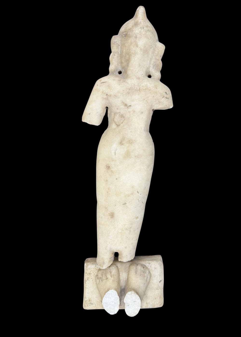 This weathered marble statue depicts a standing human figure, now missing both arms and showing signs of age through softened contours and worn facial features. The subject wears a simple draped garment that descends to the feet, anchoring the composition in classical sculptural traditions. Elevated on a rectangular base, the figure’s balanced stance and minimal attire suggest a ceremonial or commemorative origin, possibly linked to ancient religious or civic art.