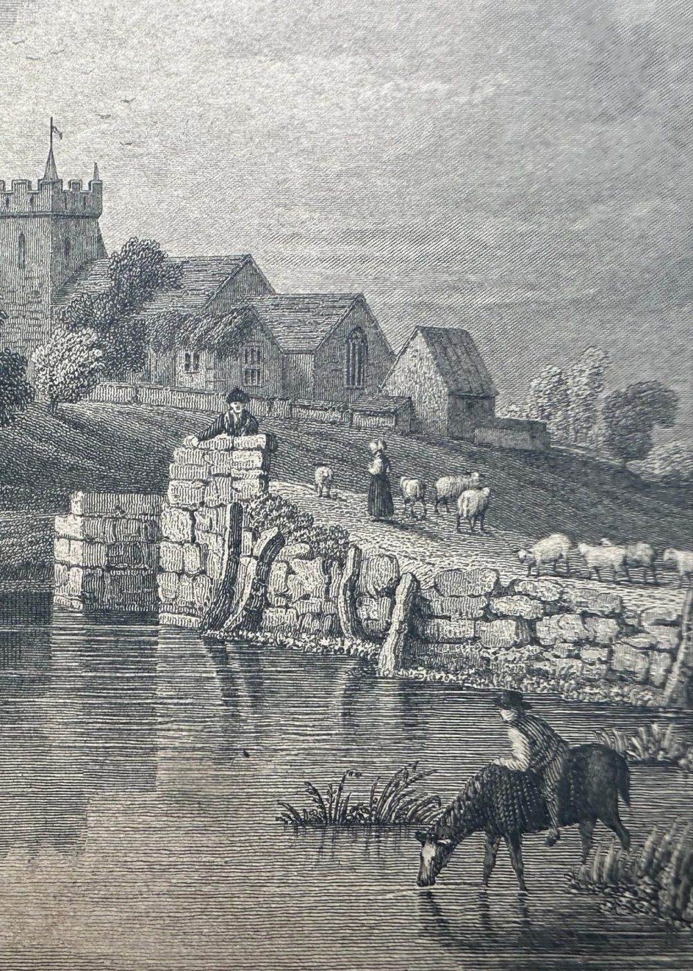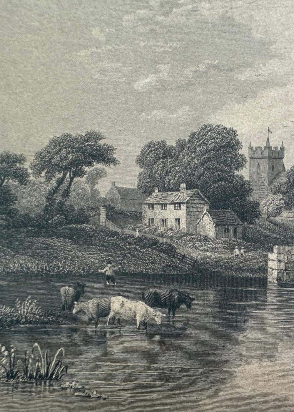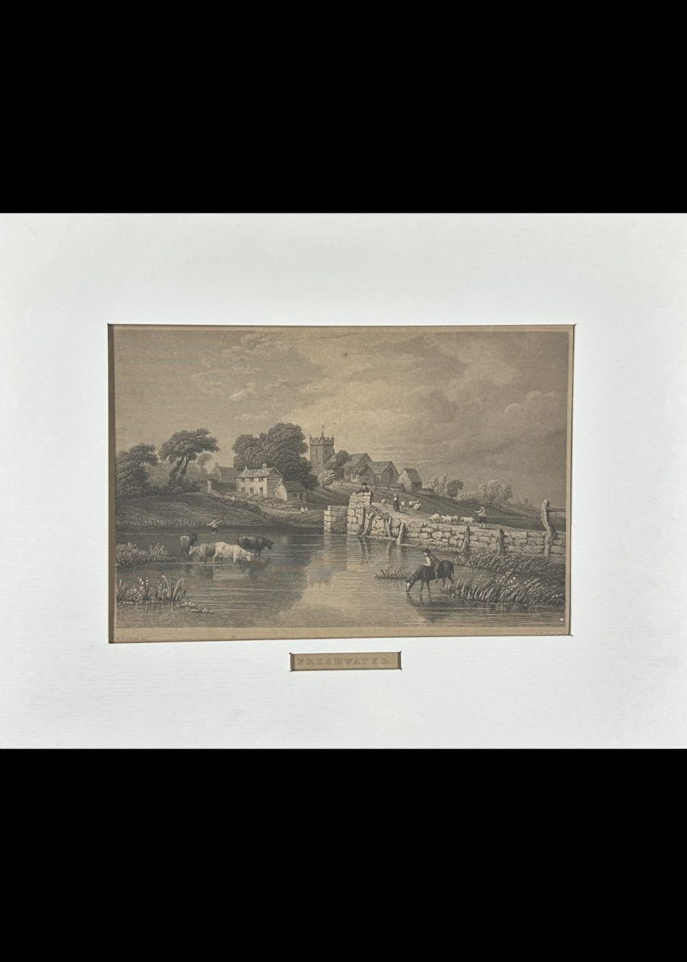 This vintage engraved illustration titled “Freshwater” depicts a serene pastoral scene of the village of Freshwater, located on the western tip of the Isle of Wight. The composition is centered around a gently flowing river or stream, where cattle wade peacefully and a rider on horseback crosses the shallow waters. A stone bridge, partially in ruins or under repair, spans the stream, guiding the viewer’s eye toward the heart of the village beyond. Clustered cottages with thatched and tiled roofs nestle among leafy trees, while the square tower of a church rises prominently in the background, indicating the village’s spiritual and communal center. Figures dot the landscape—some tending sheep, others simply strolling—conveying a sense of rural calm and community life. The gentle hills and soft clouded sky enhance the idyllic atmosphere. This engraving beautifully captures the timeless charm and agrarian simplicity of Freshwater in the 19th century, emphasizing harmony between people, livestock, and the landscape.