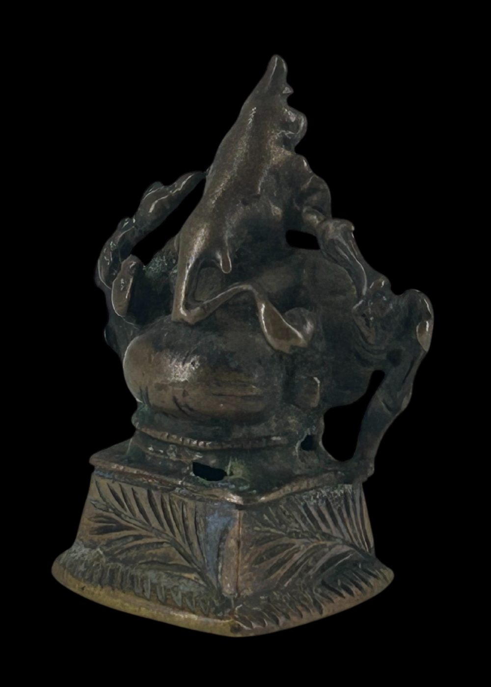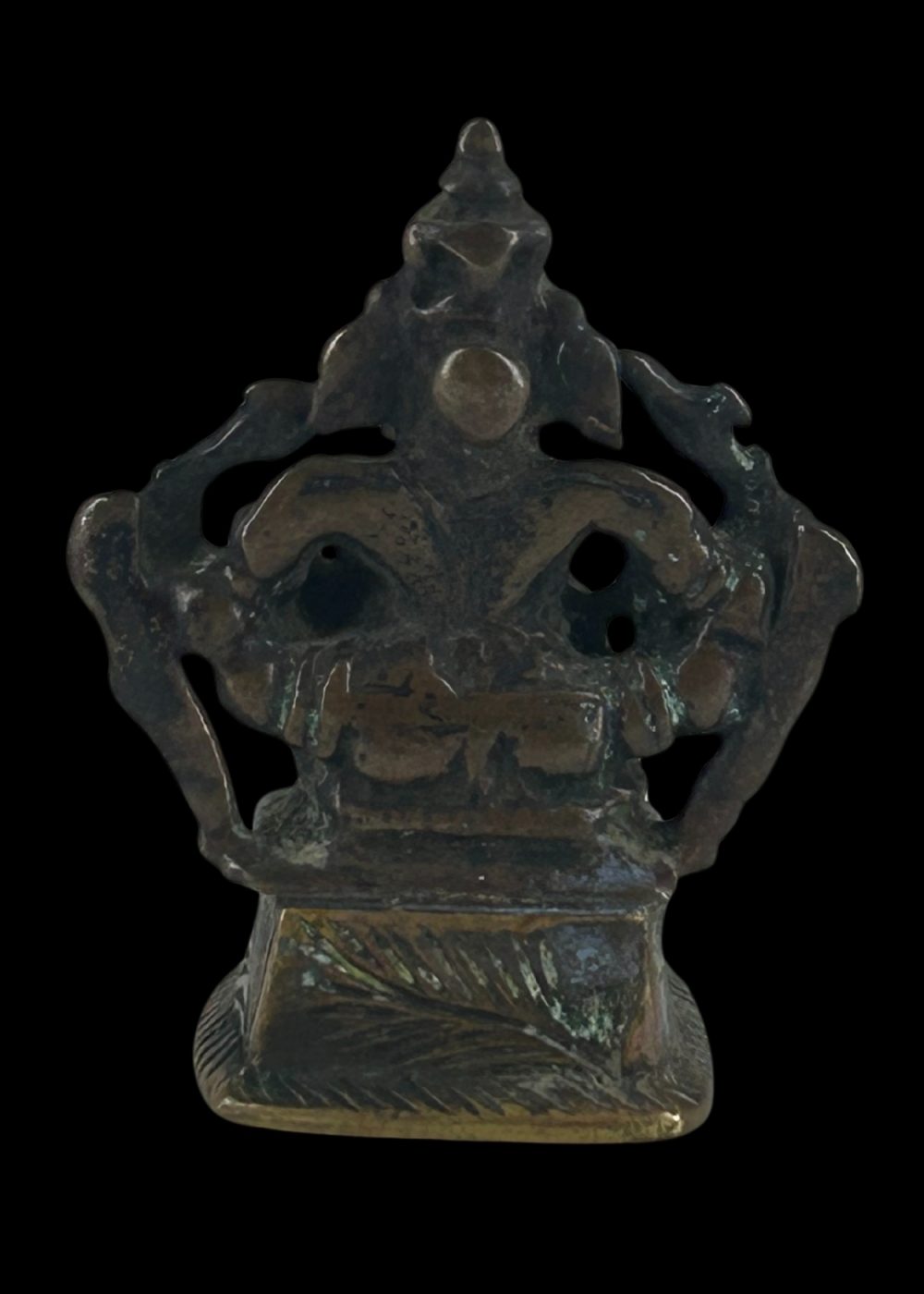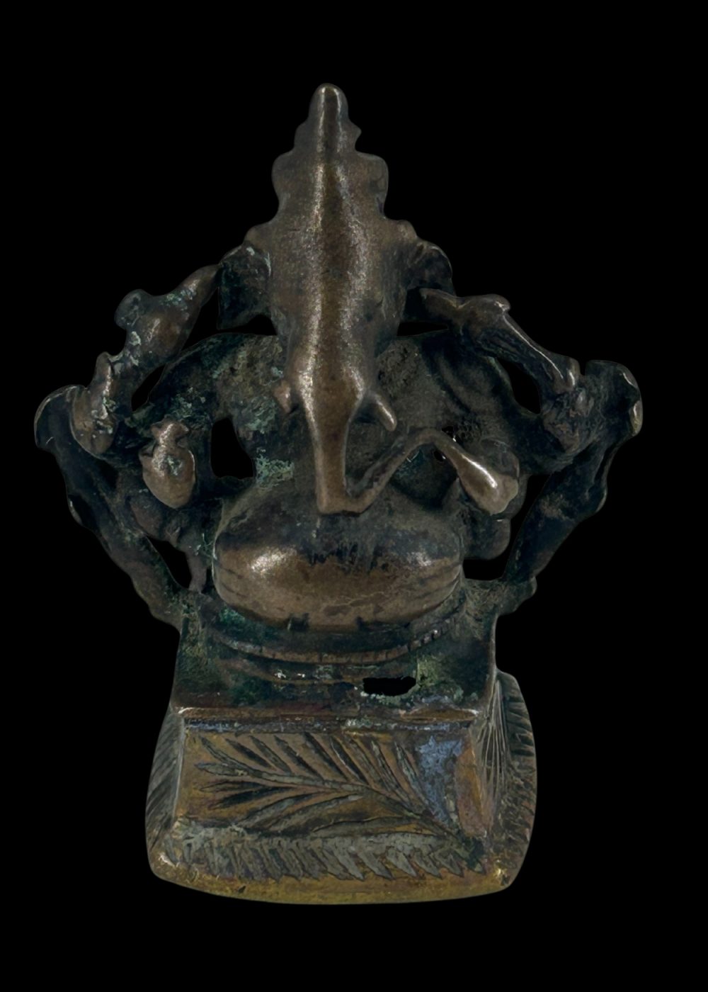 This is a small bronze or brass statue of Lord Ganesha, viewed from the back. The figure is seated on a rounded platform atop a decorated square base, which features engraved leaf motifs. Ganesha’s characteristic elephant head and curved trunk are clearly visible from this angle, along with multiple arms extending outward, each holding symbolic objects. The back view reveals intricate craftsmanship in the detailing of the arms and the ornamental frame encircling the deity. The patina and discoloration suggest the piece is aged, possibly a traditional artifact used in worship or ritual settings.