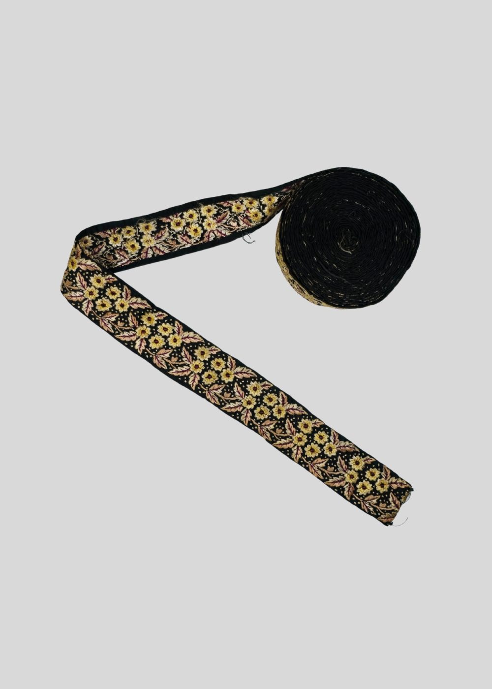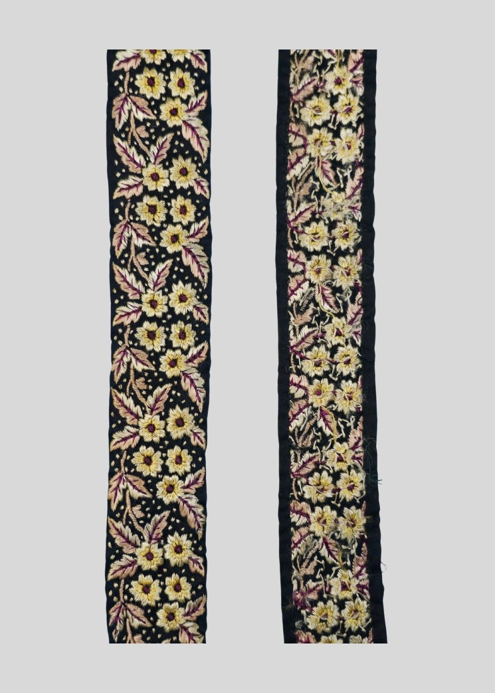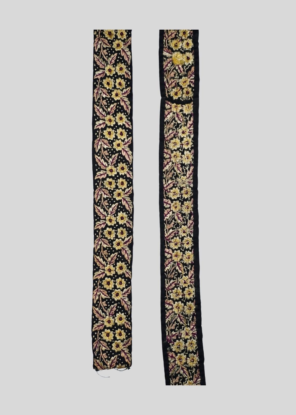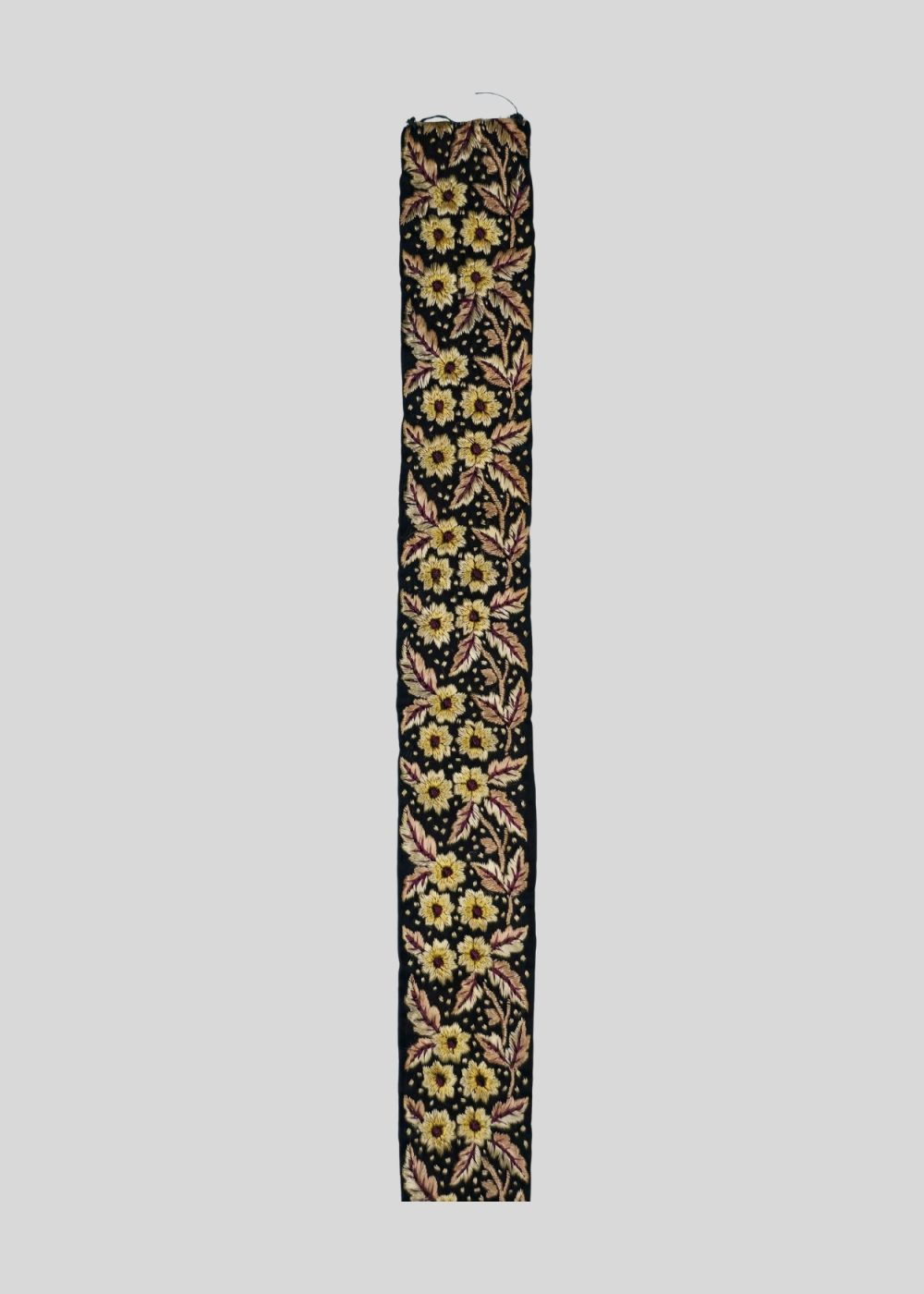This elegant Gara saree border roll features intricate hand embroidery on a rich black base, showcasing traditional floral motifs in shades of cream, gold, and muted pink. Inspired by classic Parsi Gara craftsmanship, the detailed stitching and fine patterns reflect timeless sophistication. Perfect for elevating sarees, dupattas, or ethnic ensembles, this border roll brings a luxurious and heritage-inspired finish to any garment.