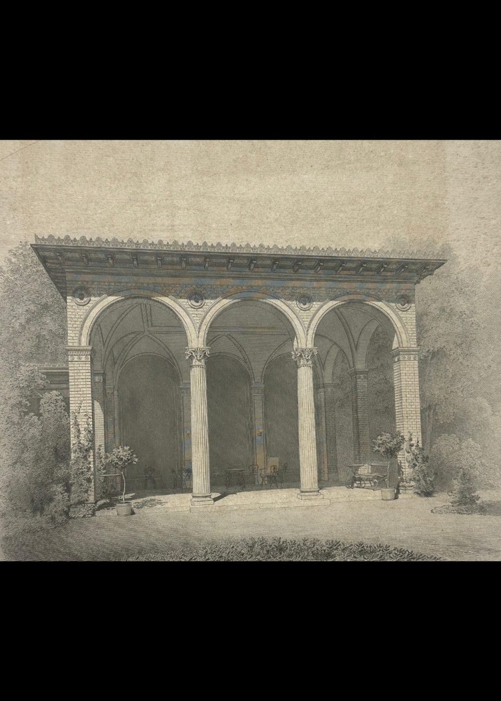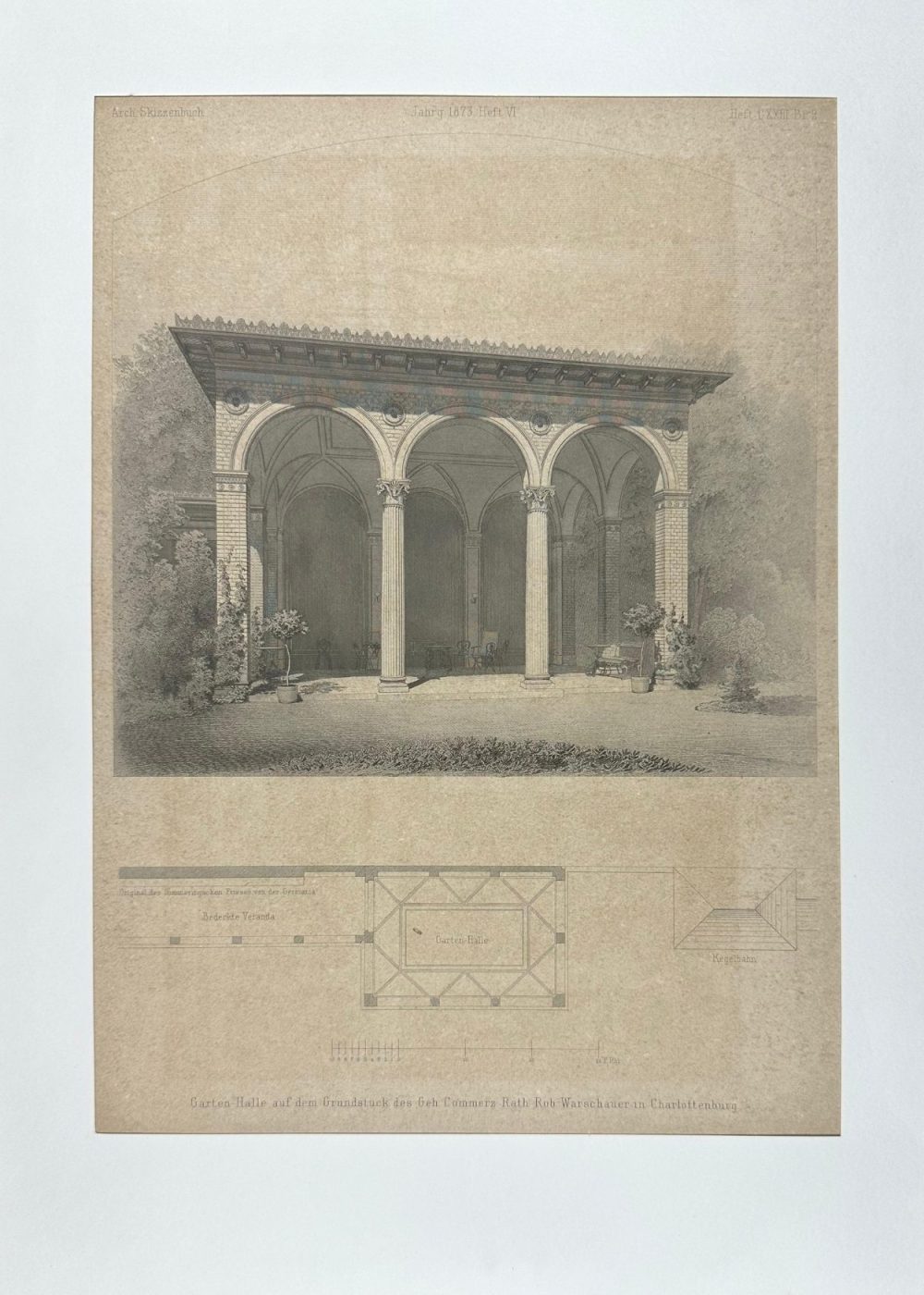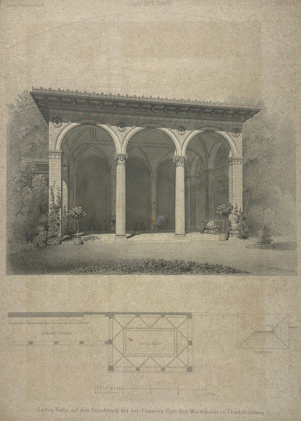 This 1873 lithograph illustrates a classical garden hall located on the estate of Councillor Rob. Warschauer in Charlottenburg, Germany. The elegant open structure features rounded arches supported by Corinthian columns and a richly decorated coffered ceiling, embodying Italian Renaissance influence. Below the perspective view is a detailed architectural floor plan, showing the layout of the garden hall and adjoining spaces such as the covered veranda and bowling alley (Kegelbahn). The artwork captures the refined leisure architecture of 19th-century German aristocratic estates.