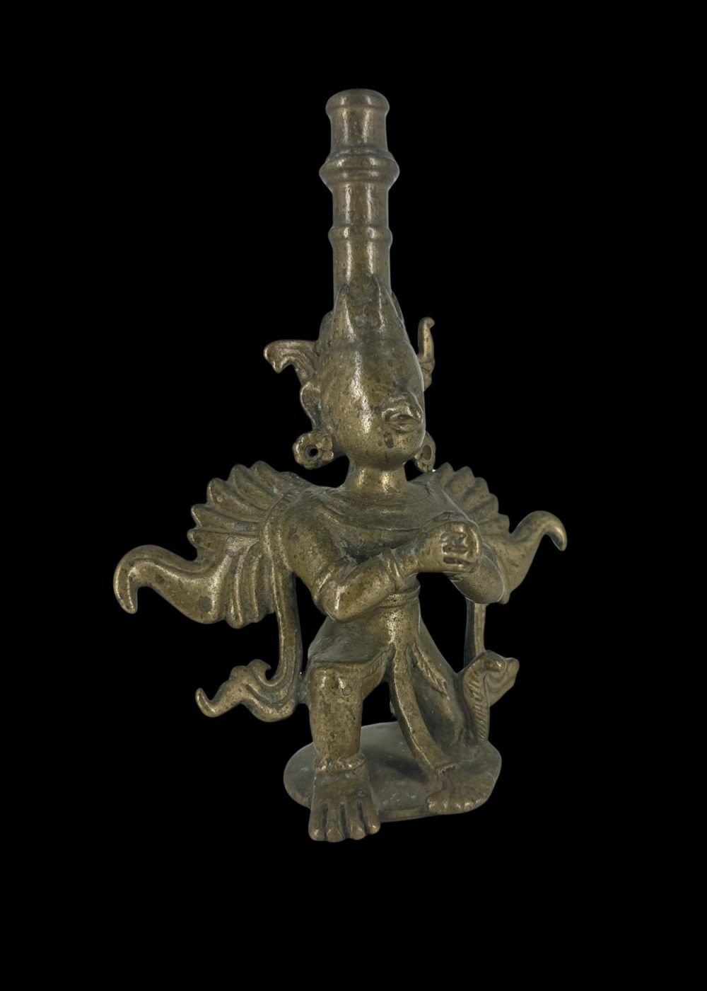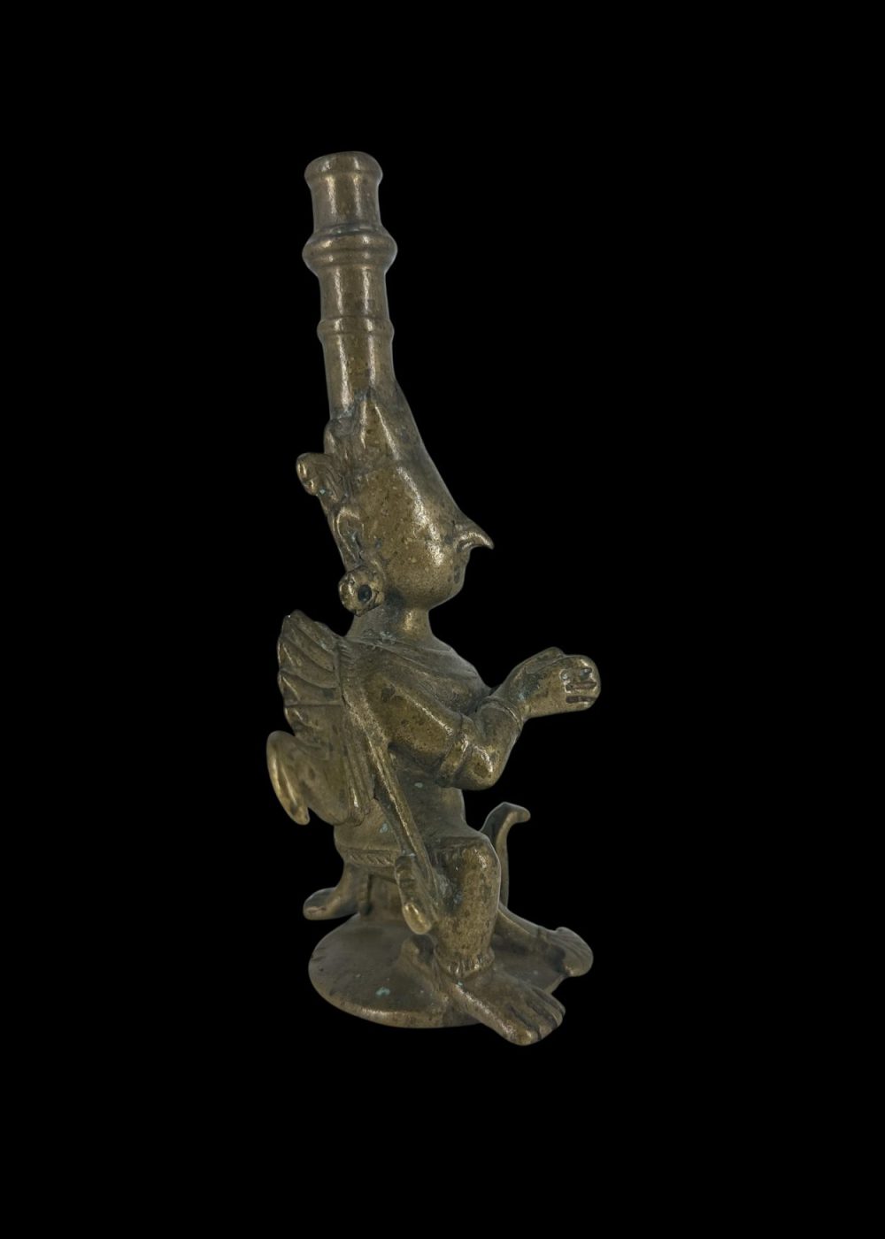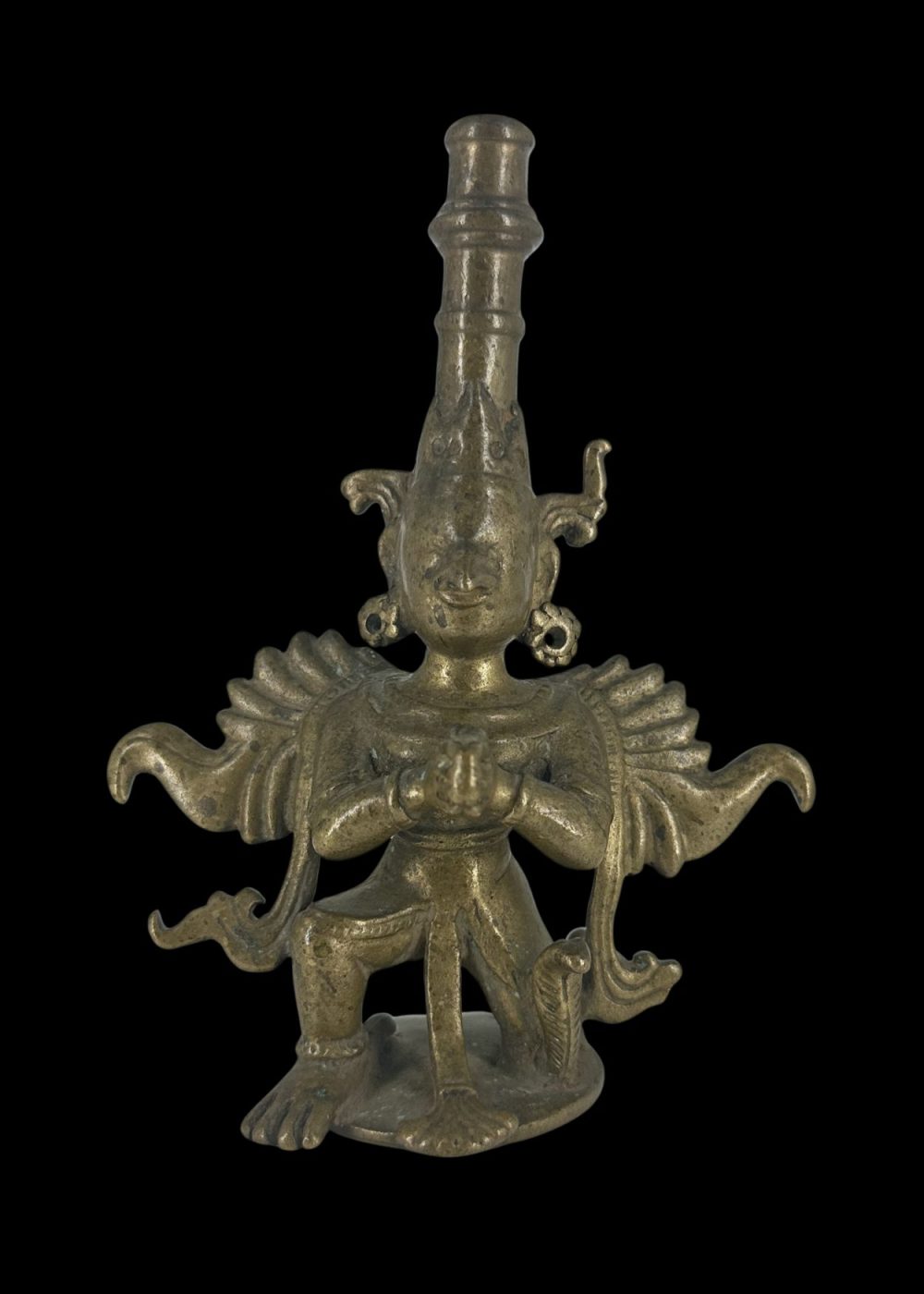 Bronze sculpture of Garuda, the divine bird and mount of Vishnu, depicted in a kneeling posture with hands clasped in anjali mudra (gesture of reverence). The figure combines avian and human features—broad wings, feathered headdress, and taloned feet—with a serene, human-like face. Intricate detailing on the wings and head suggests ceremonial use, likely within Hindu or Buddhist ritual contexts. Originating from Nepal or Tibet, this piece reflects the martial symbolism and protective role Garuda holds in mythology, especially as the eternal enemy of serpents.
