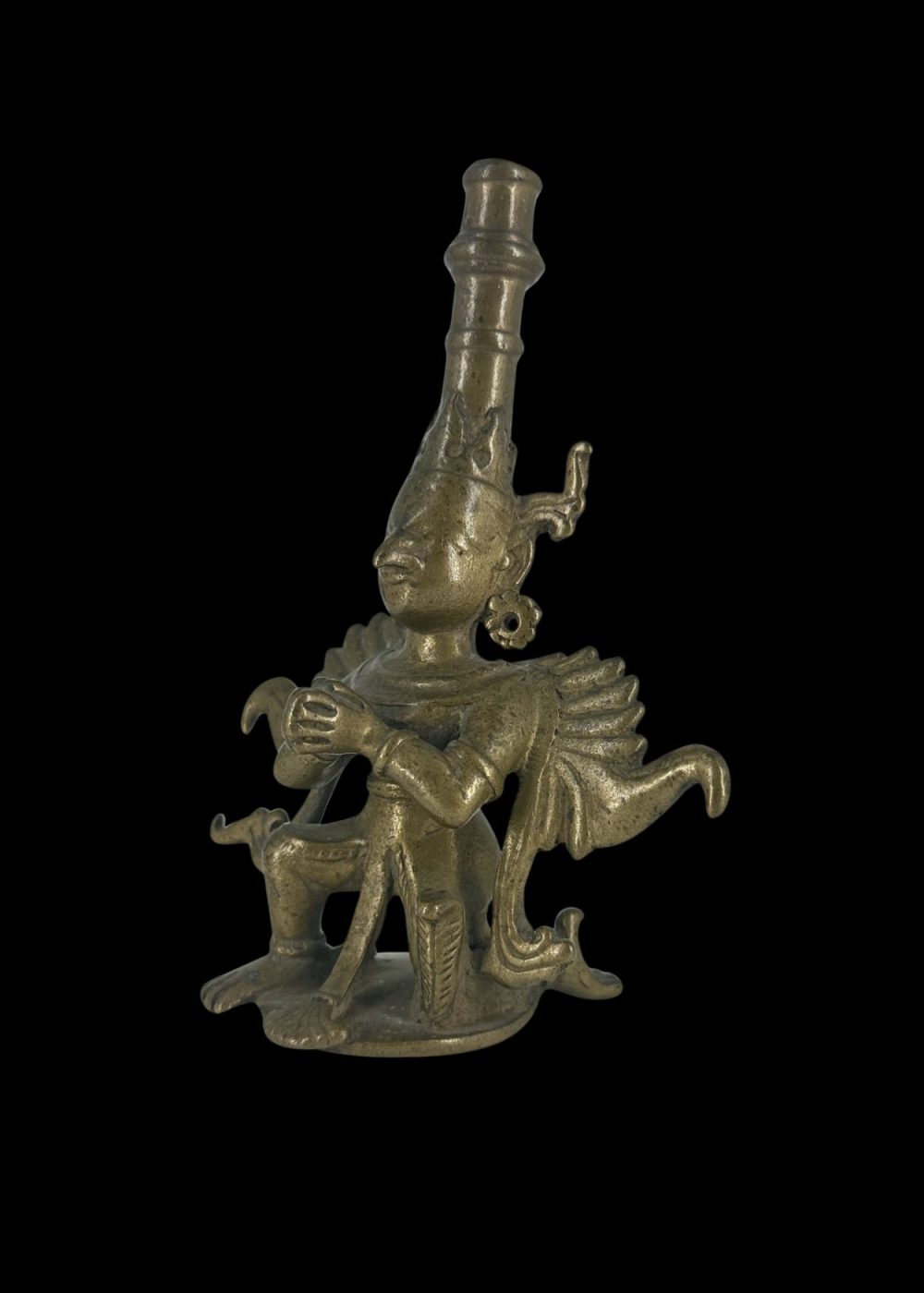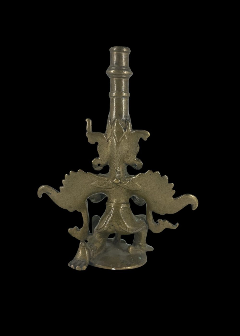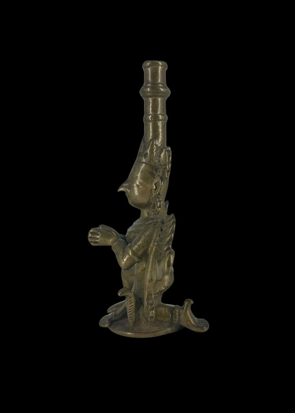 Bronze sculpture of Garuda, the divine bird and mount of Vishnu, depicted in a kneeling posture with hands clasped in anjali mudra (gesture of reverence). The figure combines avian and human features—broad wings, feathered headdress, and taloned feet—with a serene, human-like face. Intricate detailing on the wings and head suggests ceremonial use, likely within Hindu or Buddhist ritual contexts. Originating from Nepal or Tibet, this piece reflects the martial symbolism and protective role Garuda holds in mythology, especially as the eternal enemy of serpents.