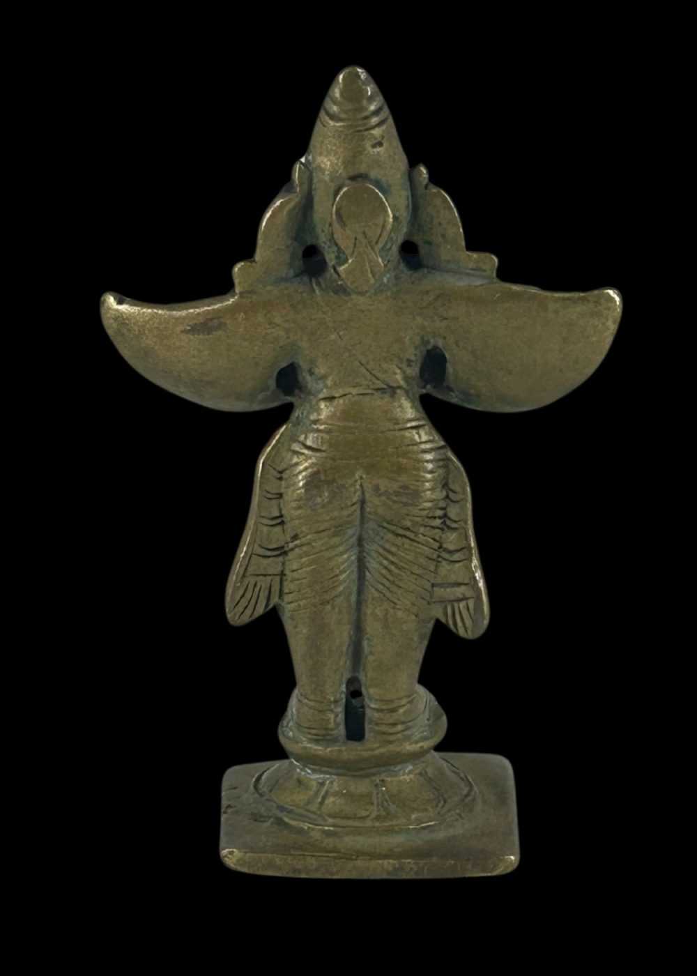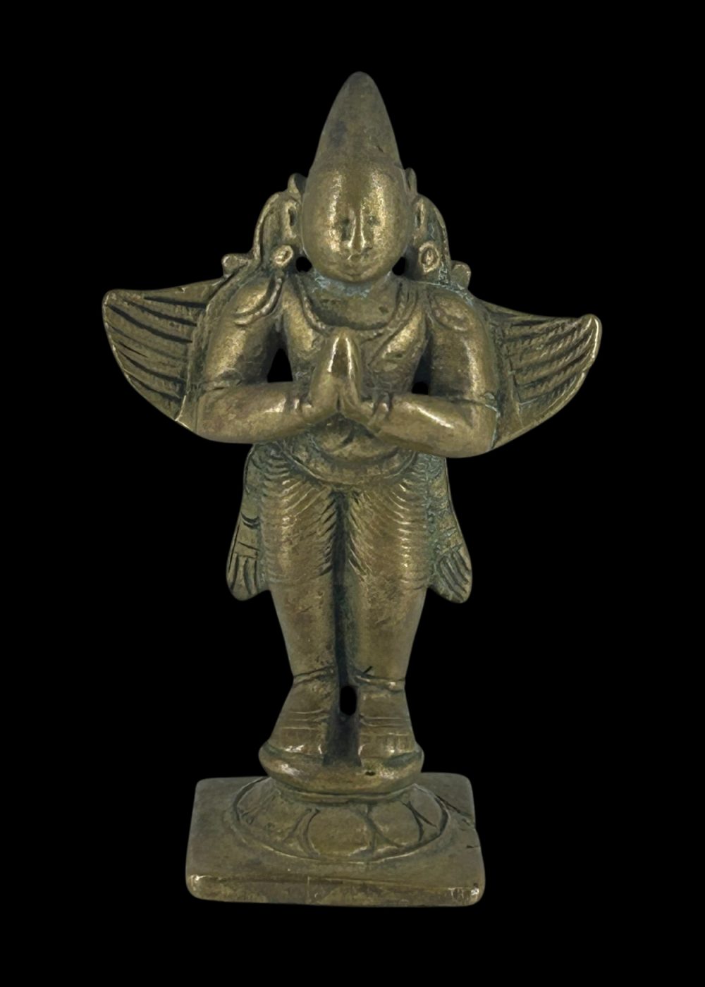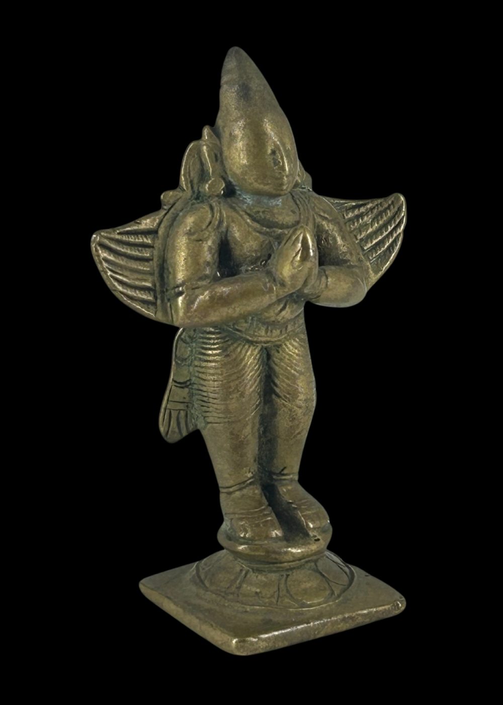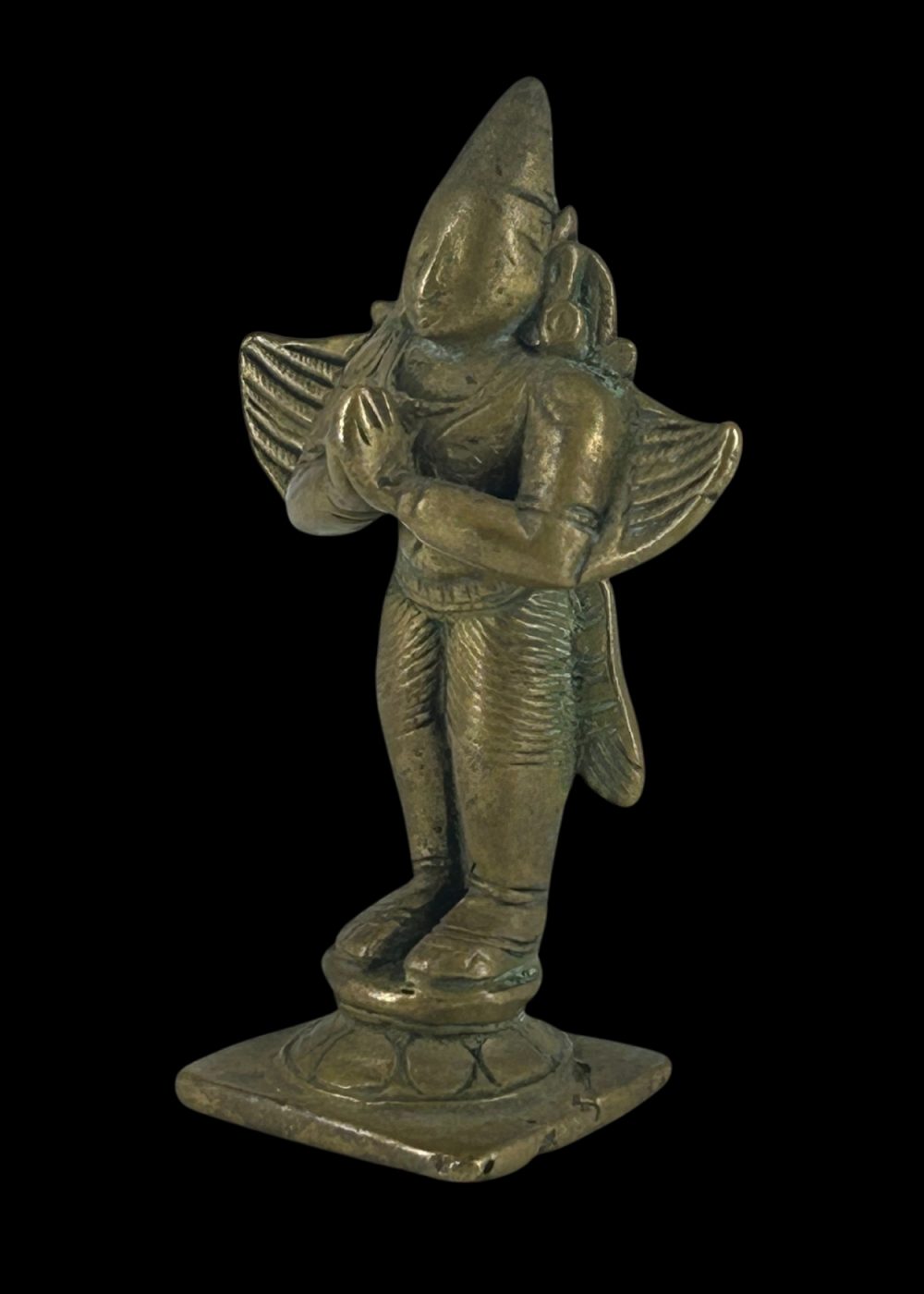 This image shows a finely cast bronze figure of Garuda, the divine mount of Lord Vishnu. The figure is depicted standing with wings outstretched and hands joined in anjali mudra (gesture of reverence). He wears a tall conical headdress and simple ornaments, standing firmly on a square pedestal. The smooth surface and golden-brown patina highlight its ritual use, making it a devotional object used in temple or household worship in South India.