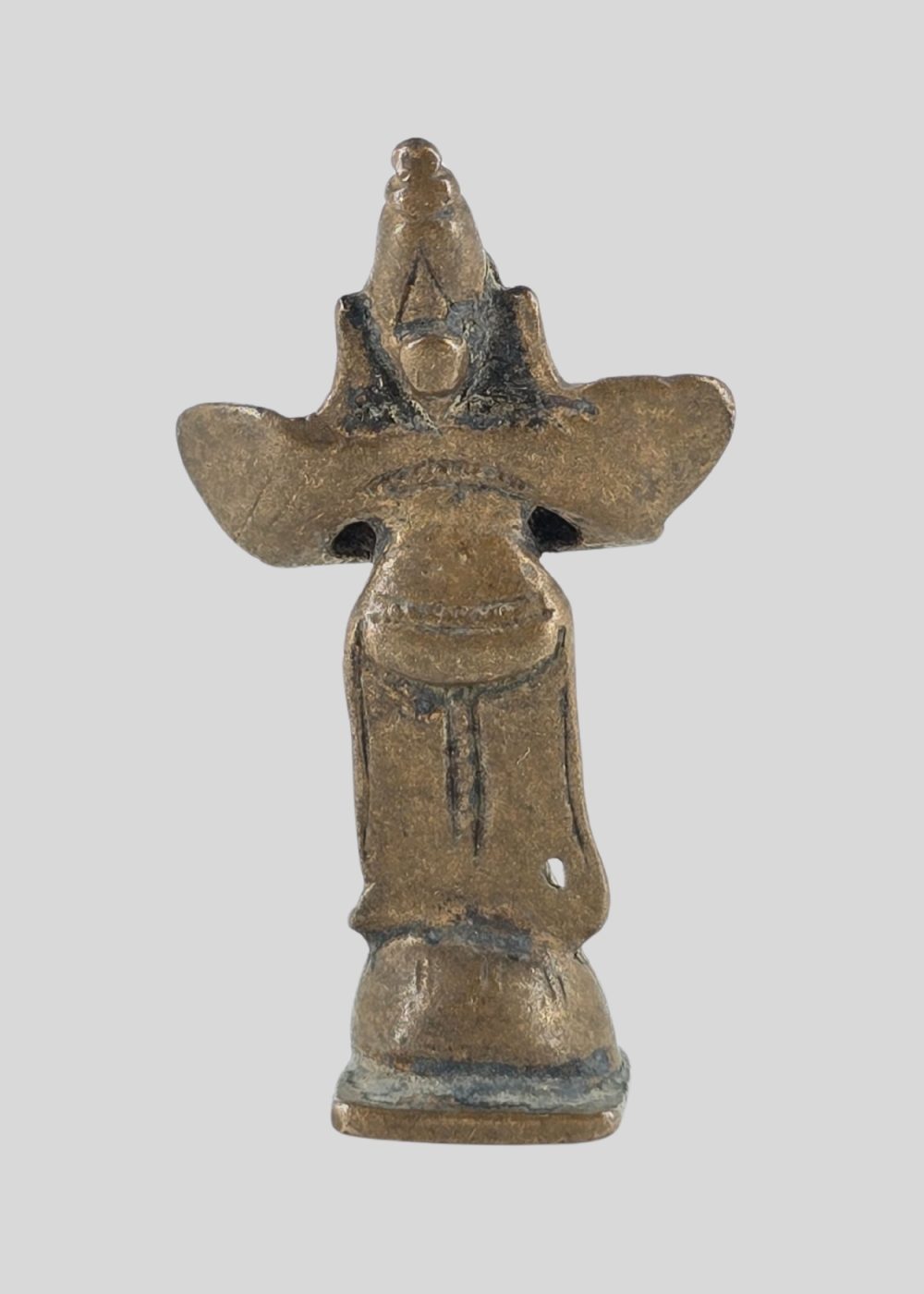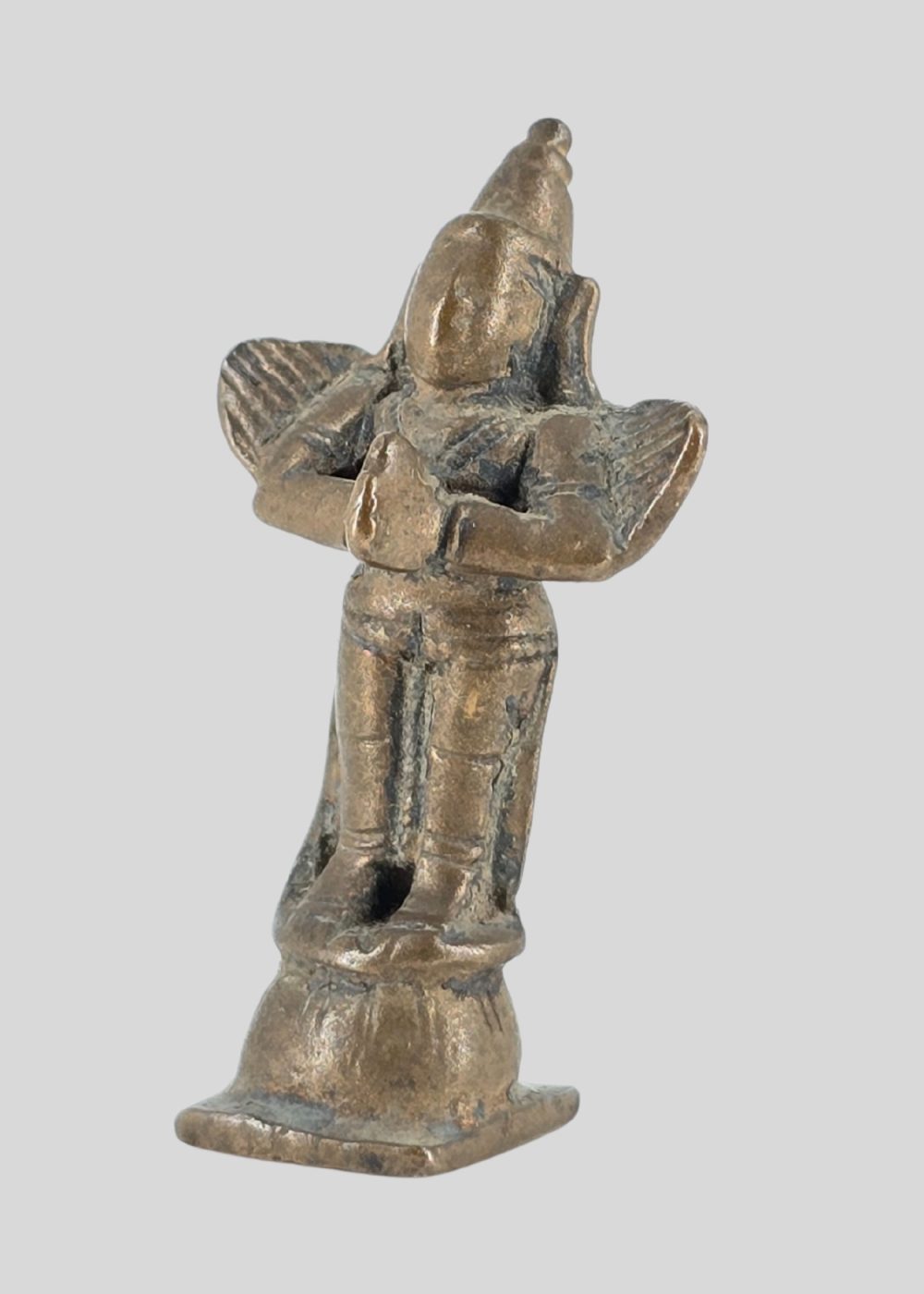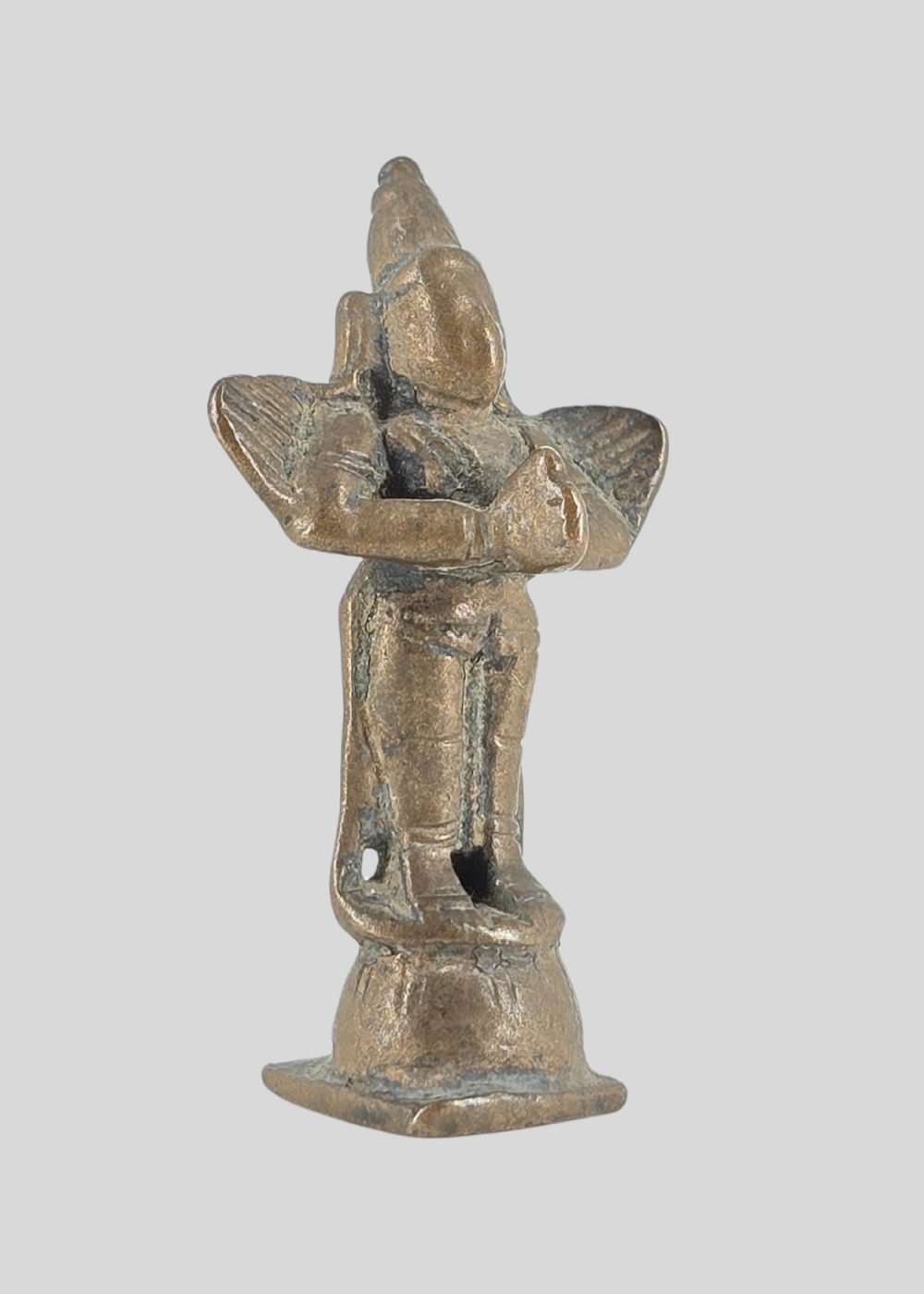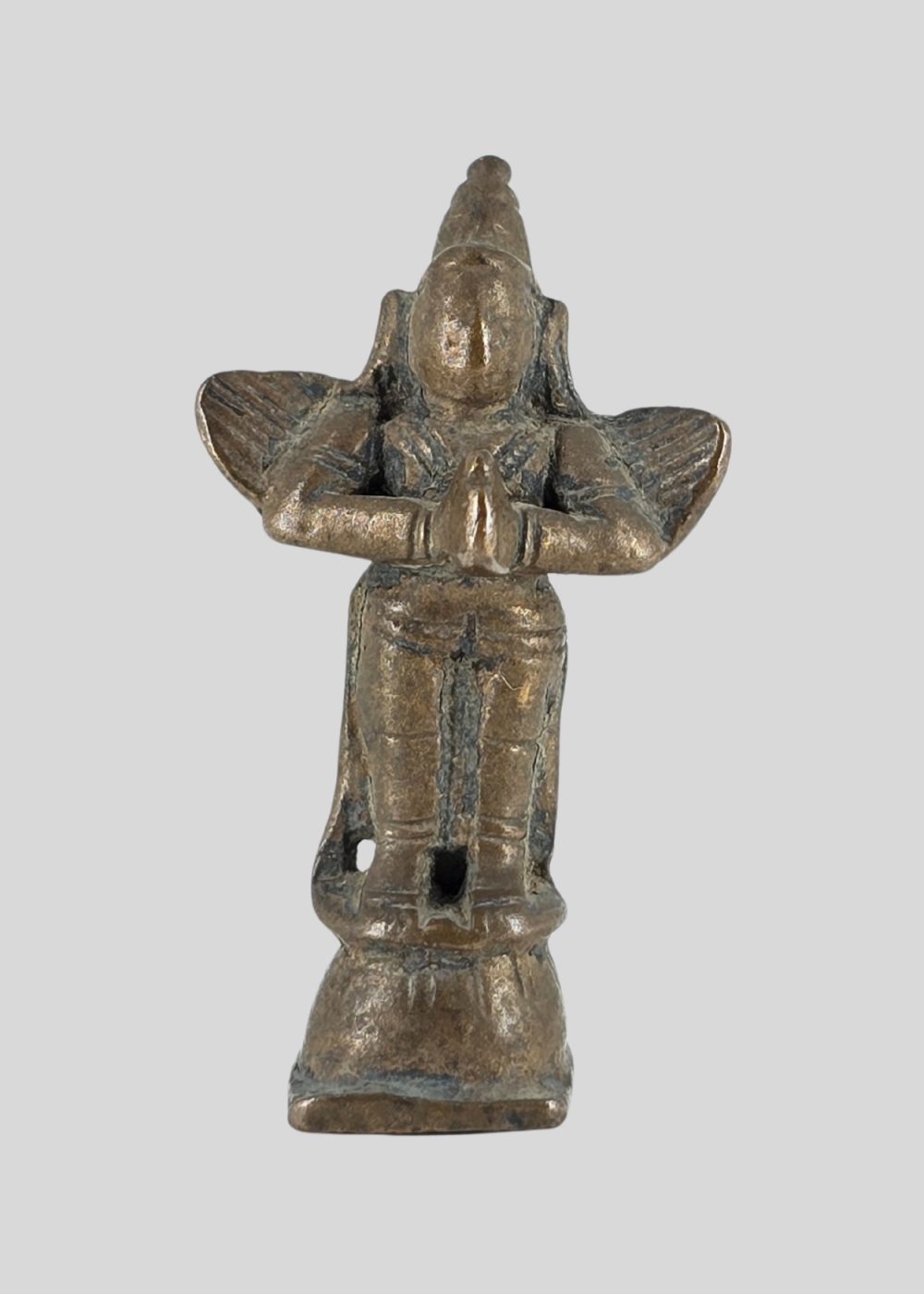 This bronze figure from Tamil Nadu, represents Garuda, the divine mount of Lord Vishnu. Depicted with folded hands in anjali mudra, the figure embodies devotion and humility. The wings extending from the shoulders highlight Garuda’s celestial nature, while the simple yet graceful form reflects the South Indian bronze casting tradition. Such images were often part of temple processions and household worship, symbolizing protection and divine service.