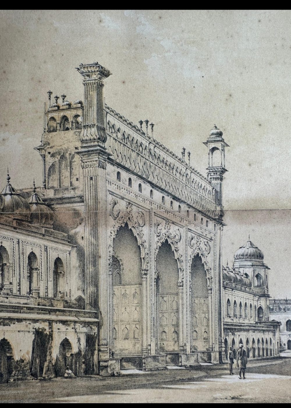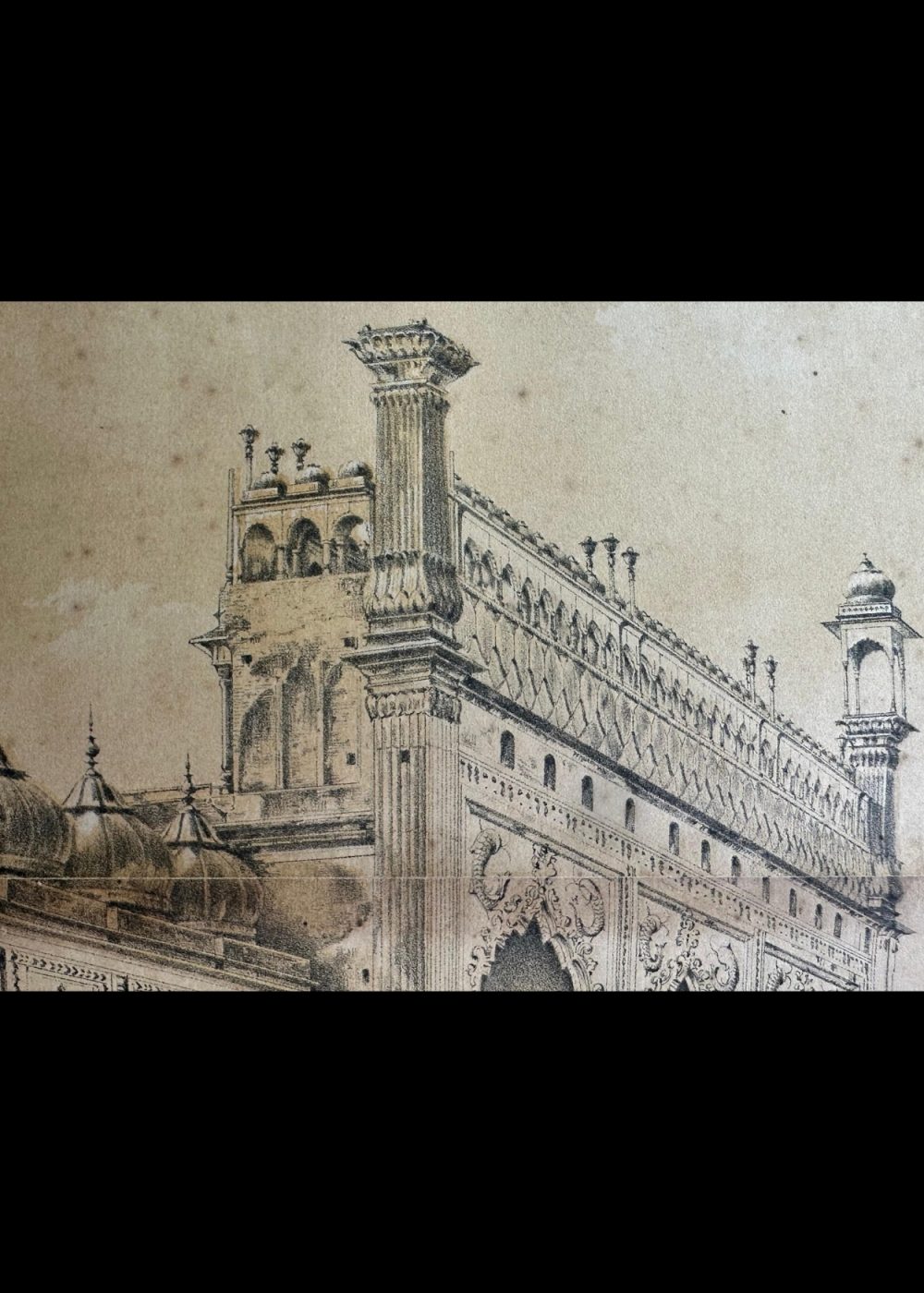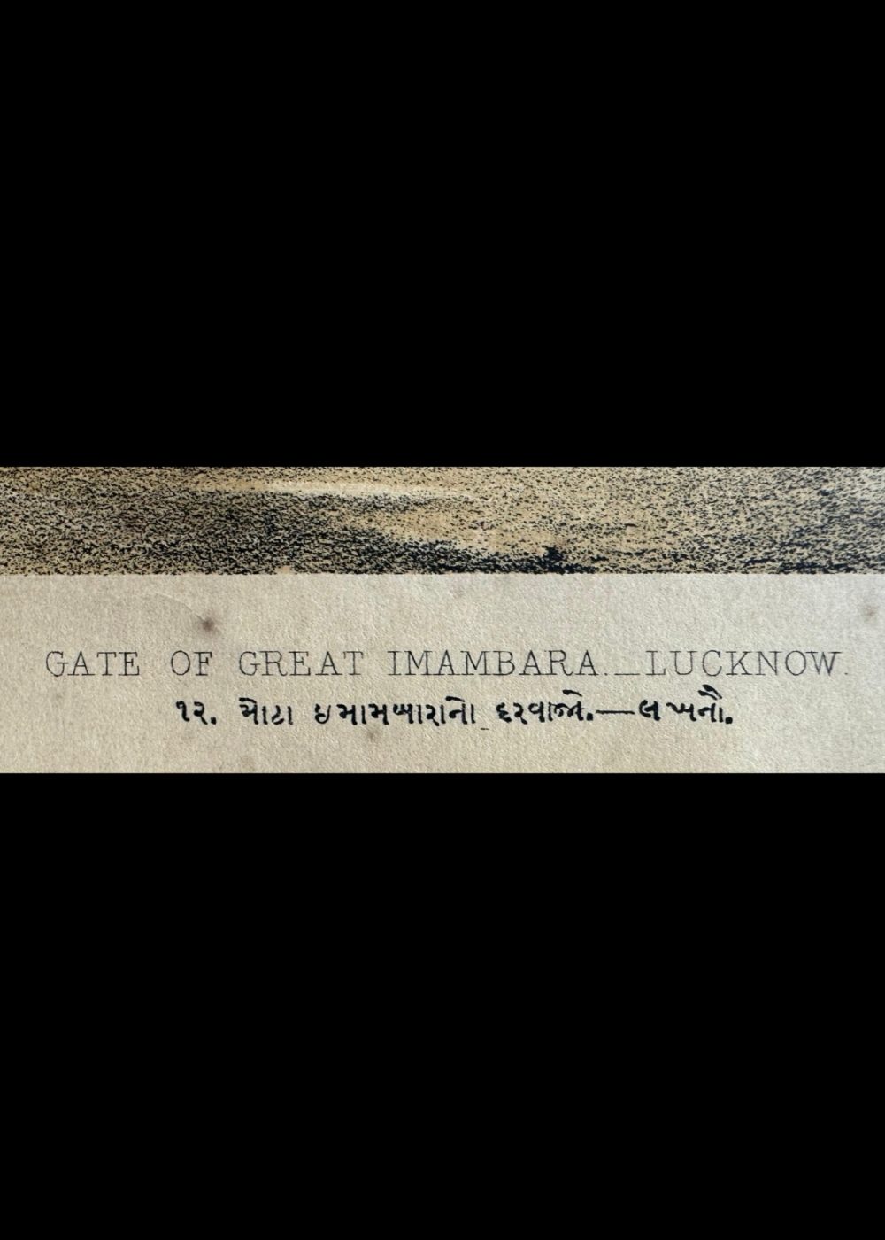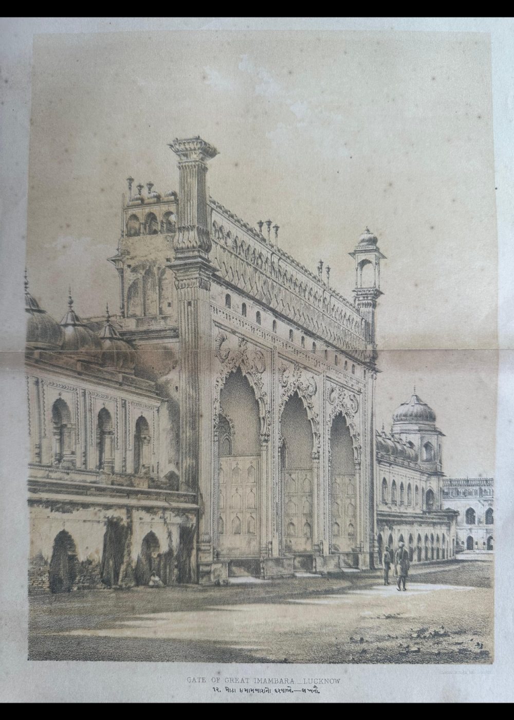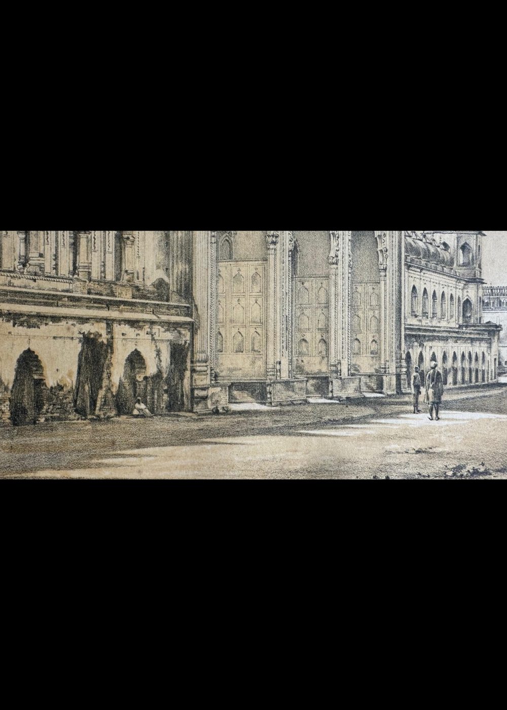 This cromo-lithograph, part of the Travels of India series, showcases the grand entrance to the Great Imambara in Lucknow. The intricate detailing of the gate is highlighted, with its towering columns, ornate arches, and decorative carvings. The surrounding structures are also depicted with precision, emphasizing the architectural splendor of this significant historical monument. The Great Imambara, built during the 18th century, is famous for its impressive design and engineering, and this lithograph captures its majestic gate in a moment of quiet, with a few figures walking along the pathway. The work was produced in the 19th century and reflects the rich cultural heritage of Lucknow.