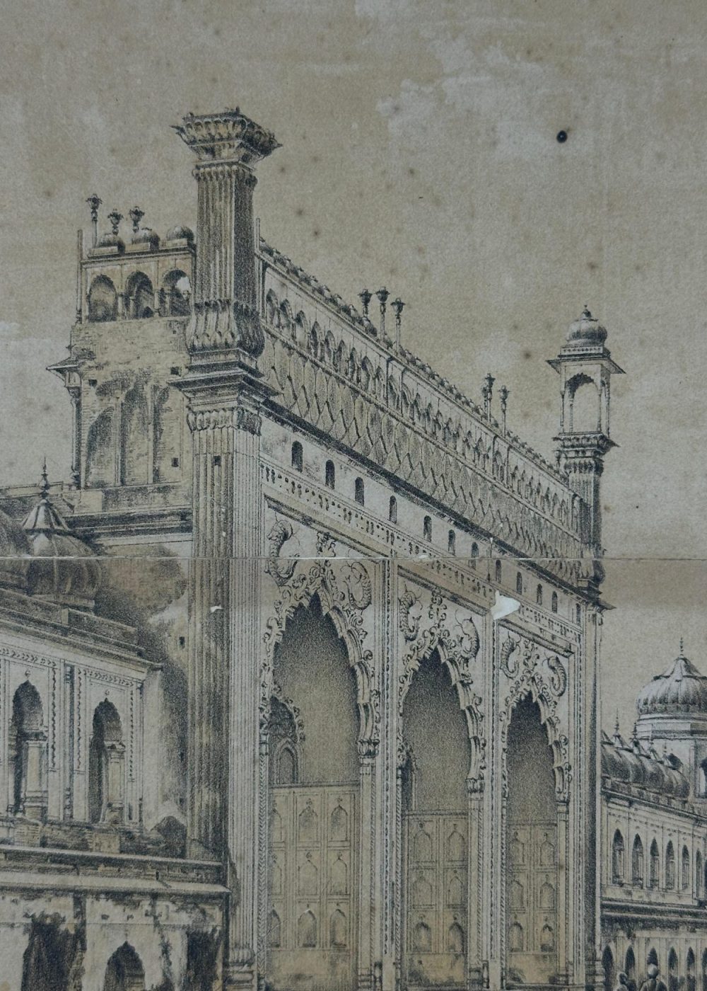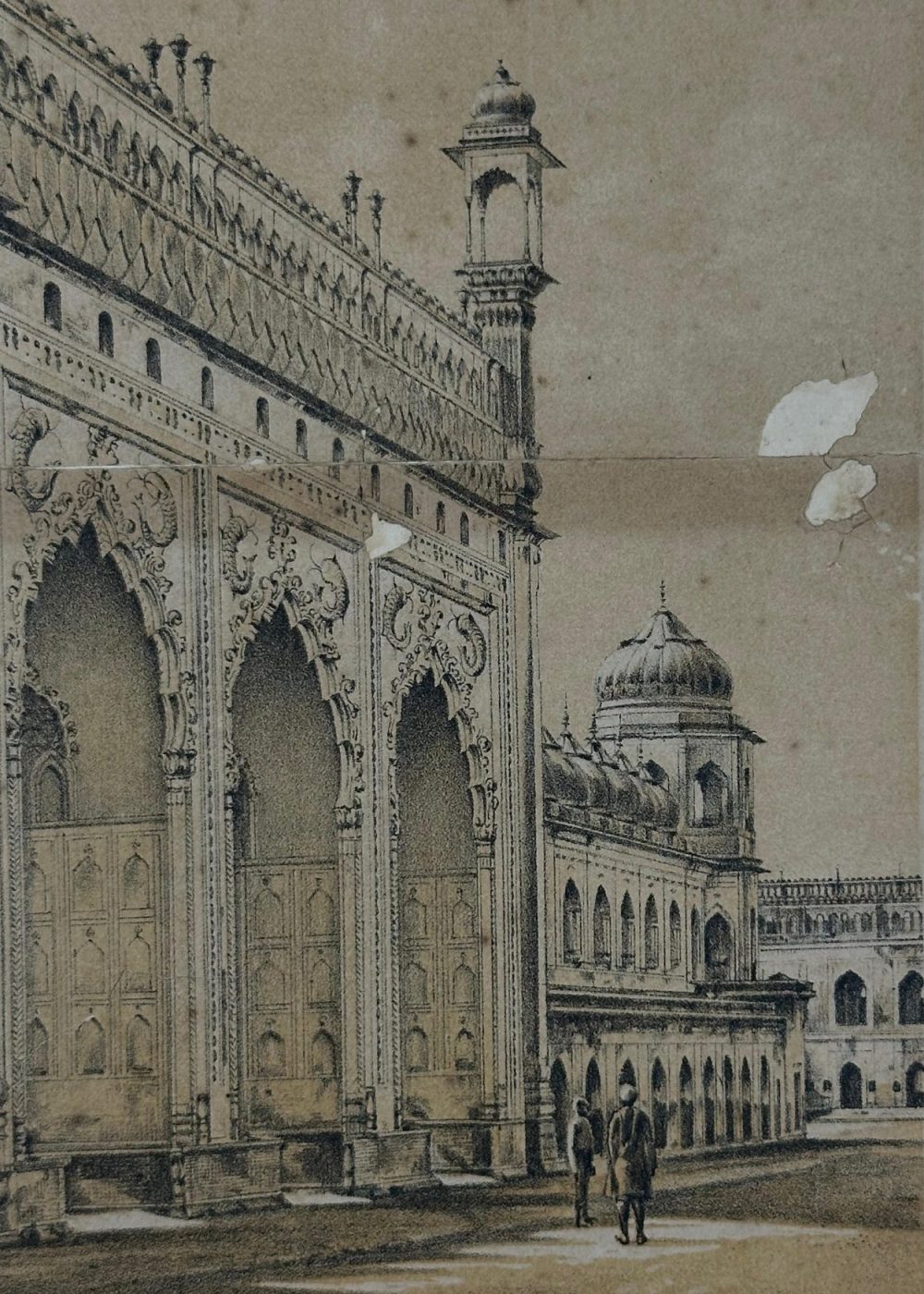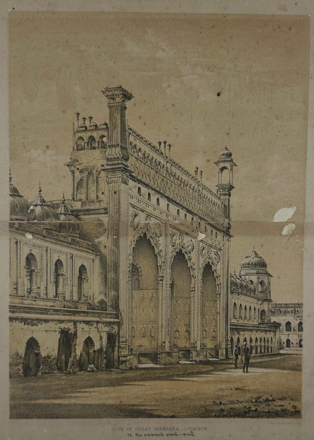 This lithograph presents the grand entrance gate of the Bara Imambara complex in Lucknow, India—an architectural marvel of the 18th century commissioned by Nawab Asaf-ud-Daula. The monumental triple-arched gateway, richly adorned with ornate stucco detailing and flanked by slender minarets, exemplifies the Indo-Islamic architectural synthesis of Mughal grandeur and regional Awadhi refinement.