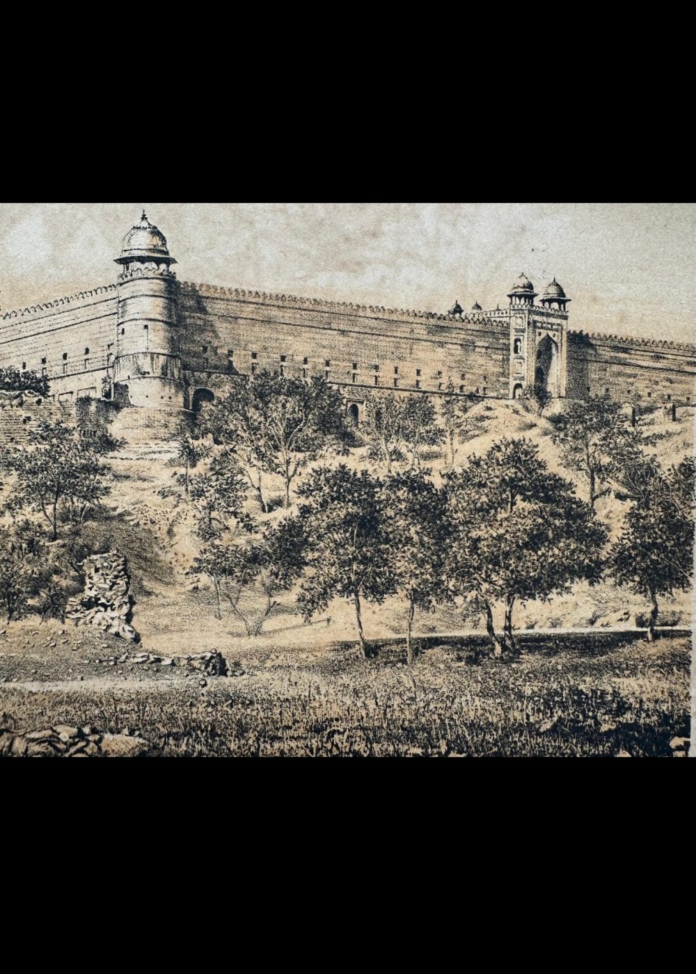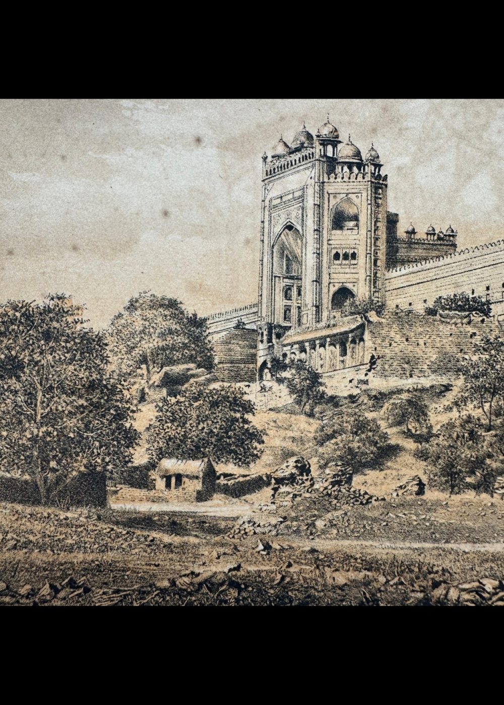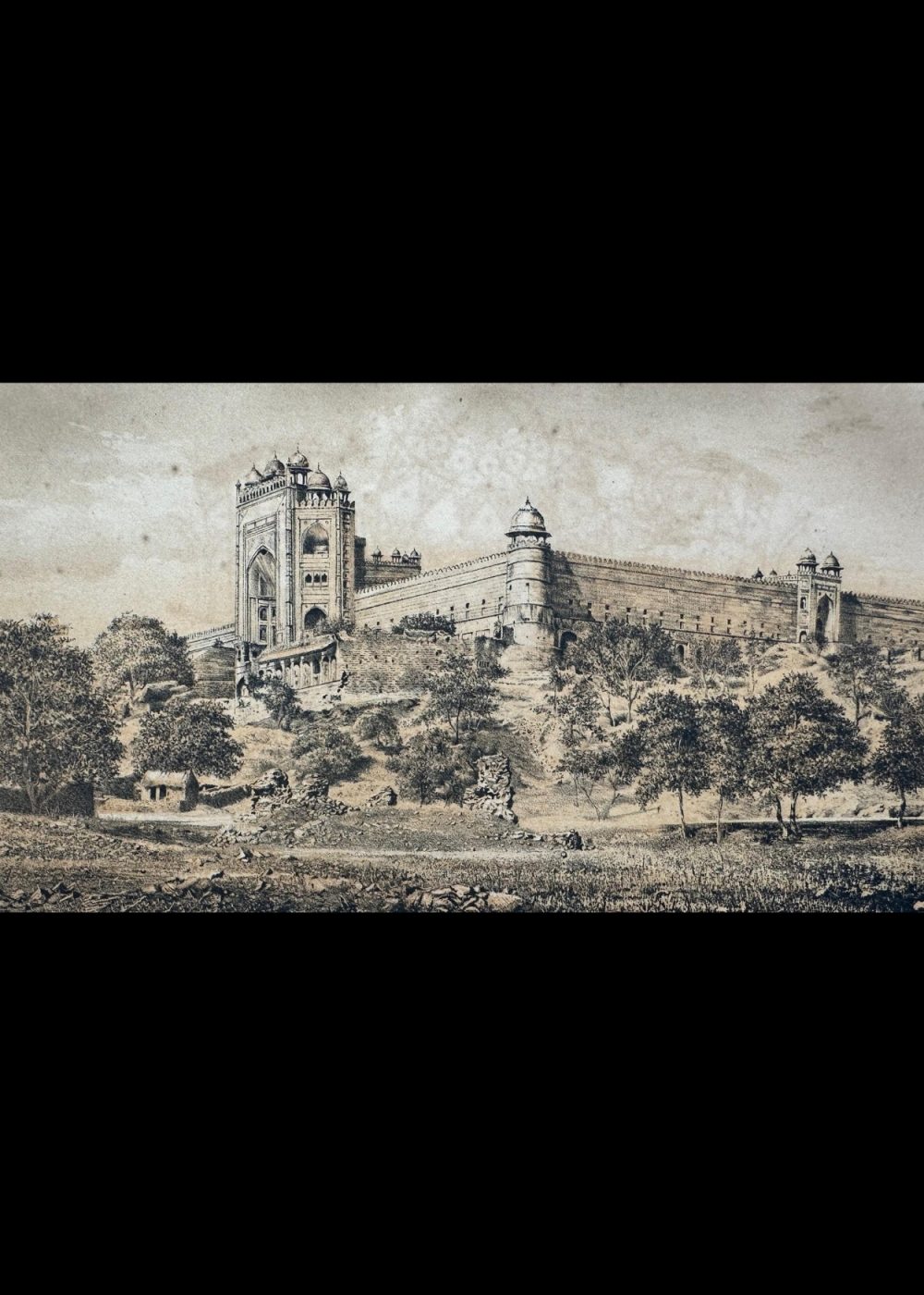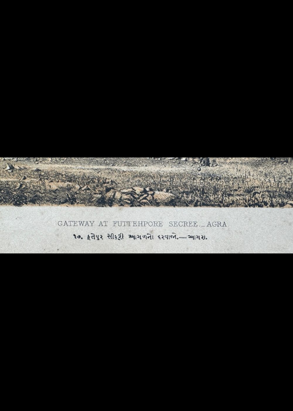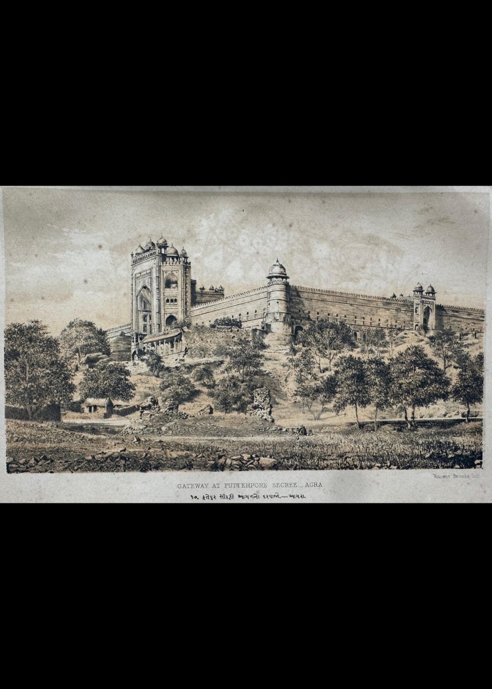 This chromolithograph titled “Gateway at Futtehpore Secree – Agra” is part of the “Travel of India” series and presents a striking view of the Buland Darwaza, the grand entrance to the city of Fatehpur Sikri, built by Emperor Akbar in the late 16th century. The artwork, lithographed by Vincent Brooks lith., captures the imposing scale and architectural magnificence of this Mughal gateway, framed by the massive fortification walls of the historic city. The scene also illustrates the surrounding rural landscape, subtly contrasting the grandeur of imperial power with the simplicity of village life. The Gujarati script beneath the English title reflects the multilingual reach of the publication during the British colonial era.