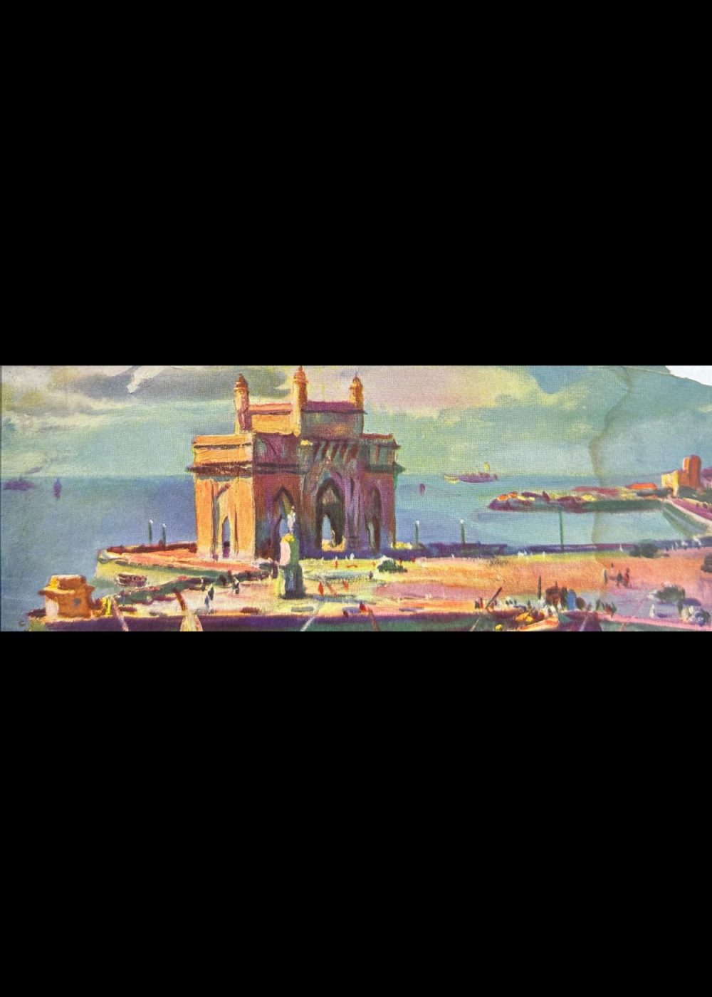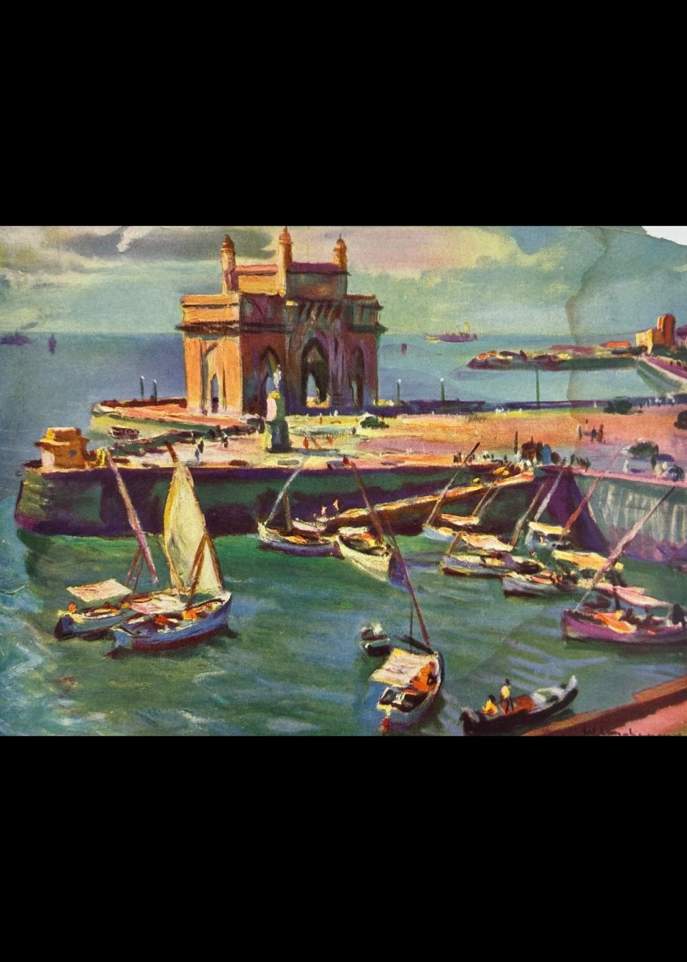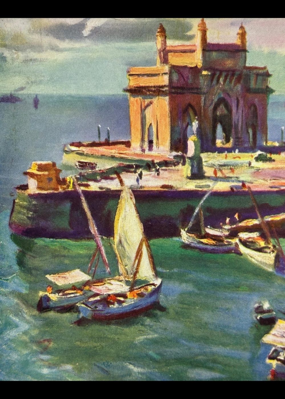 Rendered with expressive brushstrokes and a vibrant palette, the composition blends architectural grandeur with everyday maritime activity. This image reflects the colonial-era fascination with India’s emerging urban landscapes and serves as a visual record of Bombay’s historical role as a prominent port city. The work captures a moment of cultural intersection, movement, and trade on the western coast of India.