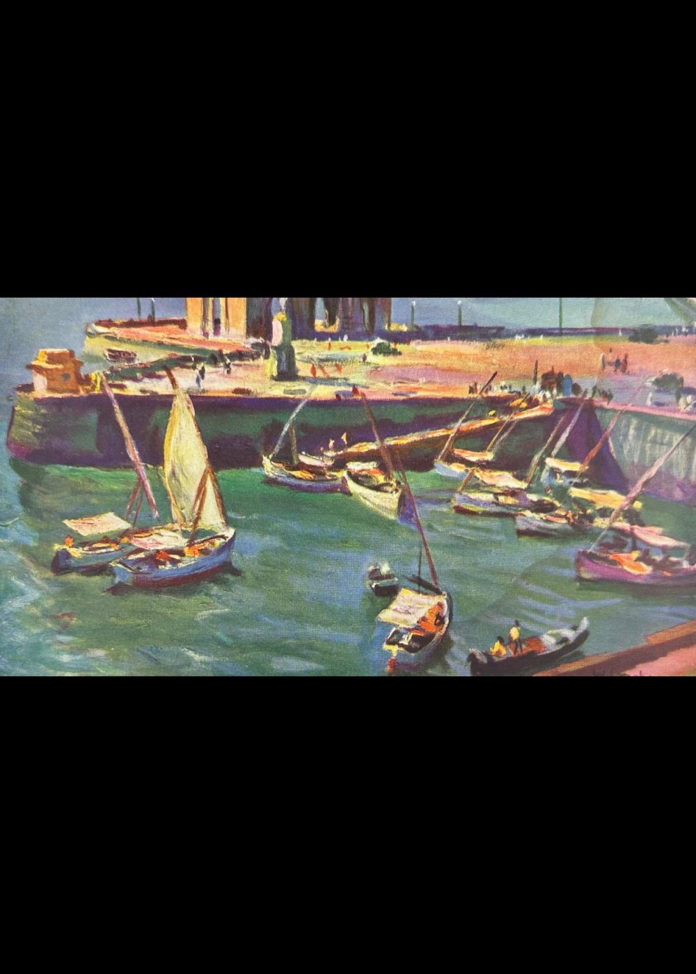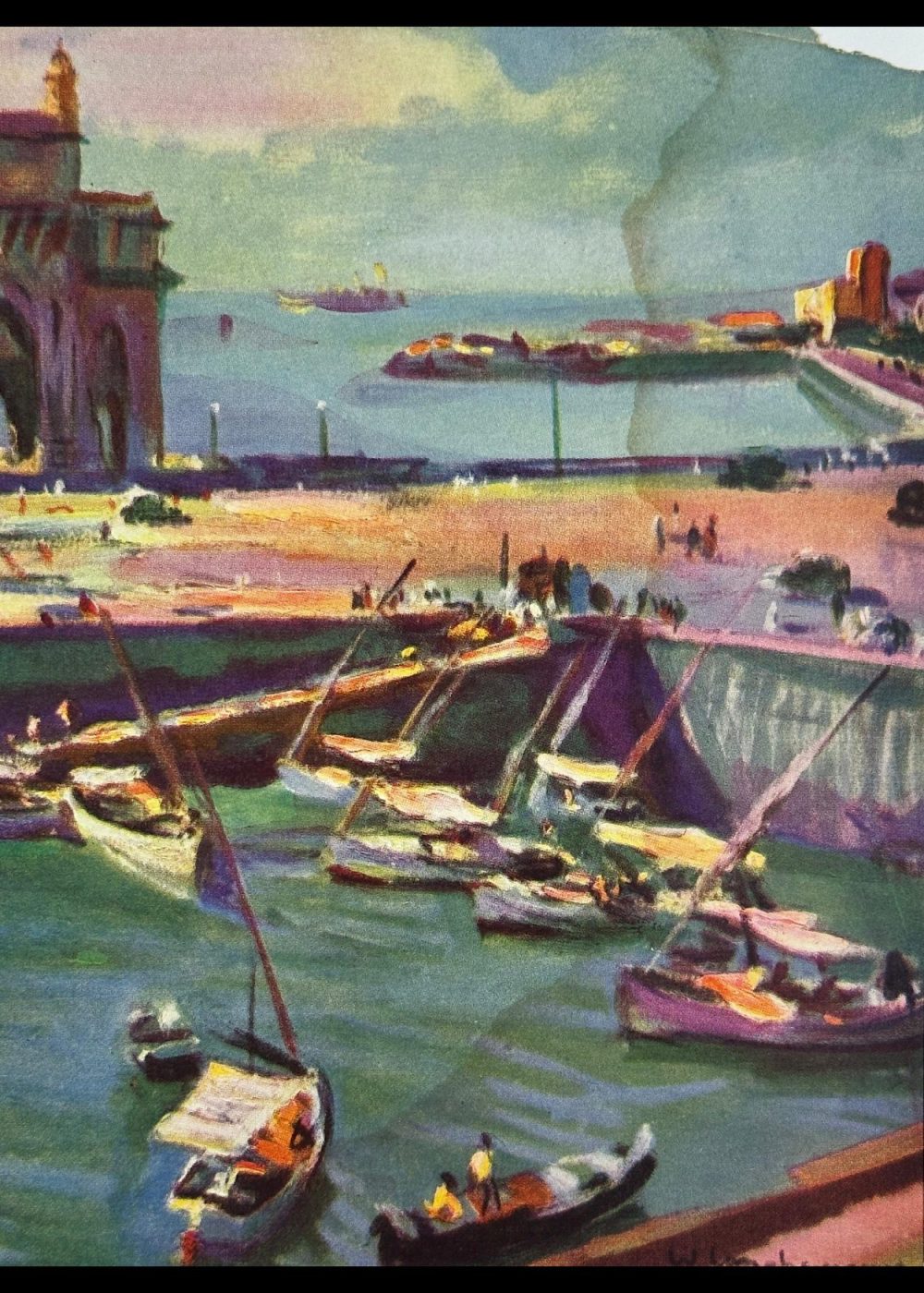 This vivid print offers a dynamic view of the iconic Gateway of India overlooking the Arabian Sea, as seen from the bustling harbor of Bombay (present-day Mumbai). Designed in the Indo-Saracenic style, the monumental arch was completed in 1924 to commemorate the visit of King George V and Queen Mary in 1911. The foreground teems with traditional Indian sailboats and wooden fishing vessels, their colorful forms animated by the reflective green-blue waters of the harbor.