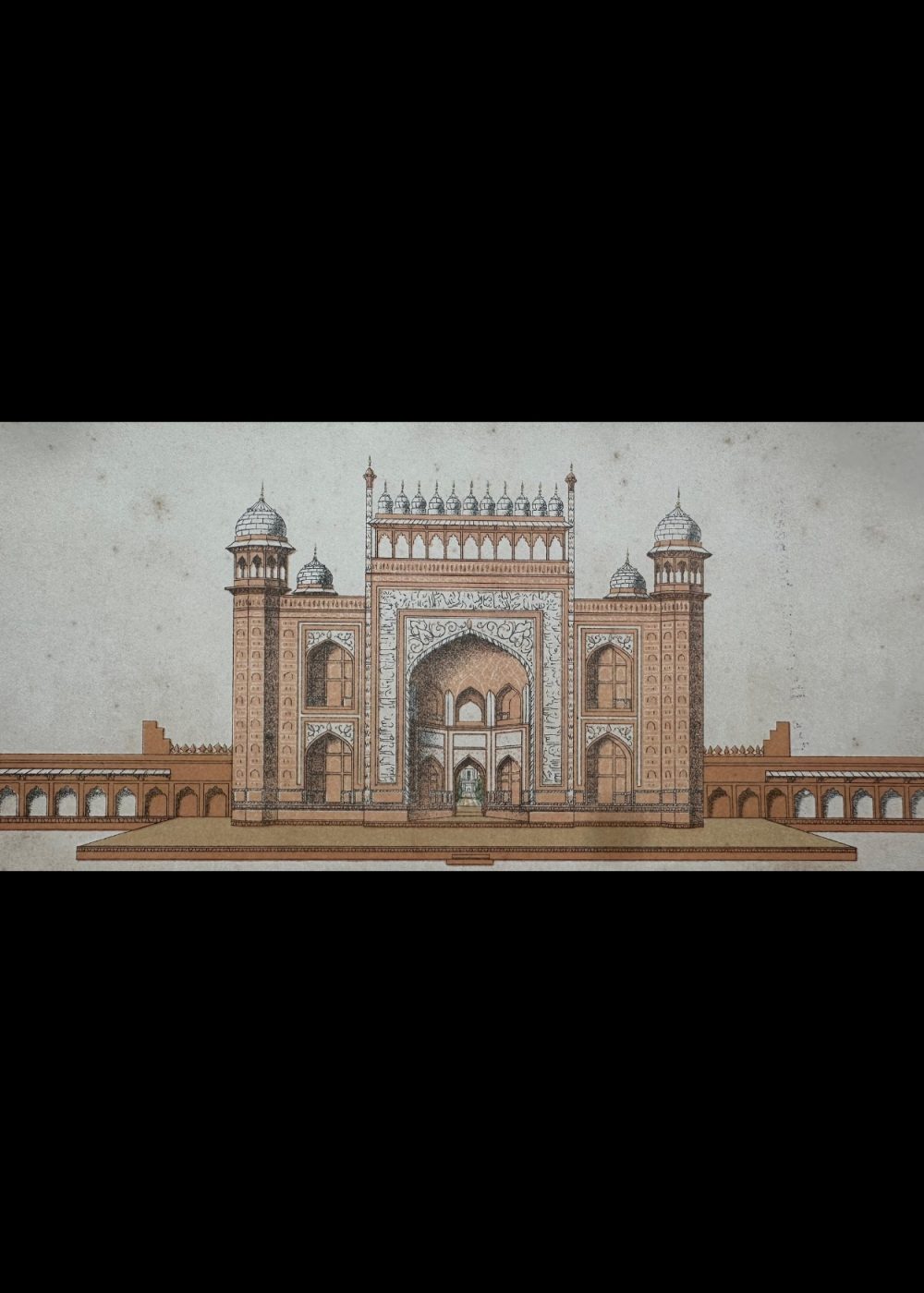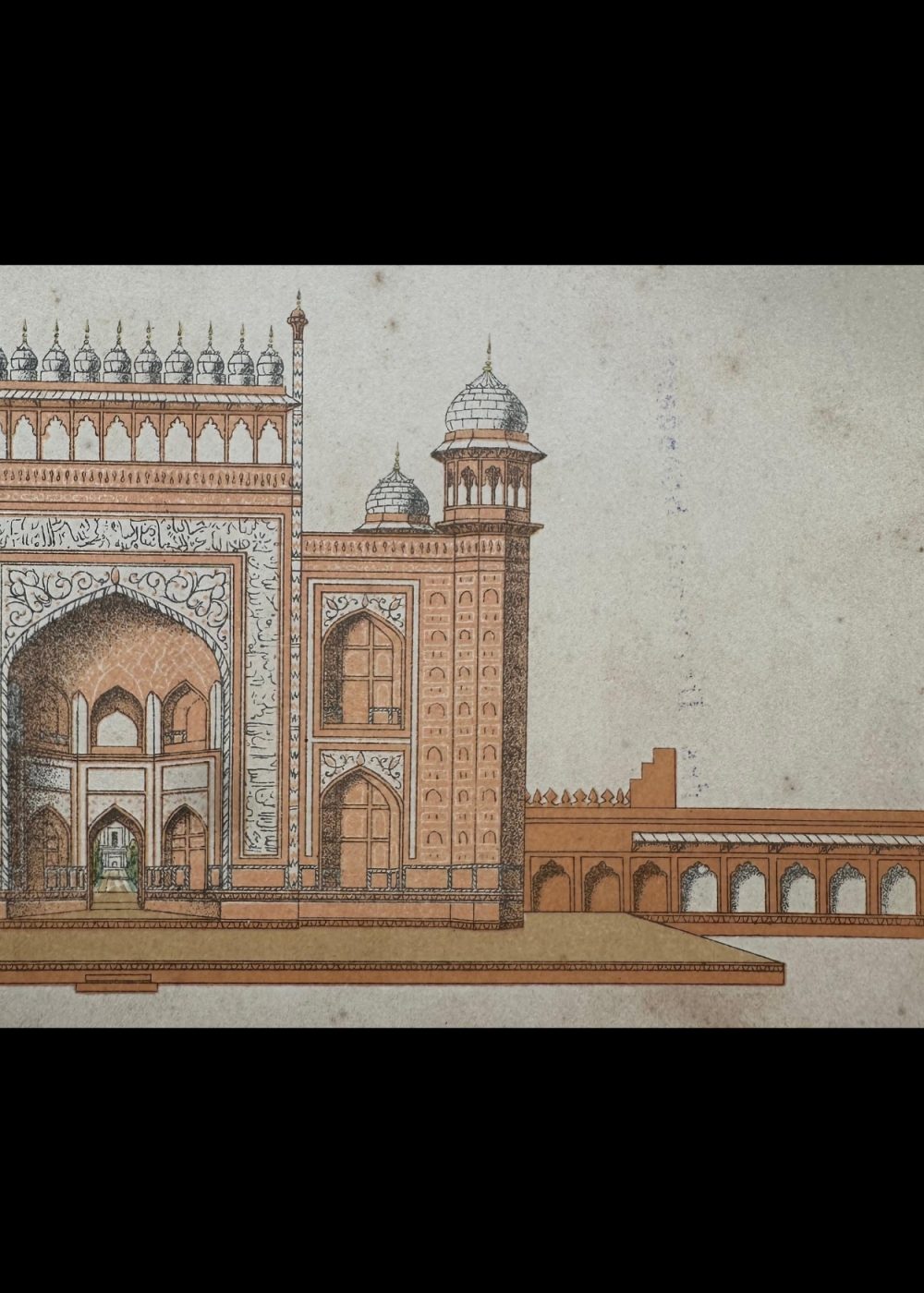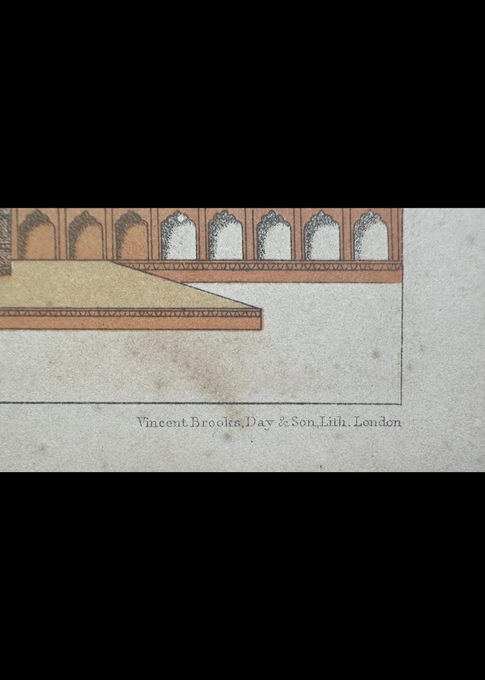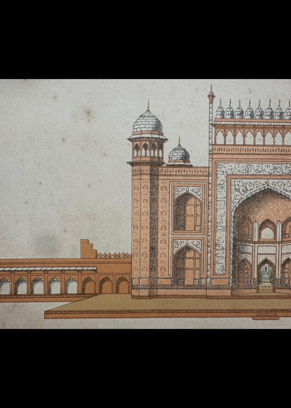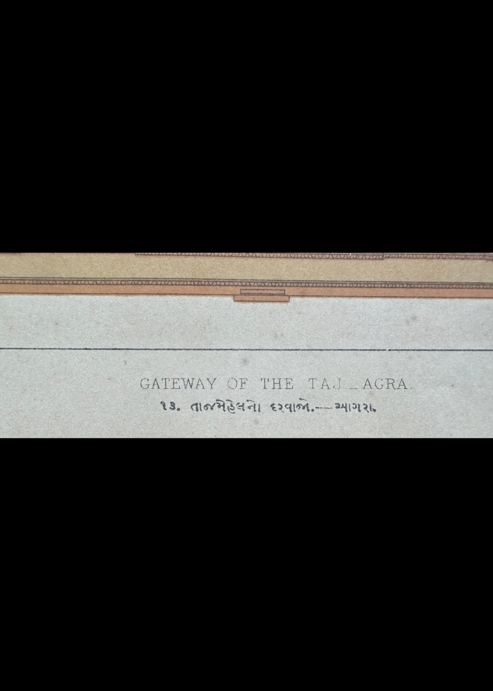 This chromolithograph, titled “Gateway of the Taj – Agra,” is part of the “Travel of India” series and showcases the grand main entrance to the Taj Mahal complex, known as the Great Gate (Darwaza-i Rauza). Rendered in intricate detail and soft tones, the print captures the architectural magnificence of the Mughal style, with its red sandstone façade, white marble inlay work, and symmetrical minarets. The gateway serves as the ceremonial threshold to the mausoleum, symbolizing a spiritual transition. Produced by Vincent Brooks, Day & Son, Lithographers, London, this artwork reflects the fascination with Indian architecture during the colonial period and served as an educational and aesthetic record for British and European audiences. Gujarati script beneath the title indicates its multilingual reach.