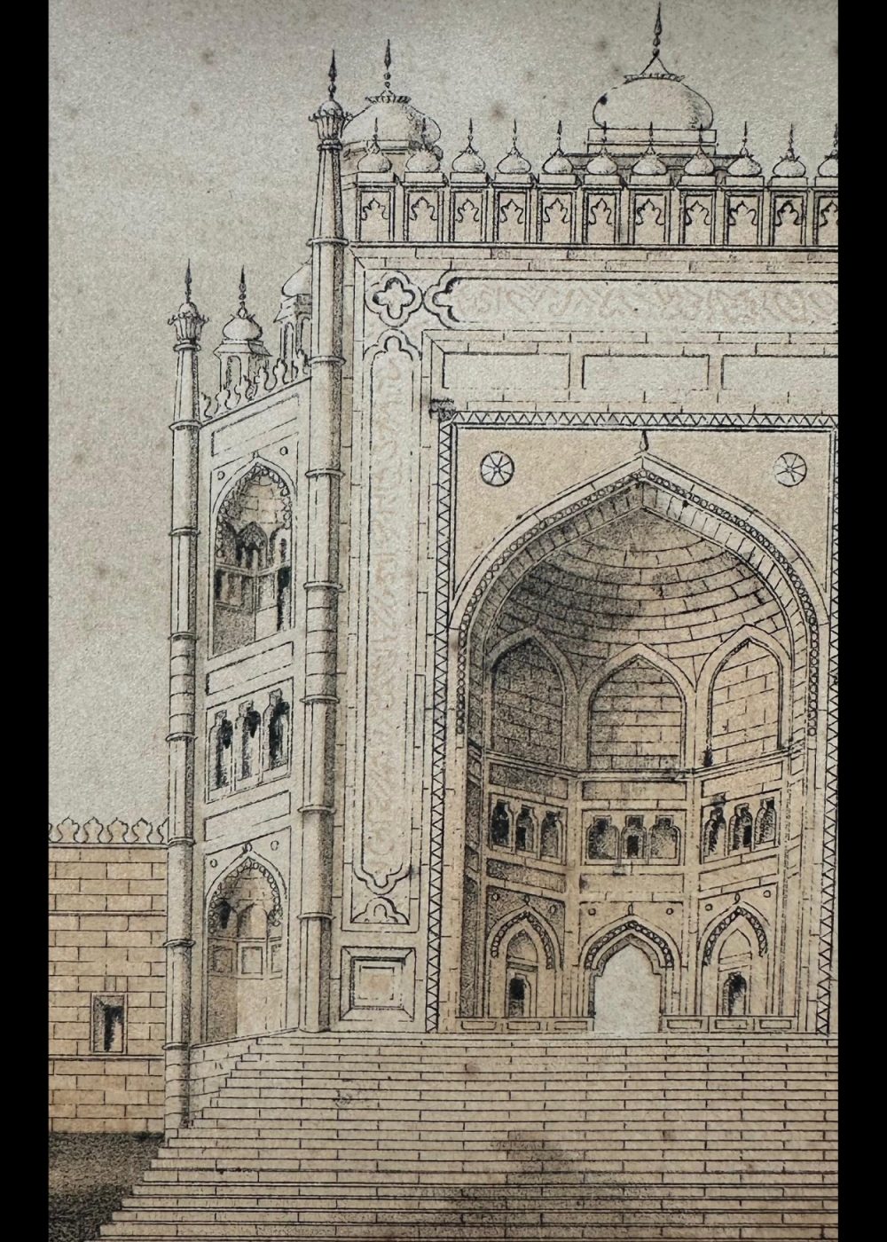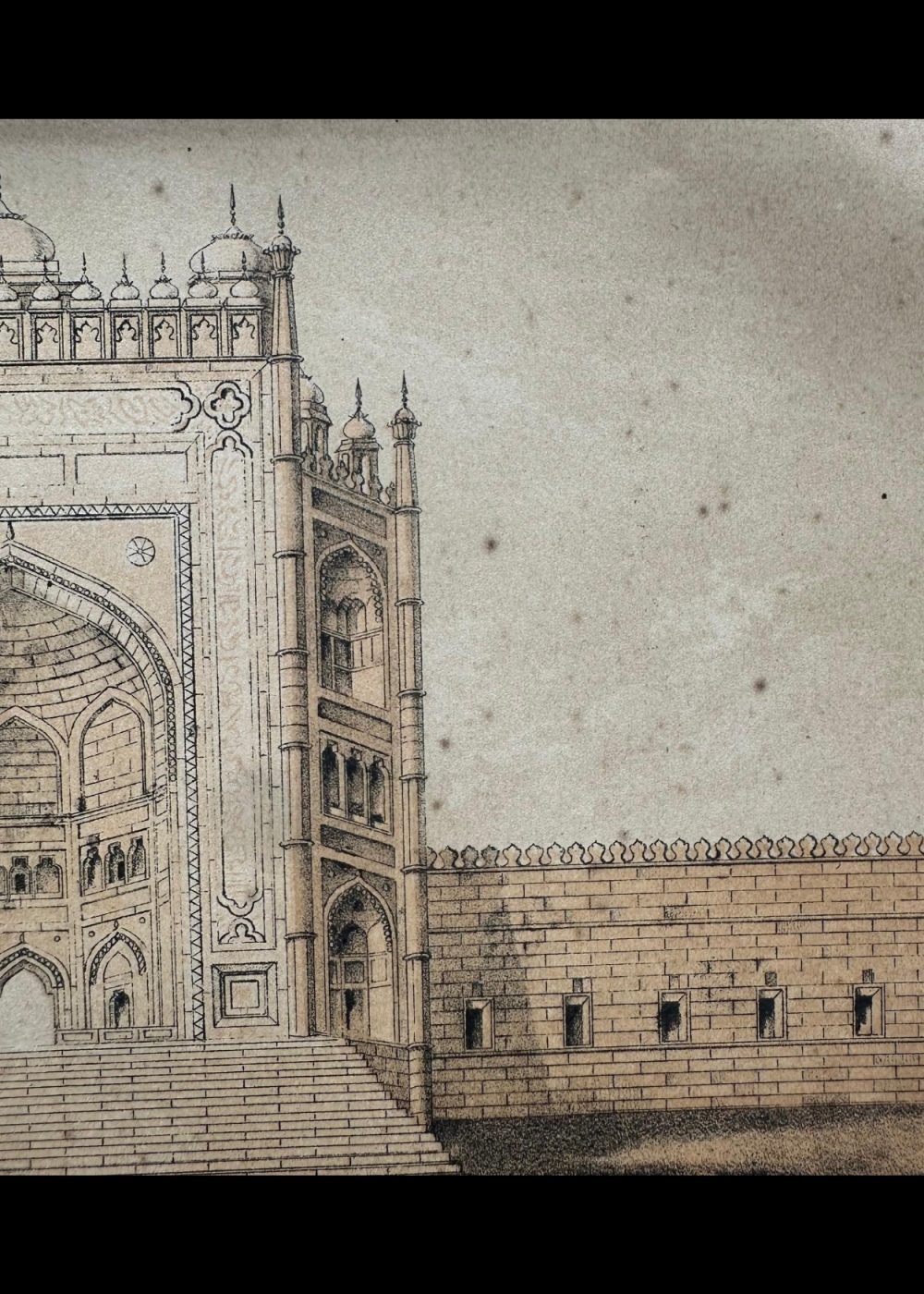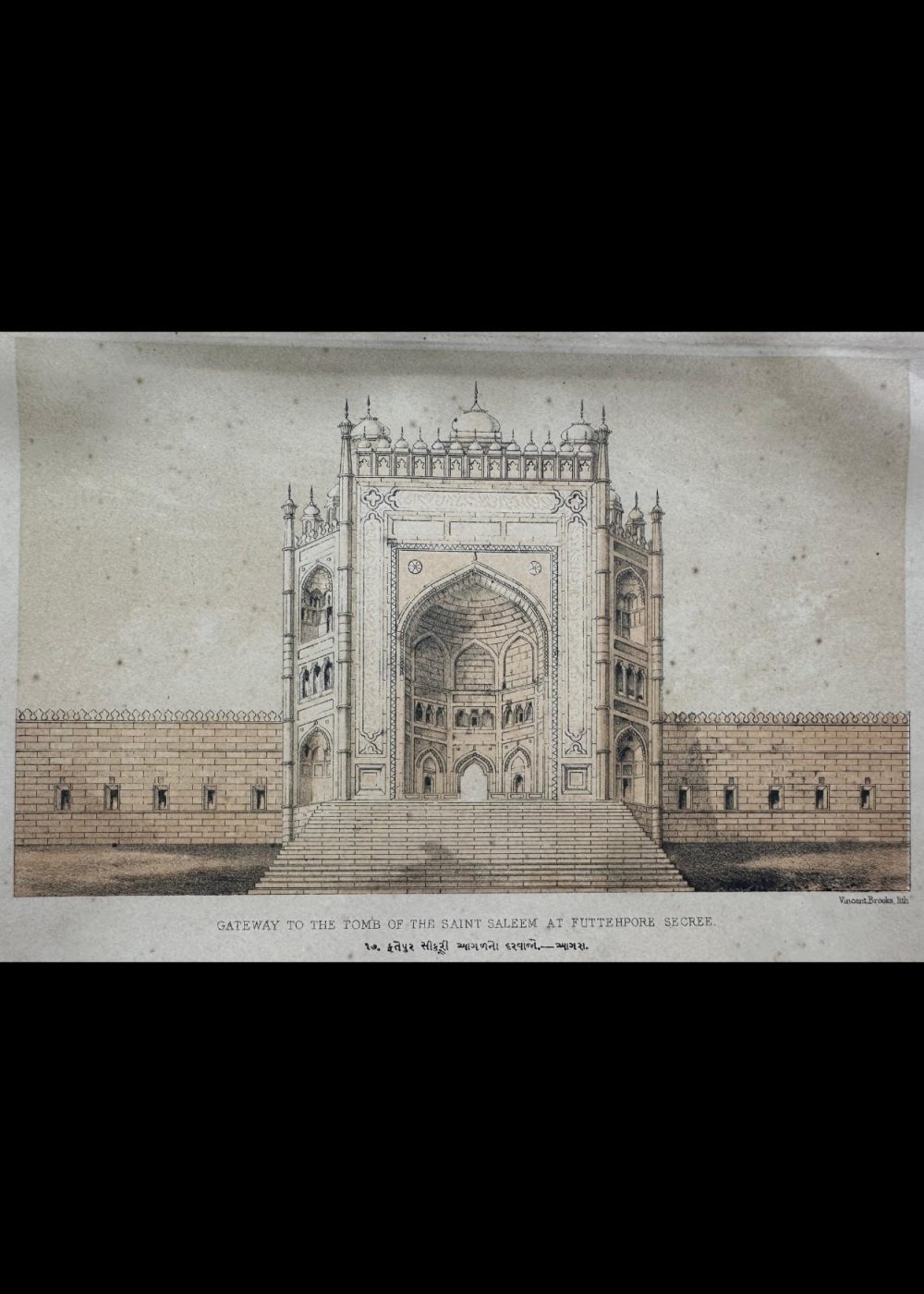 This chromo-lithograph depicts the “Gateway to the Tomb of Saint Saleem at Futtehpore Secre.” The intricate artwork showcases the grand entrance of the tomb, designed with ornate Islamic architectural features such as arches, minarets, and detailed carvings. The structure is surrounded by a high, fortified wall with small window-like openings. The lithograph is part of a series from “Travel in India,” capturing significant historical and architectural landmarks of the region. The image is signed by Vincent Brooks, and its style suggests it was produced in the 19th century, offering a glimpse into the artistic and architectural heritage of the time.