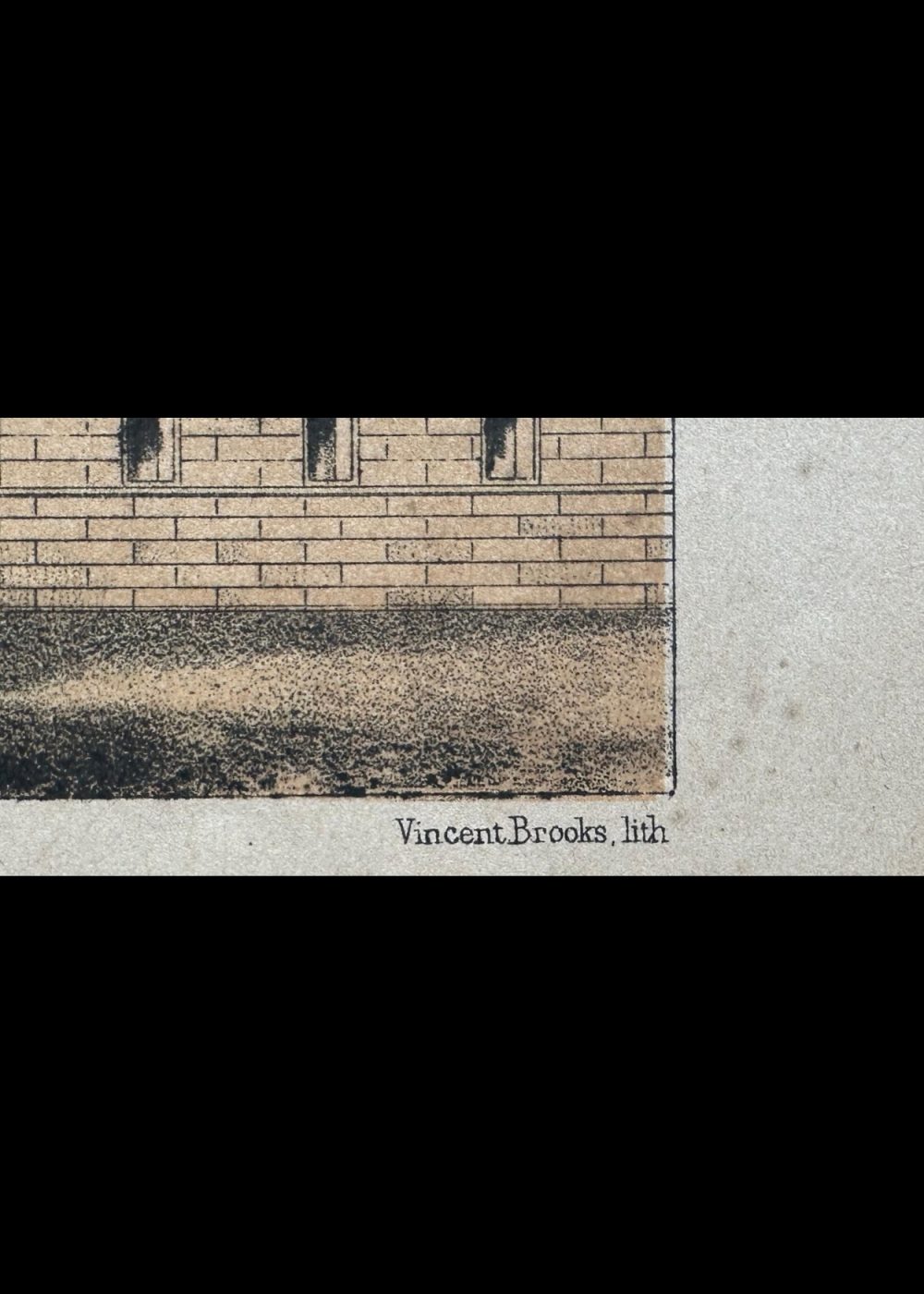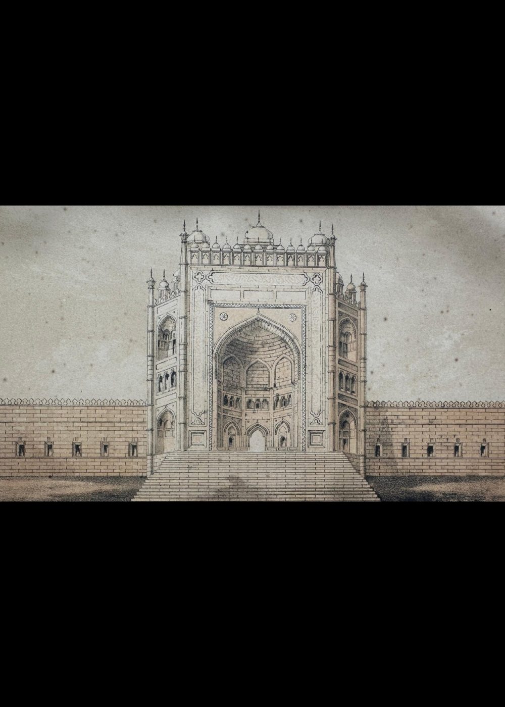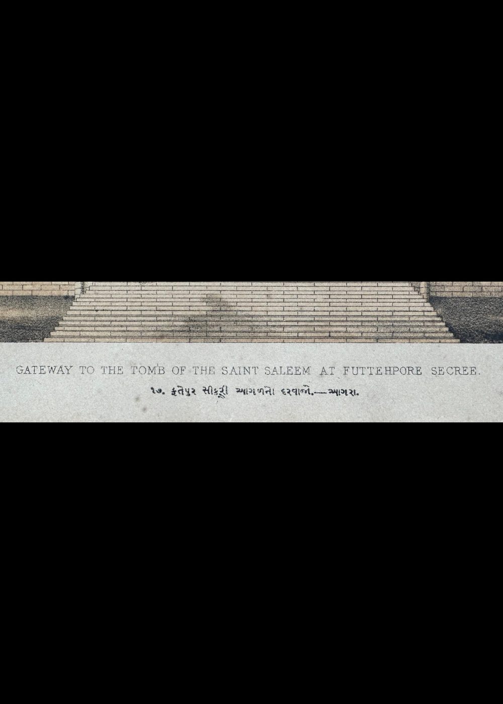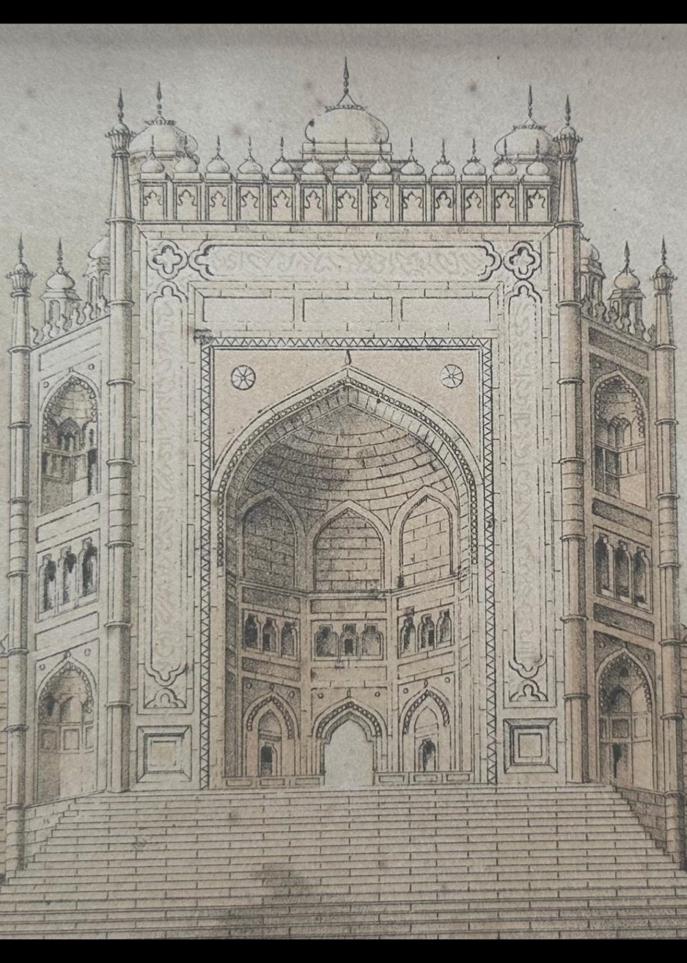 This chromo-lithograph depicts the “Gateway to the Tomb of Saint Saleem at Futtehpore Secre.” The intricate artwork showcases the grand entrance of the tomb, designed with ornate Islamic architectural features such as arches, minarets, and detailed carvings. The structure is surrounded by a high, fortified wall with small window-like openings. The lithograph is part of a series from “Travel in India,” capturing significant historical and architectural landmarks of the region. The image is signed by Vincent Brooks, and its style suggests it was produced in the 19th century, offering a glimpse into the artistic and architectural heritage of the time.
