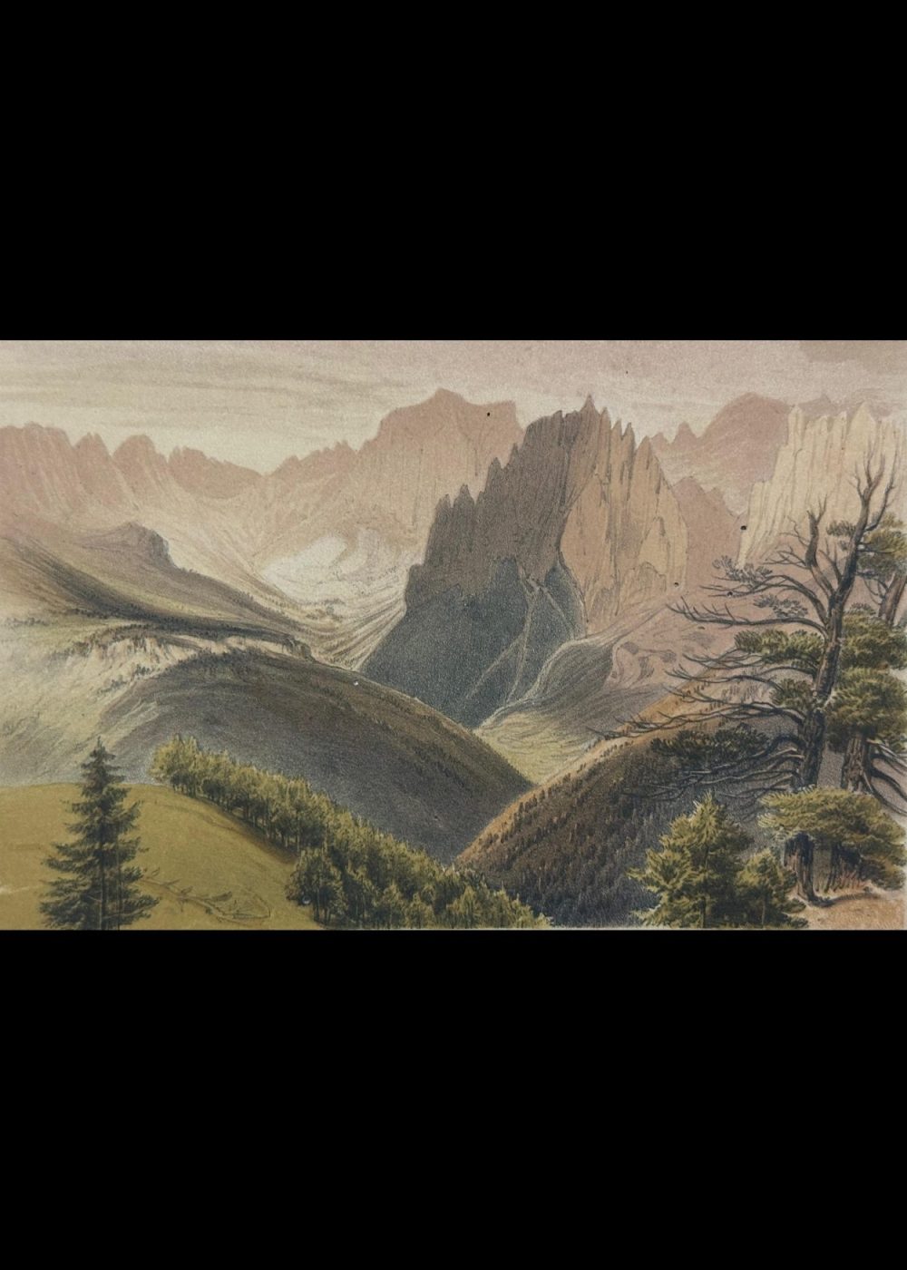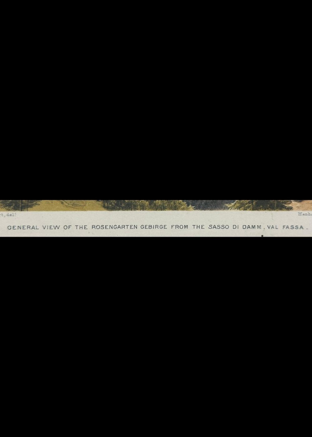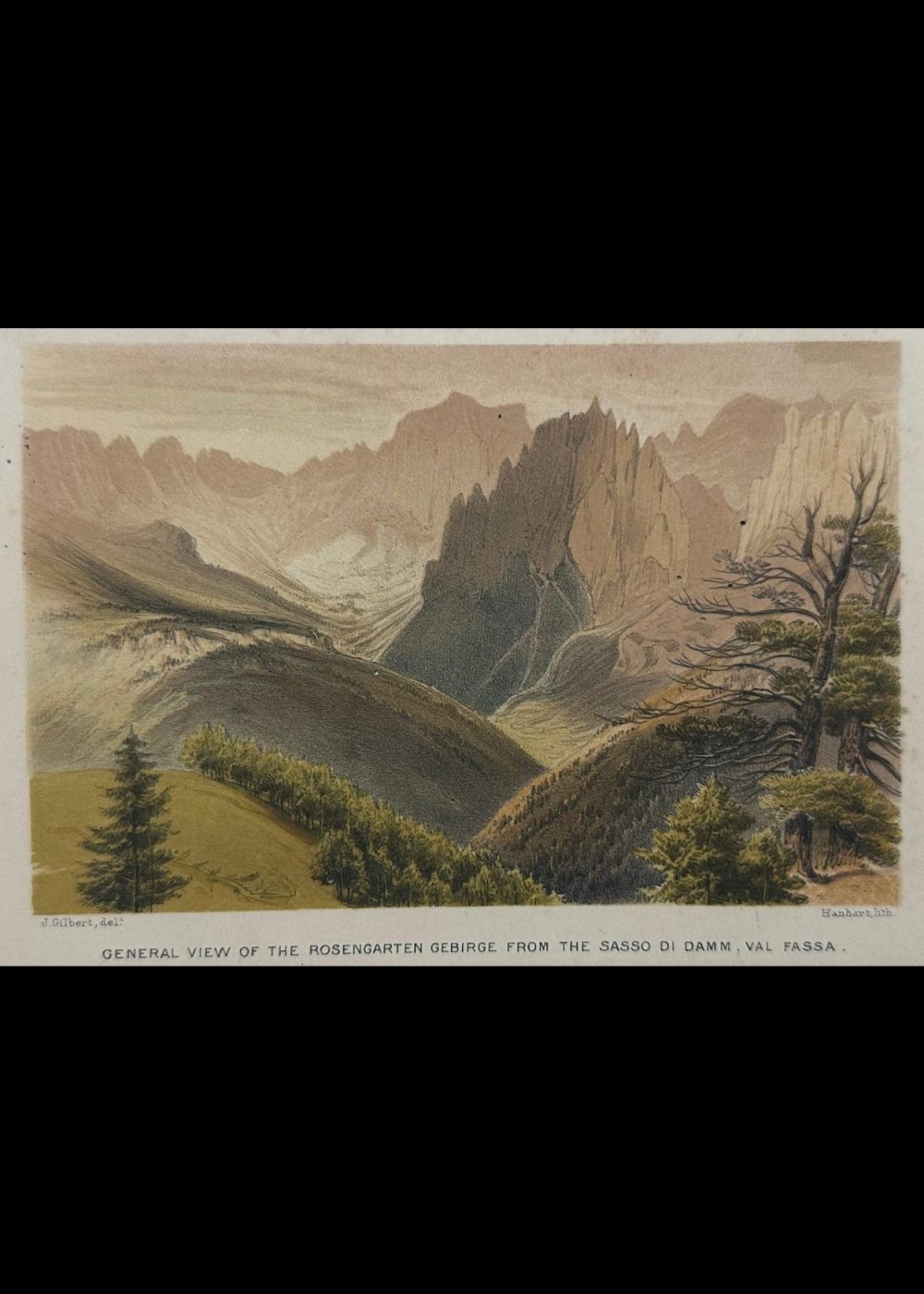 This finely detailed chromolithograph offers a sweeping panoramic view of the Rosengarten Group, a dramatic mountain range in the Italian Dolomites, as seen from Sasso di Darn in Val Tassa. Rendered with delicate coloration and atmospheric depth, the image captures the rugged beauty of the jagged peaks and the lush forested valleys below. The foreground includes alpine trees, enhancing the sense of scale and serenity. A classic 19th-century landscape print, it blends scientific topography with romantic aesthetics, likely intended for educational or travel illustration purposes.