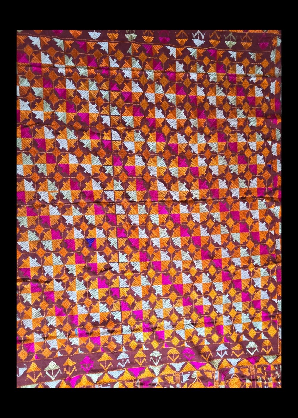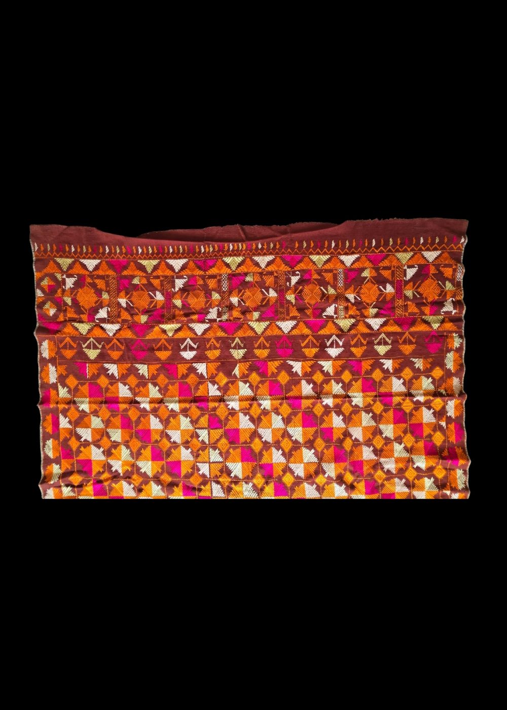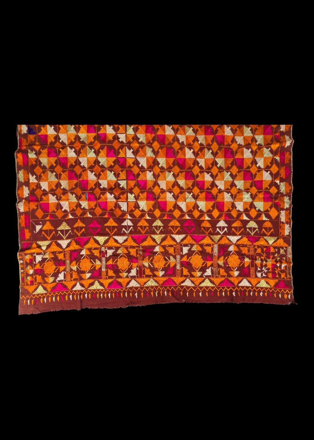 This is a traditional Khaddar Phulkari, a type of Punjabi embroidery known for its vibrant and intricate designs. The textile features a rich array of geometric patterns in bright hues of pink, orange, and yellow, with sharp, angular motifs that create a striking visual effect. The Phulkari design is meticulously crafted using silk thread on a cotton or khaddar fabric, with the colorful stitches forming a grid-like structure. The border is adorned with additional patterns, adding to the overall vibrancy of the piece. Phulkari is a reflection of the skilled craftsmanship and cultural significance of the Punjab region, often used in garments like dupattas and shawls.