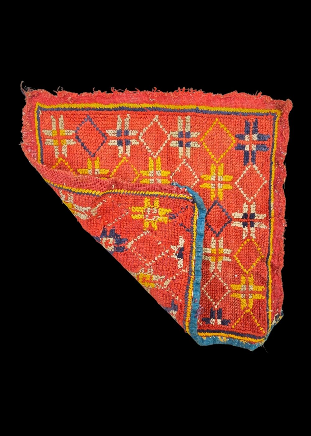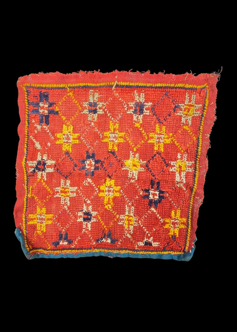 This vibrant Banjara handcrafted textile showcases traditional geometric embroidery in bold shades of red, yellow, blue, and white. Handwoven with intricate cross and diamond patterns, it reflects the rich cultural heritage and skilled artistry of the Banjara community. The piece’s vivid colors and textured surface embody the nomadic spirit and decorative traditions of rural India.