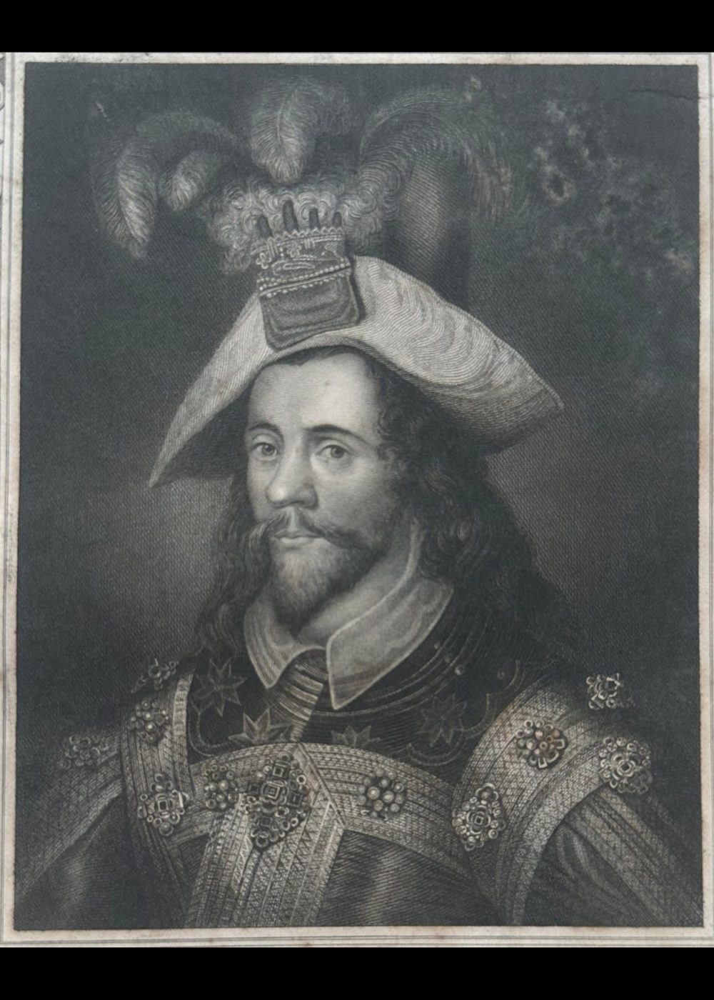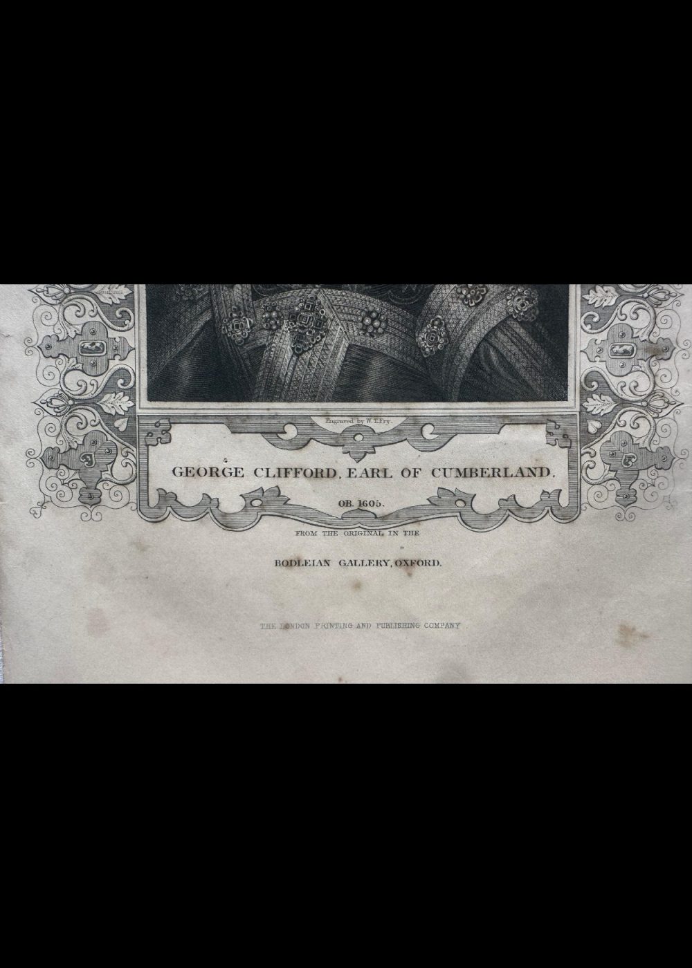 This ornate 19th-century engraving portrays George Clifford, the 3rd Earl of Cumberland, famed Elizabethan courtier, naval commander, and champion jouster. Depicted in elaborate armor and plumed hat, he embodies the grandeur and martial pride of the late Tudor nobility. The portrait is based on the original in the Bodleian Gallery, Oxford, and published by The London Printing and Publishing Company. The decorative border featuring acanthus leaves and heraldic motifs emphasizes his noble lineage and distinguished service.
