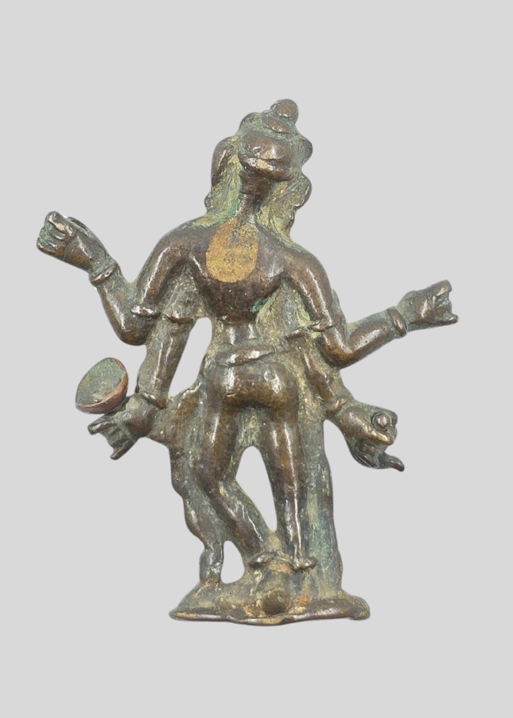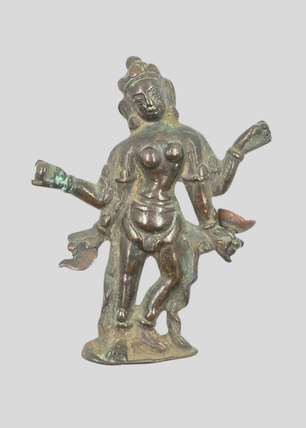 This bronze sculpture from Nepal, portrays a multi-armed Goddess standing in a dynamic posture. The figure is adorned with minimal ornaments and exhibits a serene yet powerful expression, reflecting the divine feminine energy. Characteristic of Nepalese craftsmanship of the period, the sculpture demonstrates fine detailing in its form and gestures, created for ritual devotion and worship.