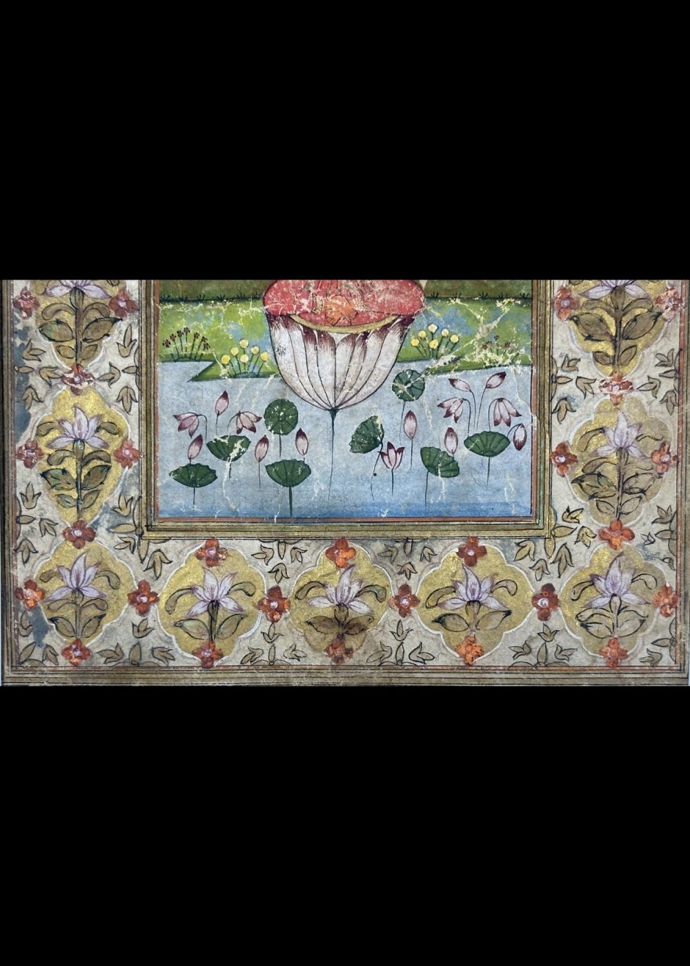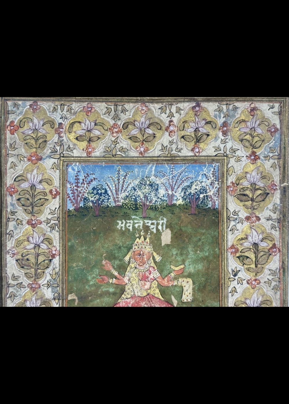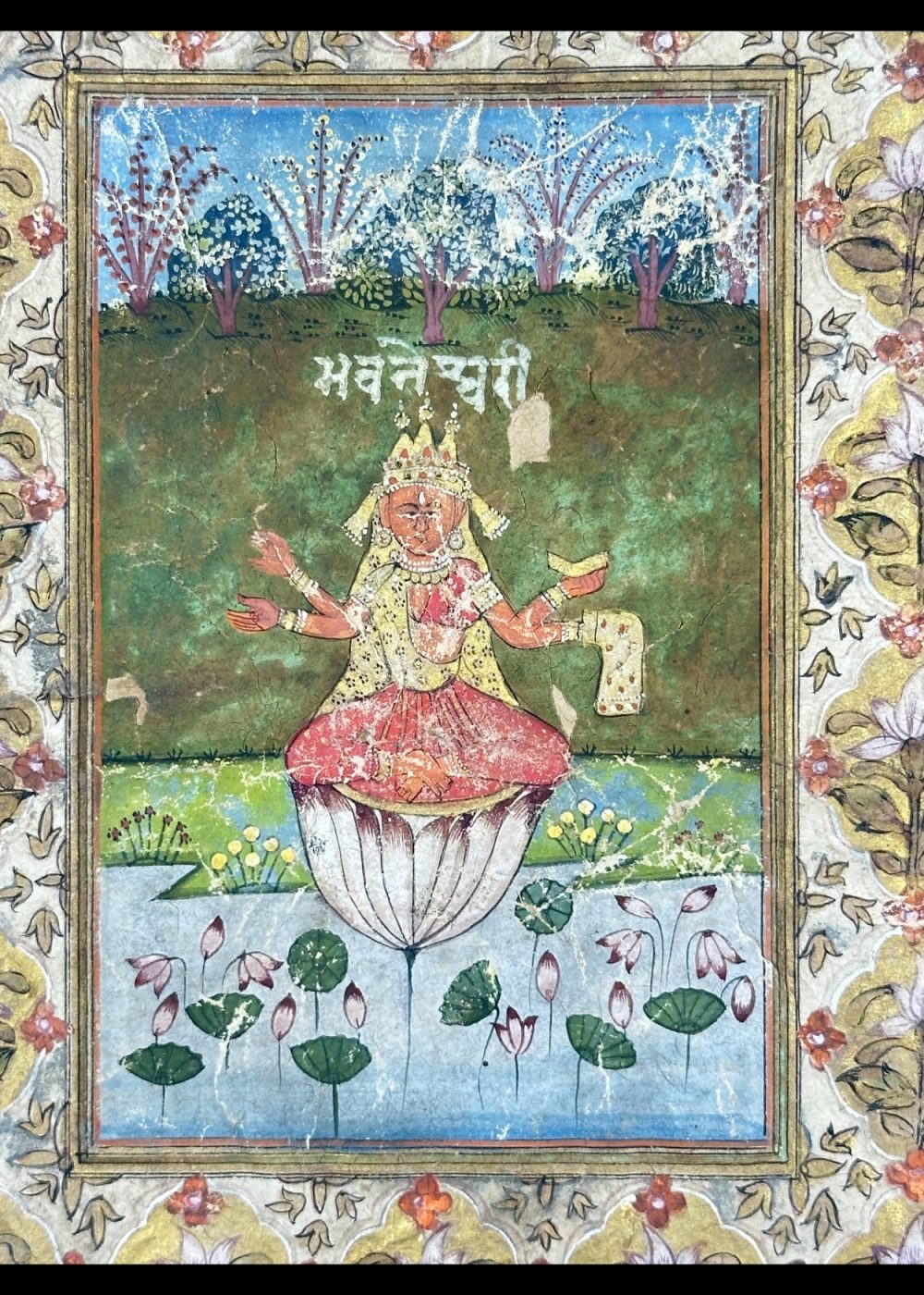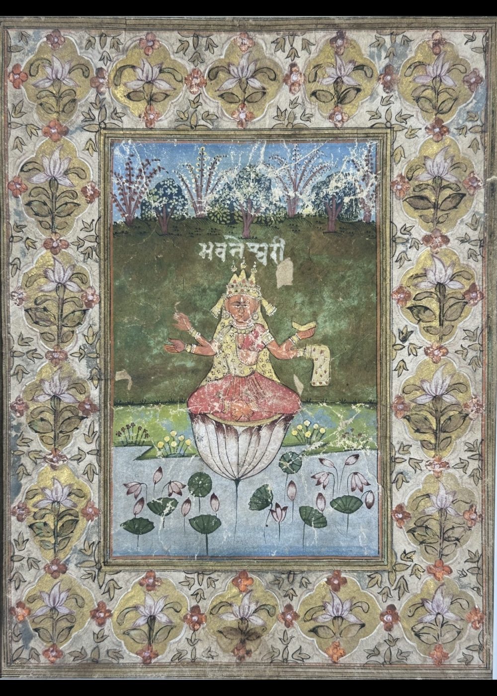 This traditional Indian miniature painting beautifully depicts Goddess Bhavneshwari, one of the revered Mahavidyas in Hindu tradition. She is seated gracefully on a blooming lotus, symbolizing purity and divine creation, amidst a serene landscape of lush greenery and blossoming lotuses. Adorned with a golden crown and ornaments, the Goddess radiates serenity and spiritual power. The ornate floral border enhances the sacred aura of the artwork, making it a timeless representation of devotion, artistry, and cultural heritage.
