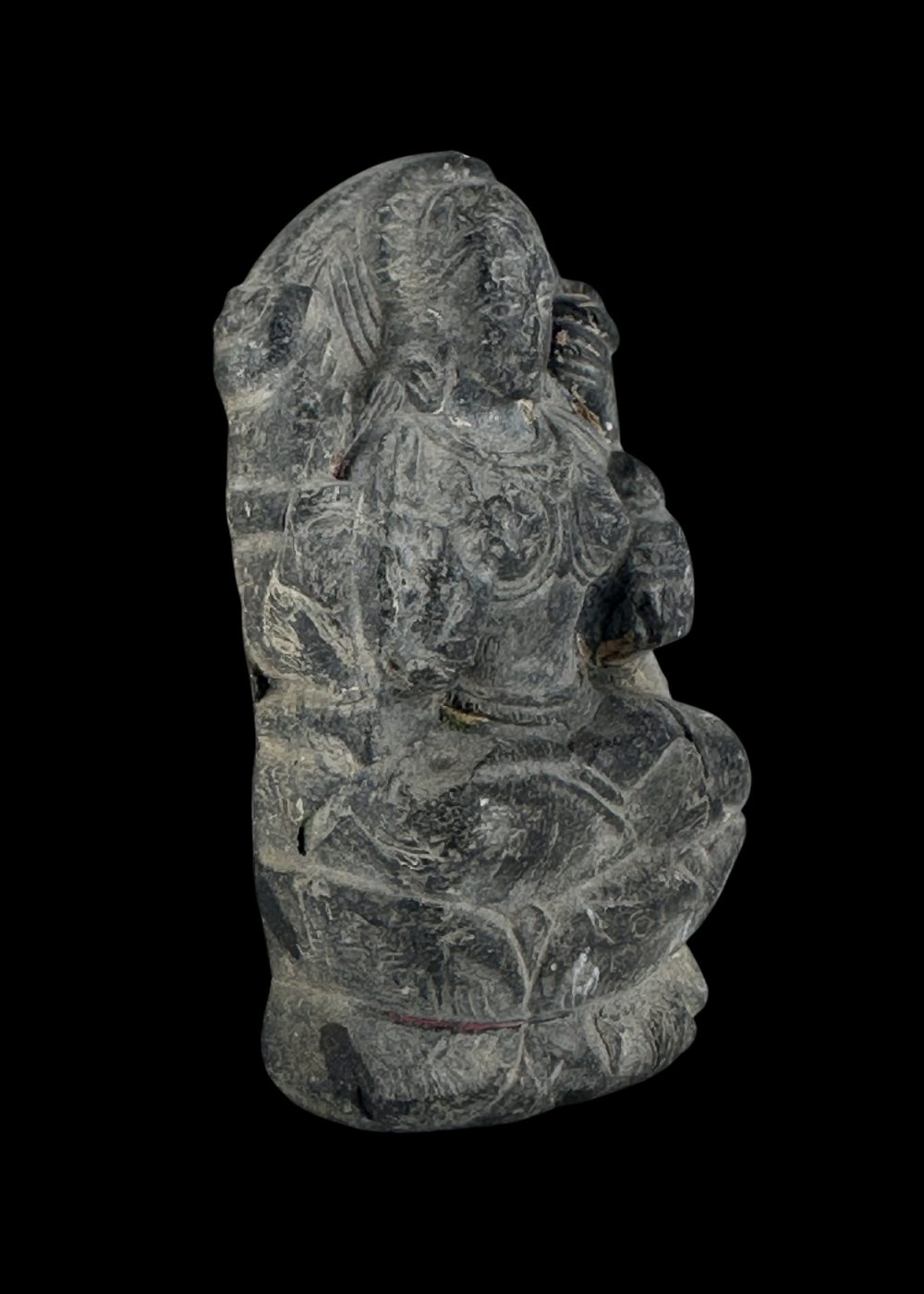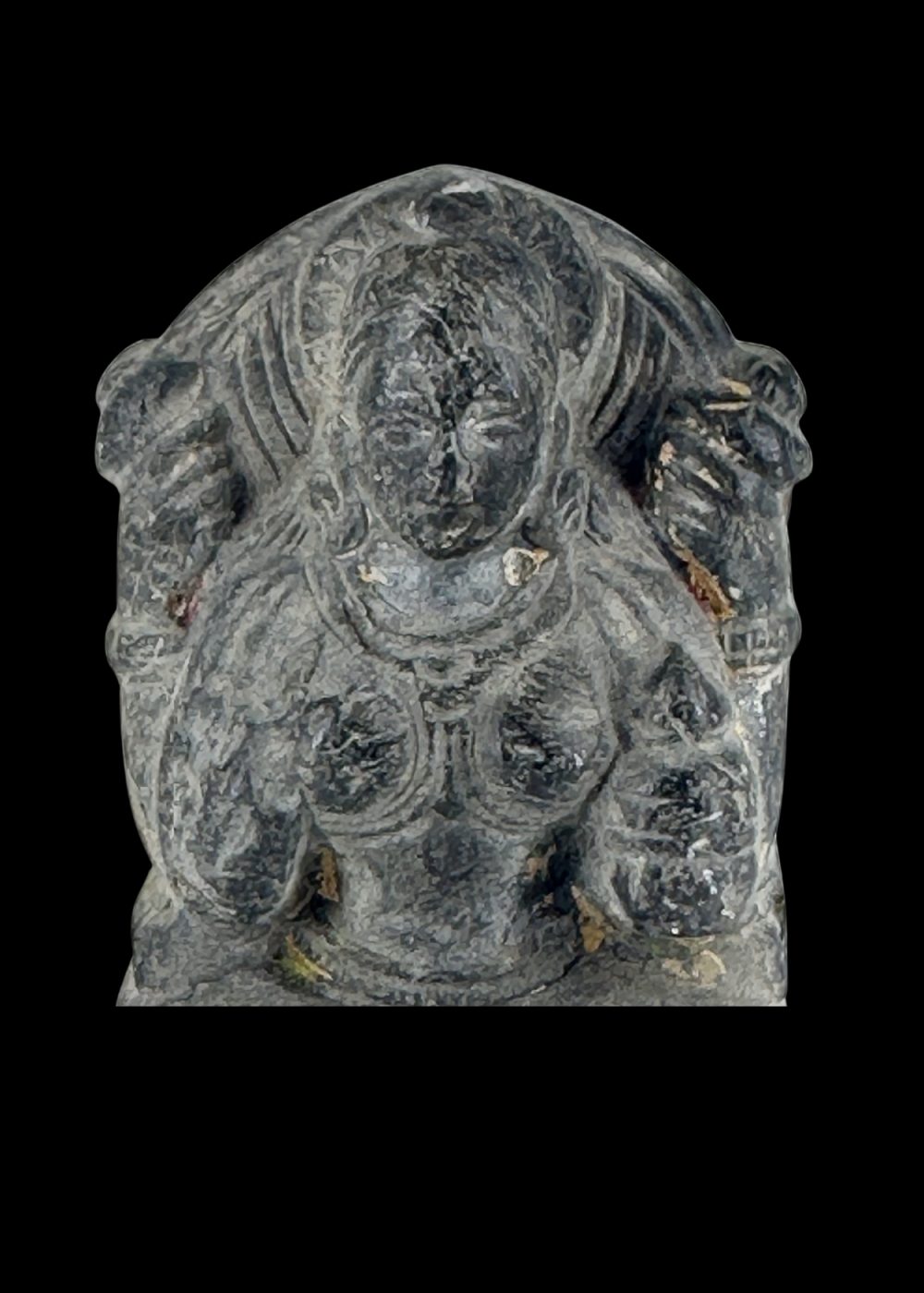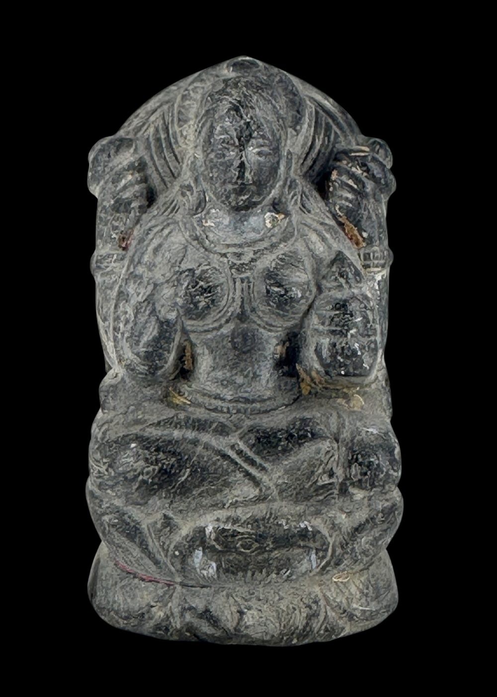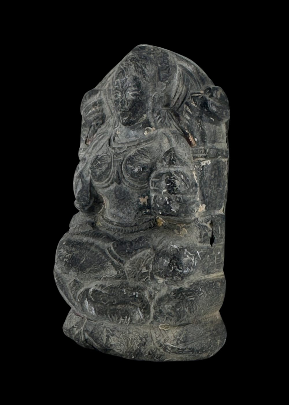 This Pala-style stone sculpture from 11th–12th century Bihar exemplifies the refined craftsmanship and deep spiritual symbolism of the Pala period. Depicting a seated goddess, likely Lakshmi or a similar deity, the figure is adorned with detailed ornaments and a calm, meditative expression. The lotus base and intricate carvings reflect both artistic excellence and the devotional essence of Buddhist and Hindu traditions prevalent during the Pala dynasty.
