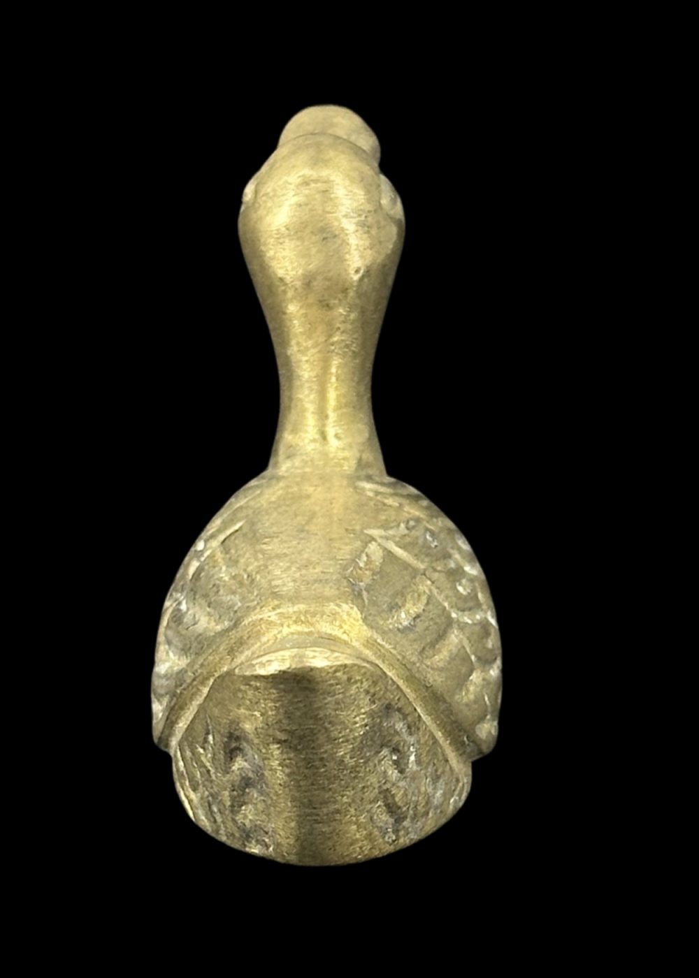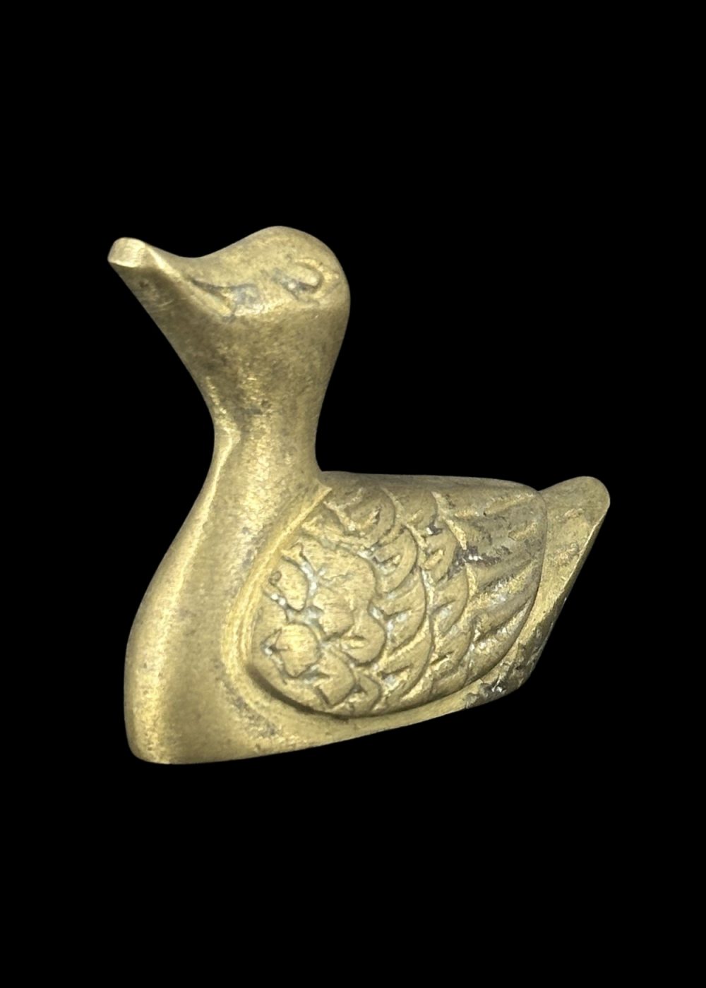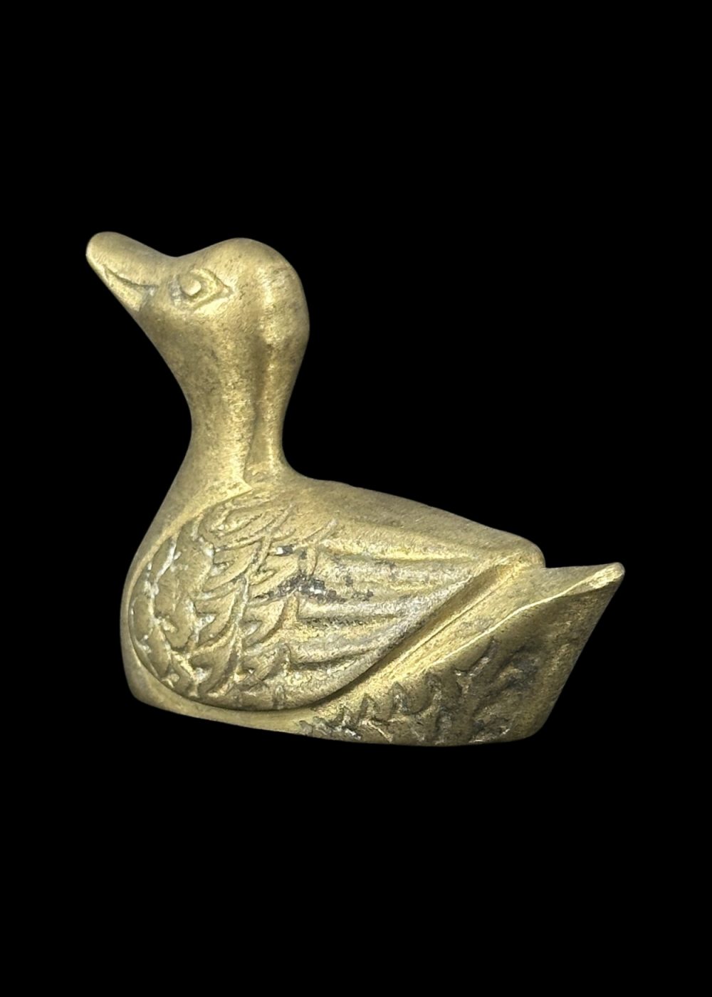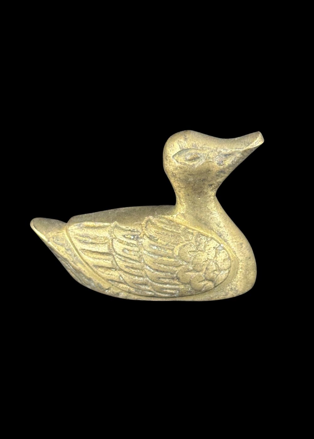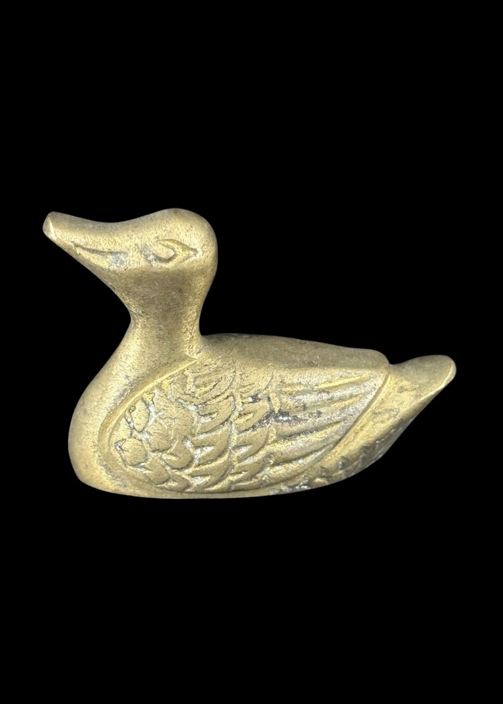 A compact brass duck figurine, seated with its head gently raised. The surface features finely engraved feather motifs across the wings and body, enhancing its lifelike texture. Finished in a warm golden tone, the piece evokes an antique charm and likely served as a decorative accent or collectible.