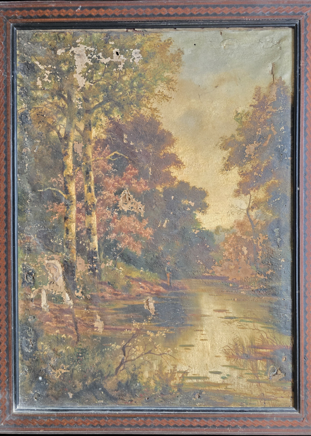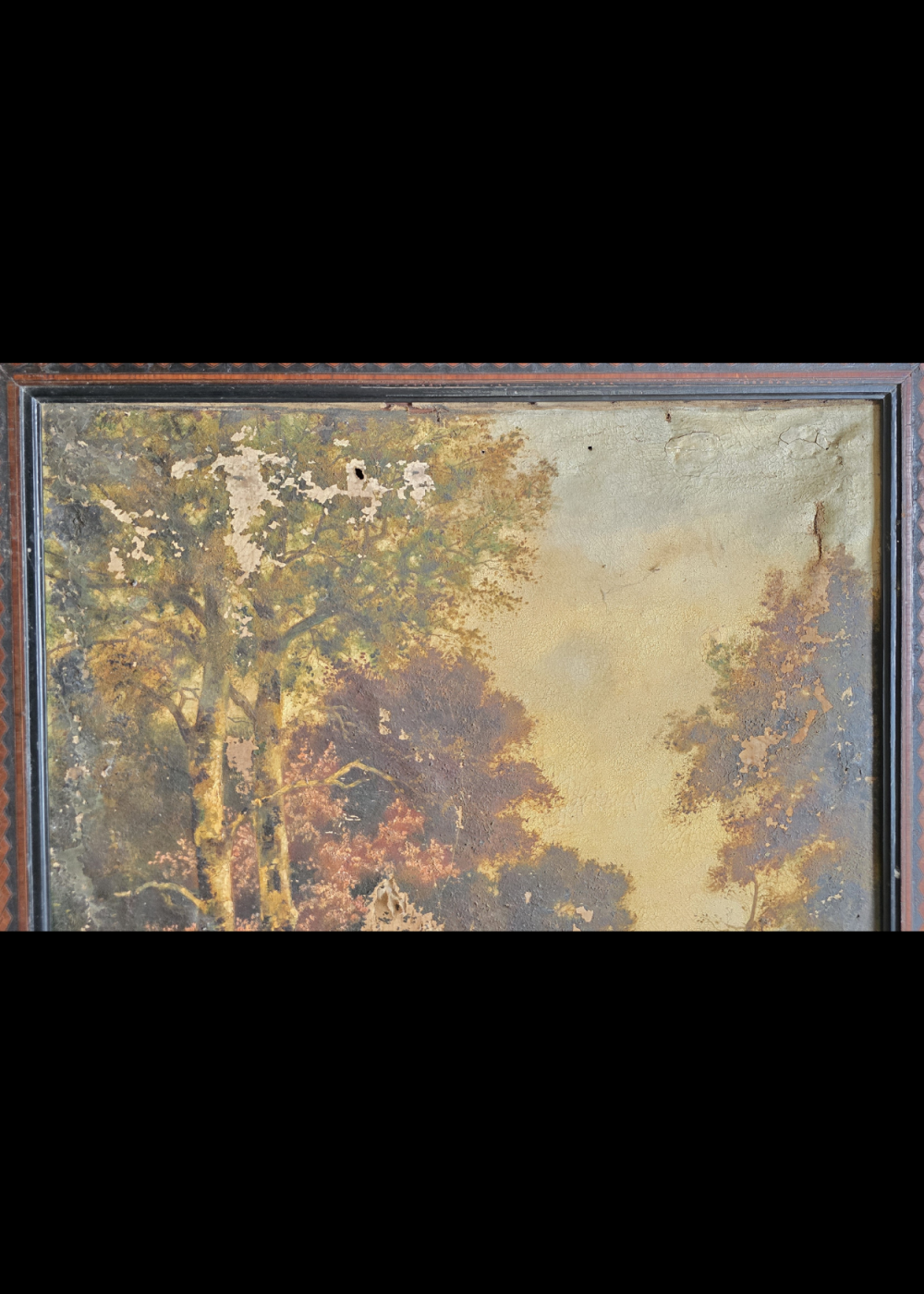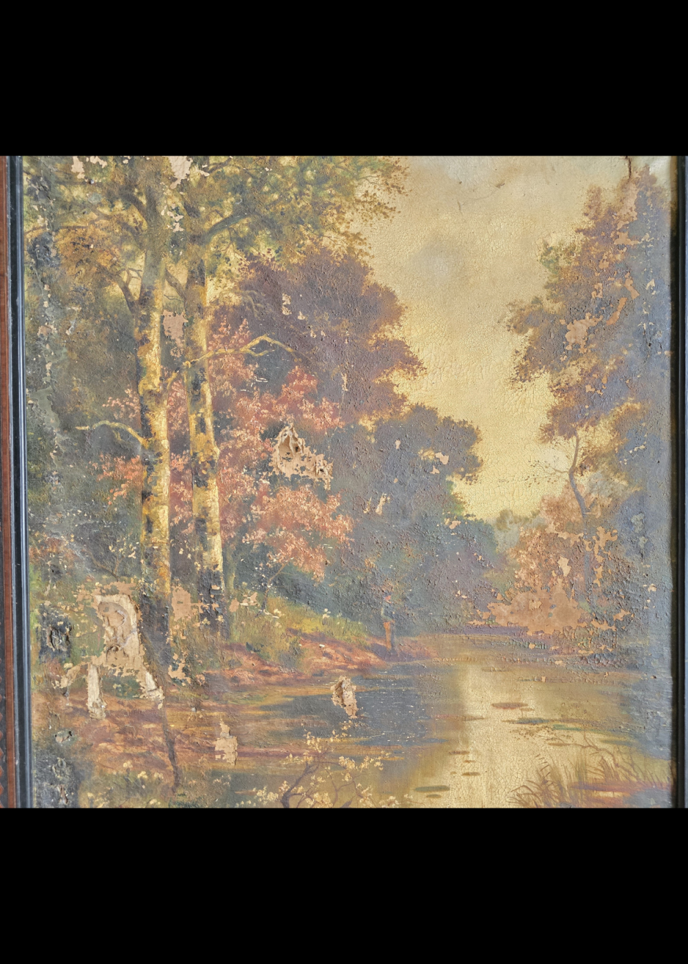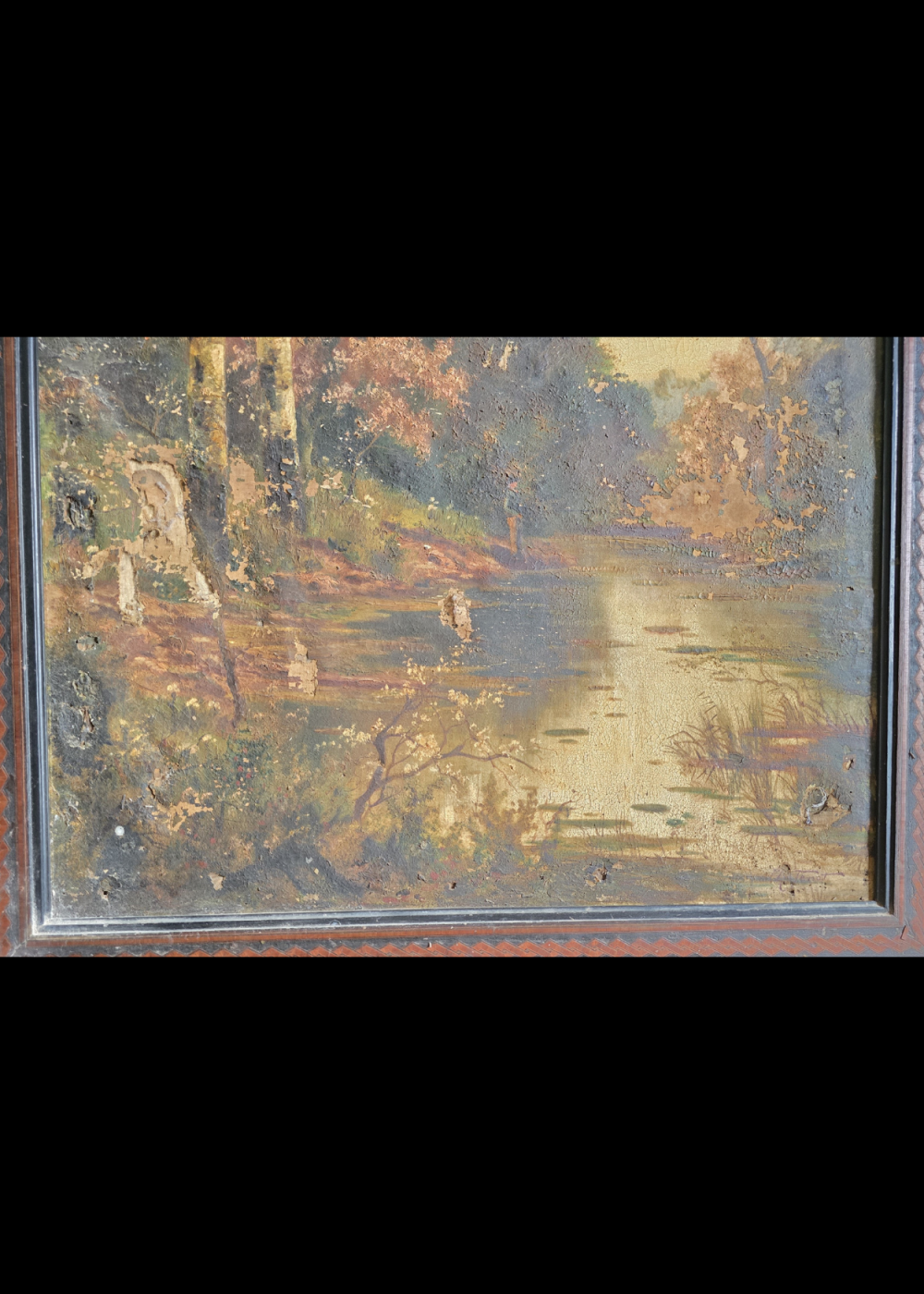 This timeworn landscape painting captures the quiet serenity of a forest stream bathed in the golden light of late afternoon. Tall trees with dappled foliage—ranging from deep greens to autumnal reds—line the water’s edge, their reflections shimmering softly on the surface. Though the painting shows significant age and paint loss, particularly in the upper canopy and lower foreground, its atmospheric beauty remains intact. The peaceful composition and delicate interplay of light evoke a sense of timeless calm, inviting the viewer to pause and reflect in nature’s embrace. Framed in a rustic wooden border with chevron detailing.