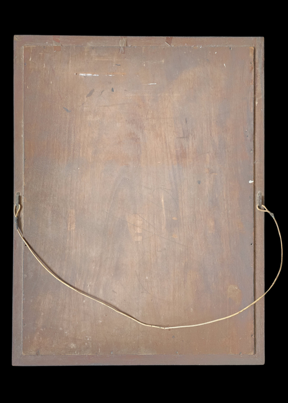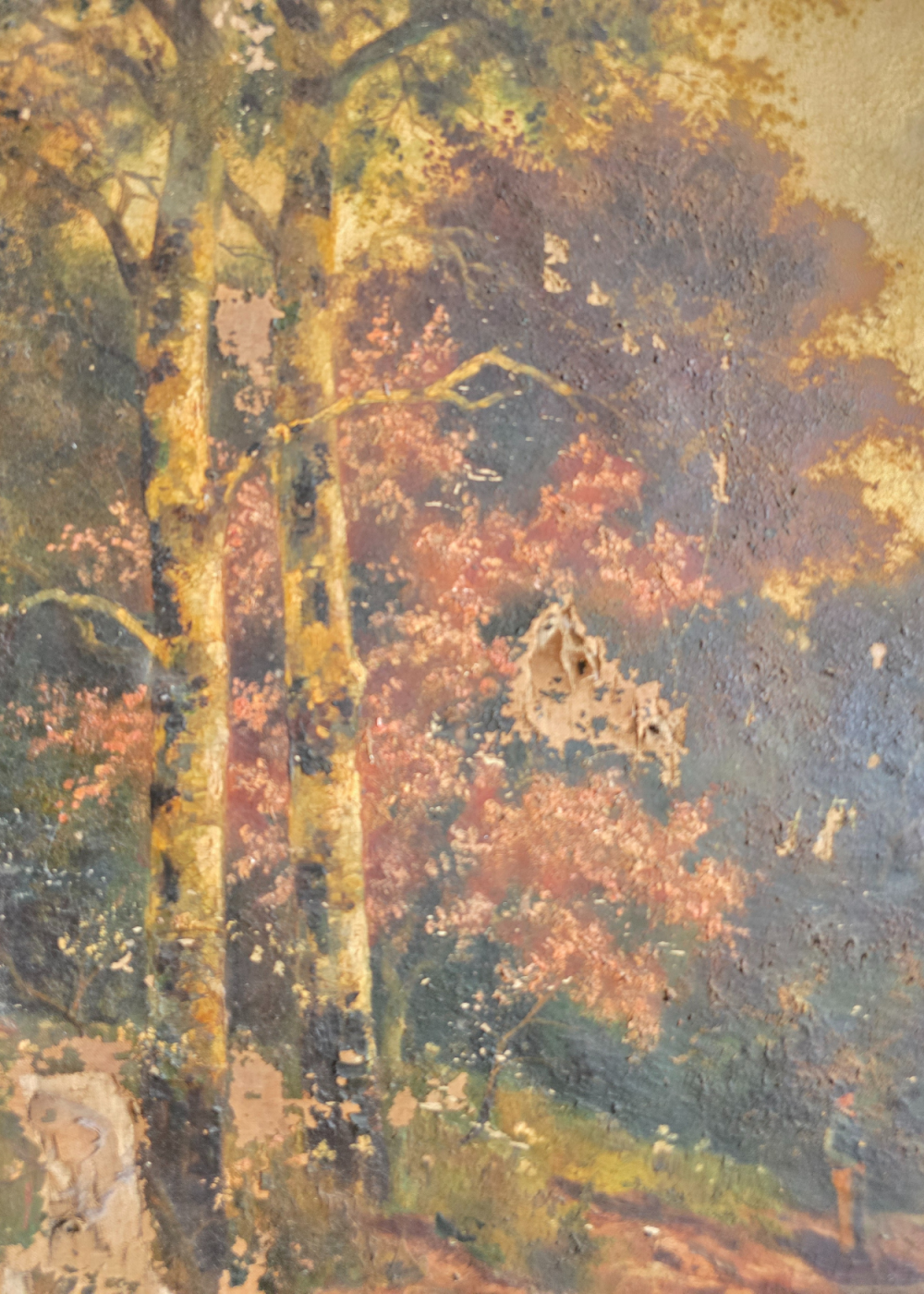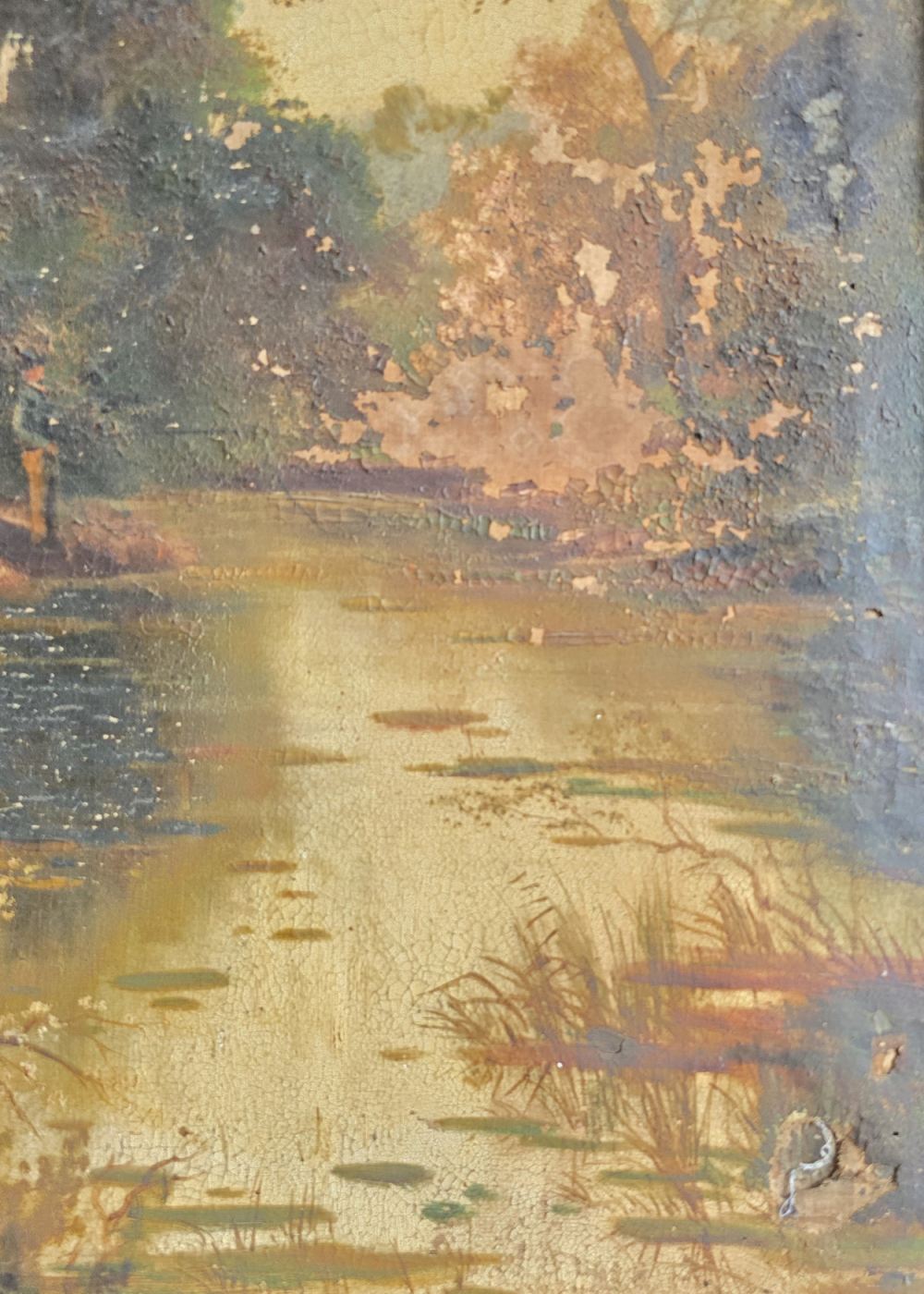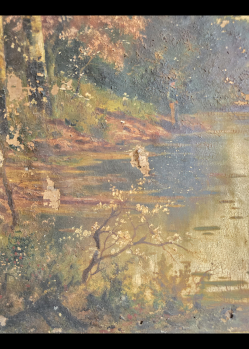 This timeworn landscape painting captures the quiet serenity of a forest stream bathed in the golden light of late afternoon. Tall trees with dappled foliage—ranging from deep greens to autumnal reds—line the water’s edge, their reflections shimmering softly on the surface. Though the painting shows significant age and paint loss, particularly in the upper canopy and lower foreground, its atmospheric beauty remains intact. The peaceful composition and delicate interplay of light evoke a sense of timeless calm, inviting the viewer to pause and reflect in nature’s embrace. Framed in a rustic wooden border with chevron detailing.