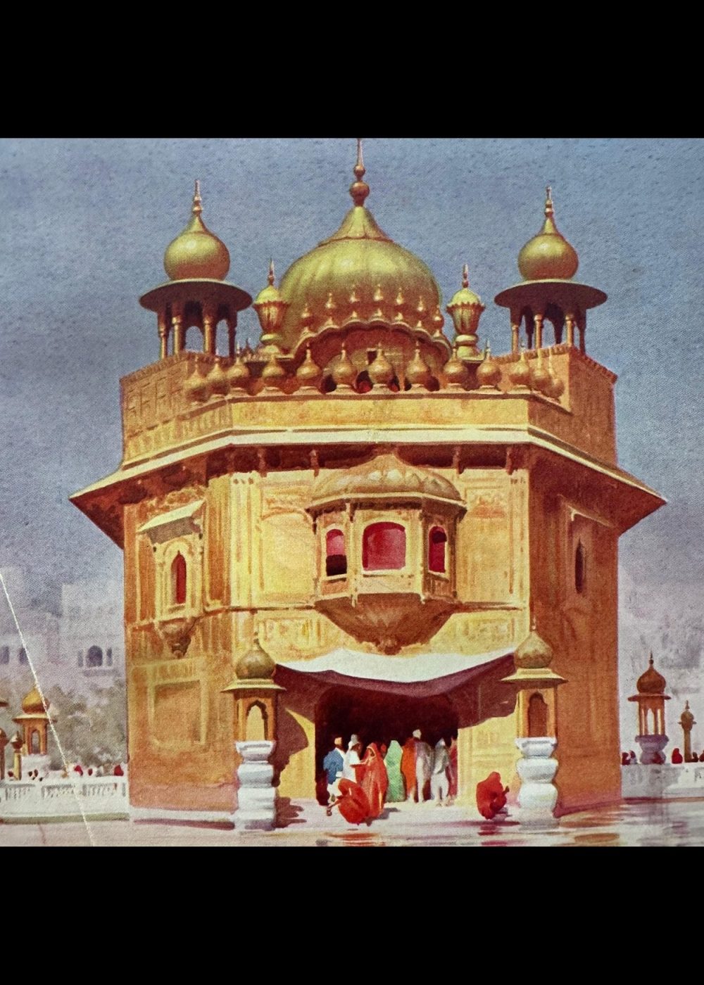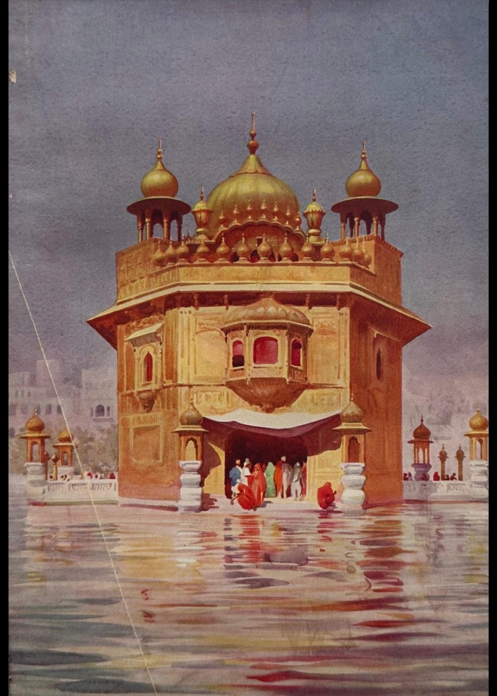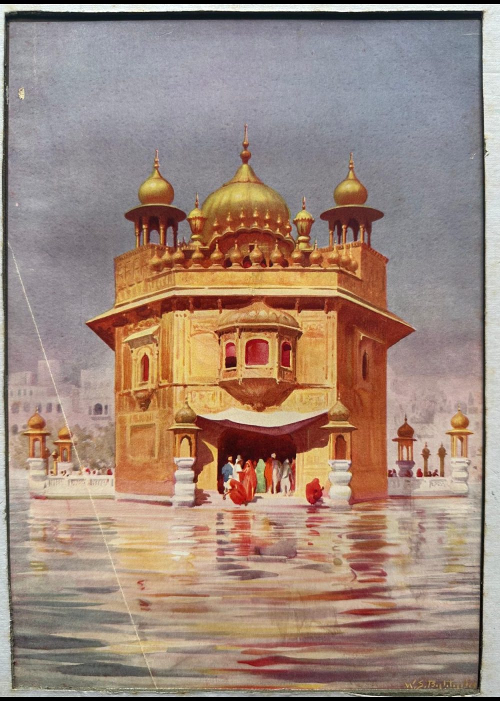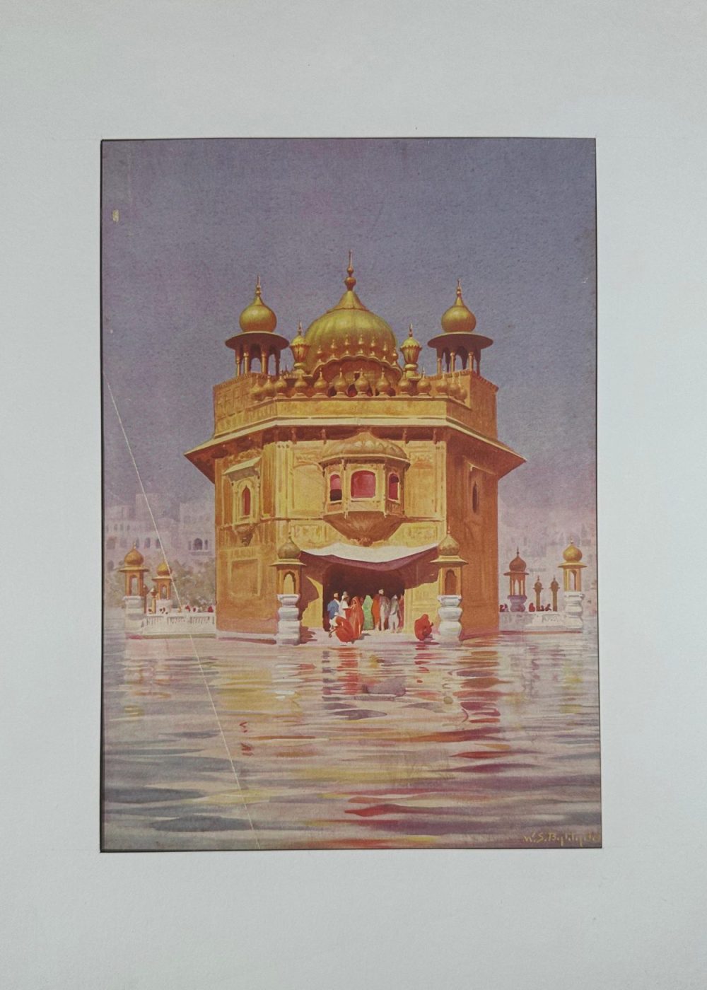 This exquisite oleograph print captures the tranquil majesty of the Golden Temple (Harmandir Sahib) in Amritsar, Punjab. Bathed in warm golden tones, the sacred Sikh shrine stands resplendent amid the Amrit Sarovar (holy water tank), its domes and intricate architecture mirrored gracefully in the still waters below. The presence of devotees entering the sanctum adds a living dimension of faith and reverence, enhancing the spiritual serenity of the scene. Through its delicate detailing and luminous palette, this vintage artwork celebrates the spiritual grandeur and architectural brilliance of one of India’s most cherished religious landmarks. The work also reflects the artistic legacy of William Spencer Bagdatopulos (WSB), the often-overlooked pioneer of early Indian advertising illustration. Active during the 1930s, Bagdatopulos transformed the conventional imagery of colonial consumerism into a world of vibrantly colored oriental exotica. His illustrations for The Times of India Annual and advertising commissions for Burmah-Shell exemplified his ability to blend commerce with culture—imbuing everyday products with allure through scenes of Hindu deities, harems, and gilded processions. His keen eye for local color and cultural nuance elevated commercial art into an expressive visual language that captured the imagination of an era.
