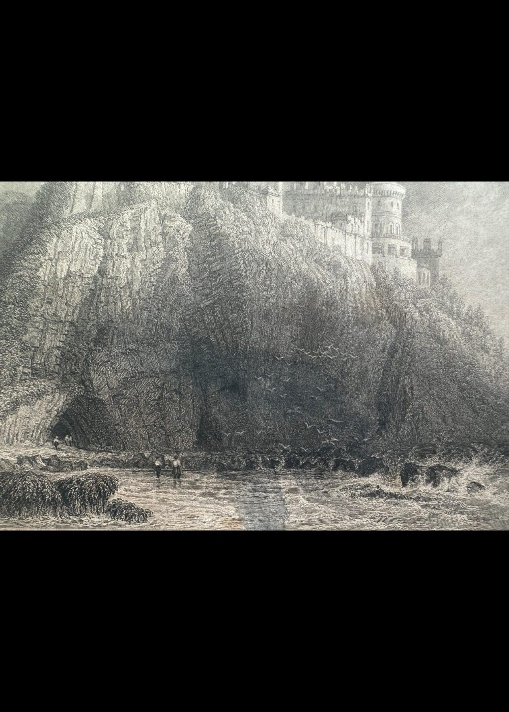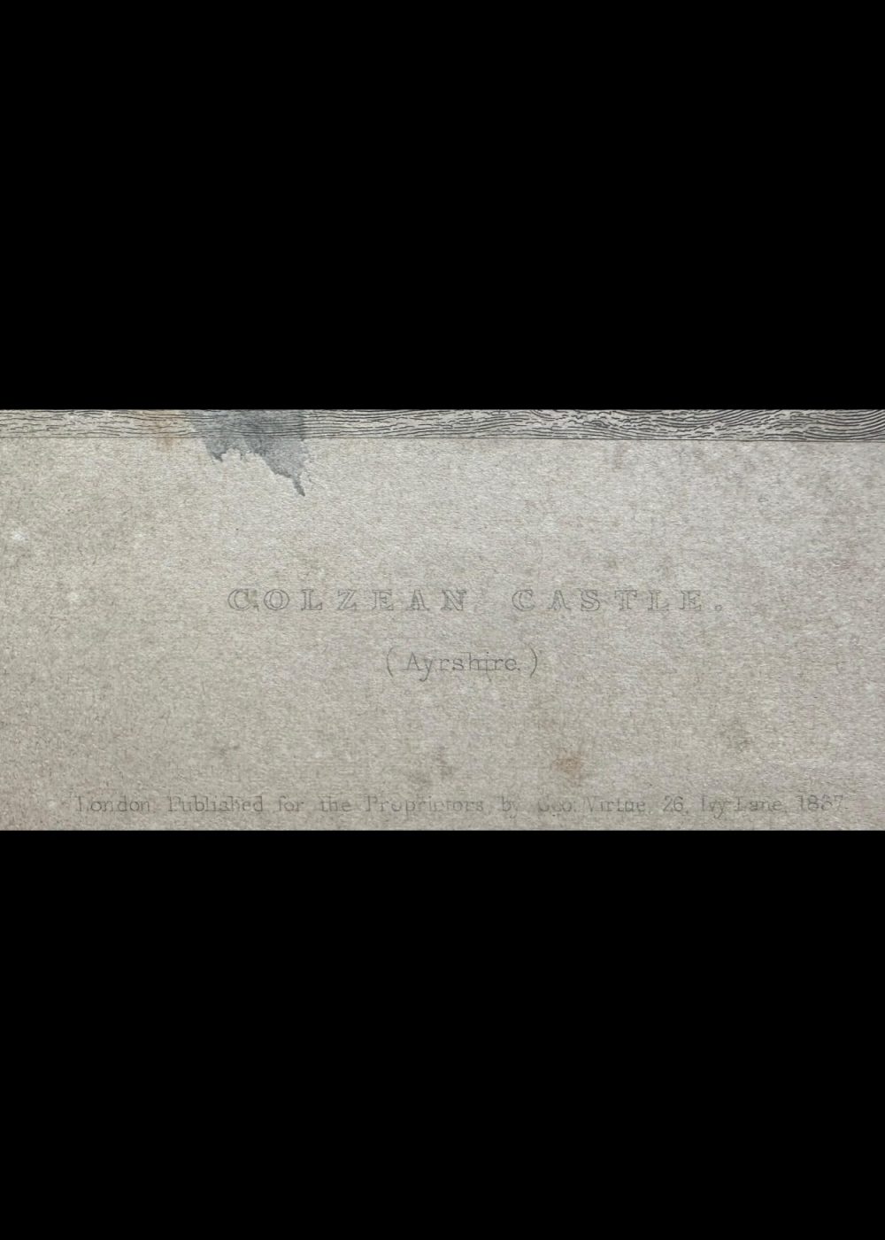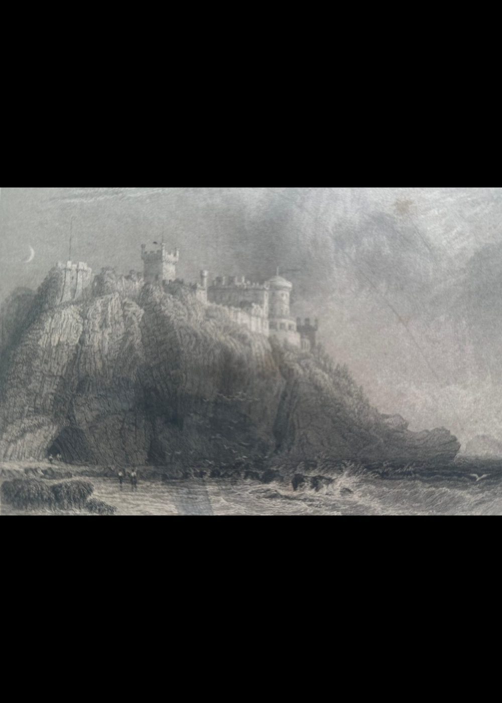 Carved into the rugged coastline of Ayrshire, Colzean Castle stands sentinel over the tumultuous sea—its towers rising in stark contrast to the jagged cliff it crowns. Rendered with the precision of 19th-century engraving, the scene captures a moment of dramatic tension: storm-laden skies churn above, while waves break furiously against the rock’s base, echoing nature’s perennial contest with stone. The castle’s round tower dominates the composition, its silhouette a symbol of architectural resilience and noble lineage. Flanking battlements and smaller turrets lend visual rhythm to the fortress’s mass, anchoring it as both stronghold and stately residence. Below, human figures—possibly fishermen or weary travelers—animate the shoreline, dwarfed by the scale of the castle and the might of the ocean. Their inclusion suggests a quiet coexistence with grandeur, grounding the image in lived experience. This 1847 publication from Ivy Lane embodies Victorian romanticism, where landscapes were seen as mirrors of mood and heritage. The engraving’s textured lines and tonal depth underscore not only the artistic finesse of the medium but also the historical prestige of Colzean itself—a castle steeped in regional lore and framed by nature’s wild drama.