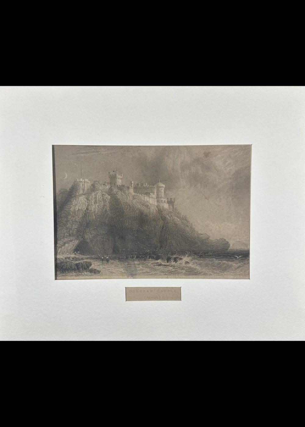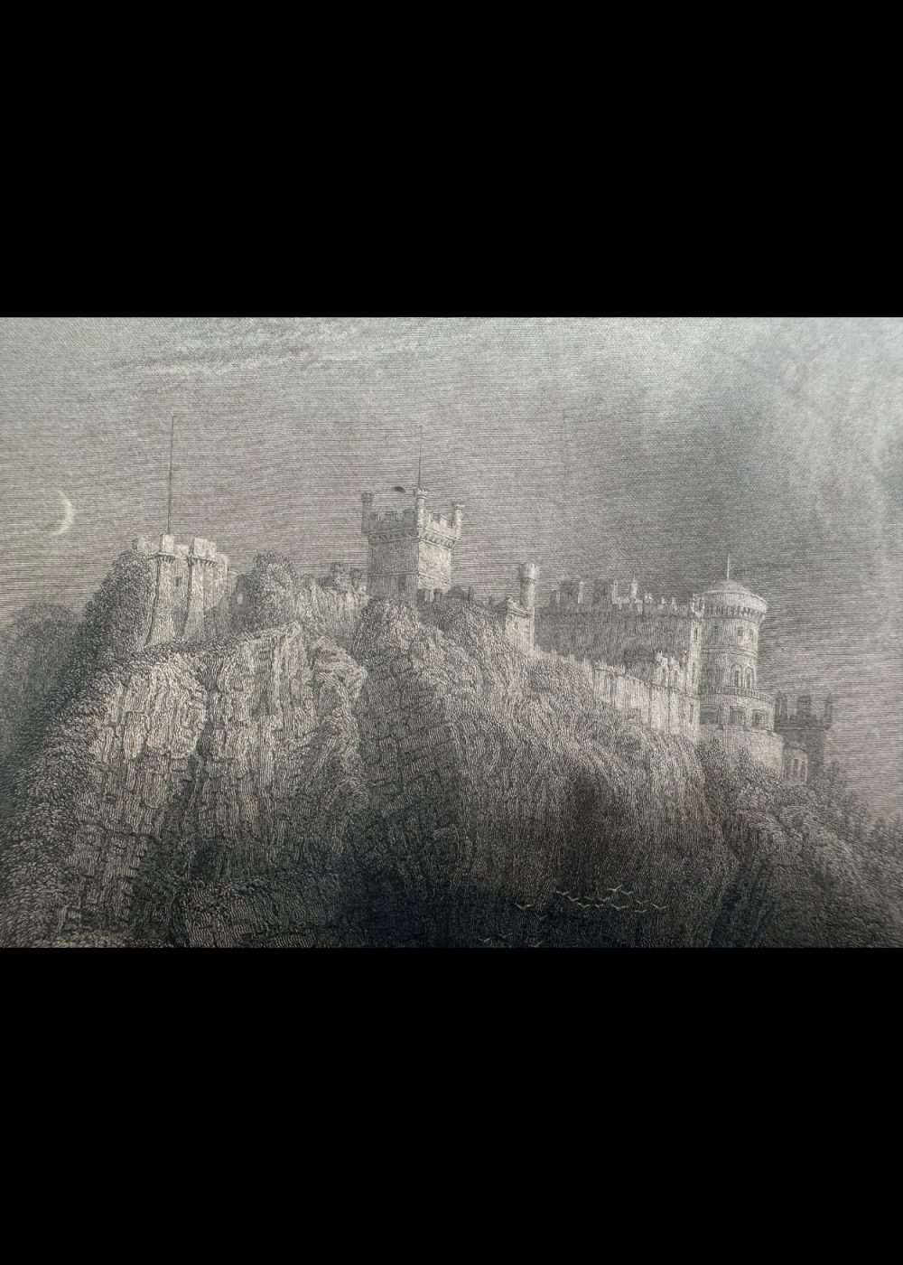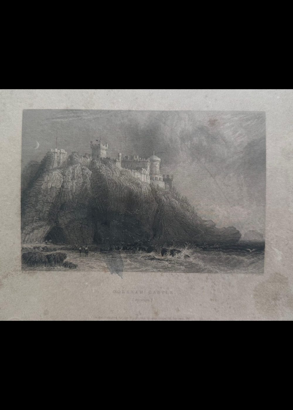 Carved into the rugged coastline of Ayrshire, Colzean Castle stands sentinel over the tumultuous sea—its towers rising in stark contrast to the jagged cliff it crowns. Rendered with the precision of 19th-century engraving, the scene captures a moment of dramatic tension: storm-laden skies churn above, while waves break furiously against the rock’s base, echoing nature’s perennial contest with stone. The castle’s round tower dominates the composition, its silhouette a symbol of architectural resilience and noble lineage. Flanking battlements and smaller turrets lend visual rhythm to the fortress’s mass, anchoring it as both stronghold and stately residence. Below, human figures—possibly fishermen or weary travelers—animate the shoreline, dwarfed by the scale of the castle and the might of the ocean. Their inclusion suggests a quiet coexistence with grandeur, grounding the image in lived experience. This 1847 publication from Ivy Lane embodies Victorian romanticism, where landscapes were seen as mirrors of mood and heritage. The engraving’s textured lines and tonal depth underscore not only the artistic finesse of the medium but also the historical prestige of Colzean itself—a castle steeped in regional lore and framed by nature’s wild drama.