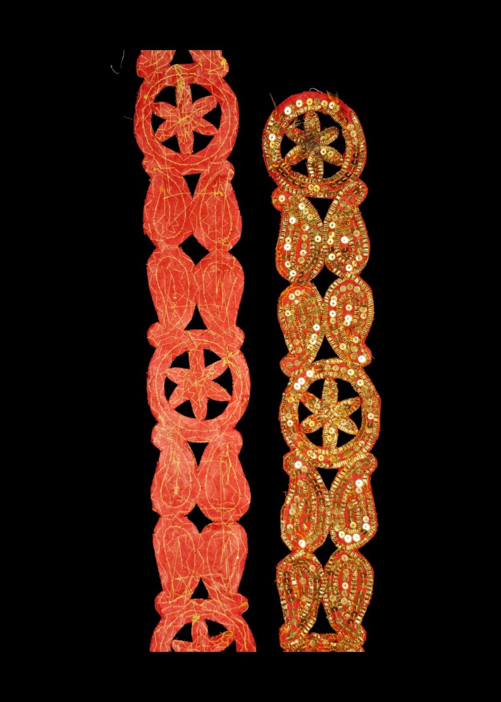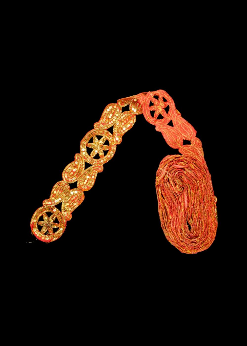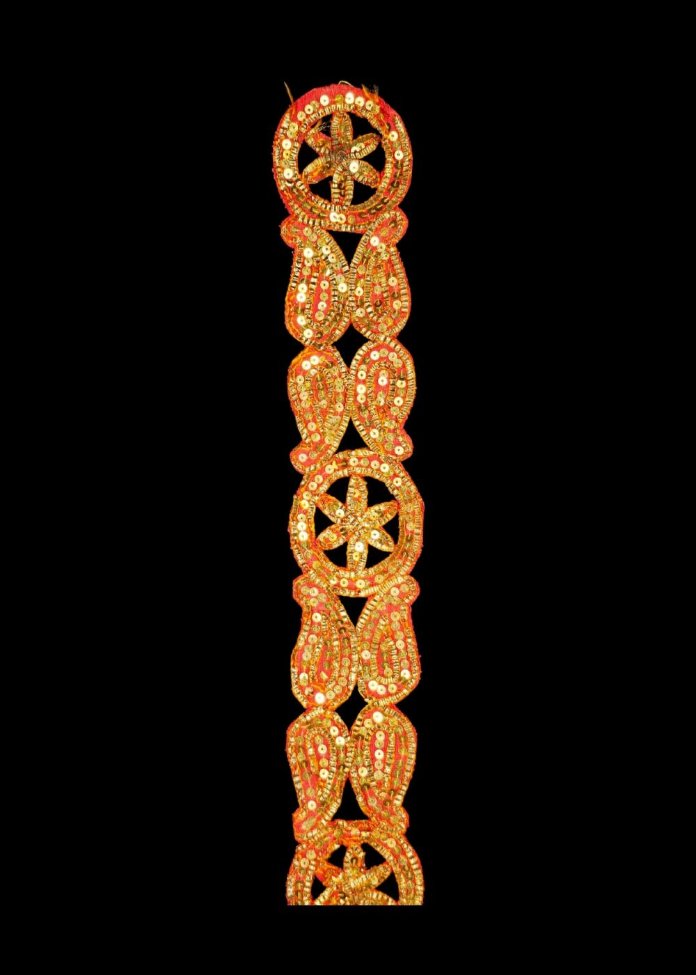 This exquisite real gotta border showcases intricate cut work craftsmanship in vibrant shades of gold and red. Embellished with delicate sequins and metallic threads, it reflects the traditional artistry of Indian embroidery. Ideal for enhancing sarees, lehengas, and dupattas, this handcrafted border adds a regal and festive touch to any attire.