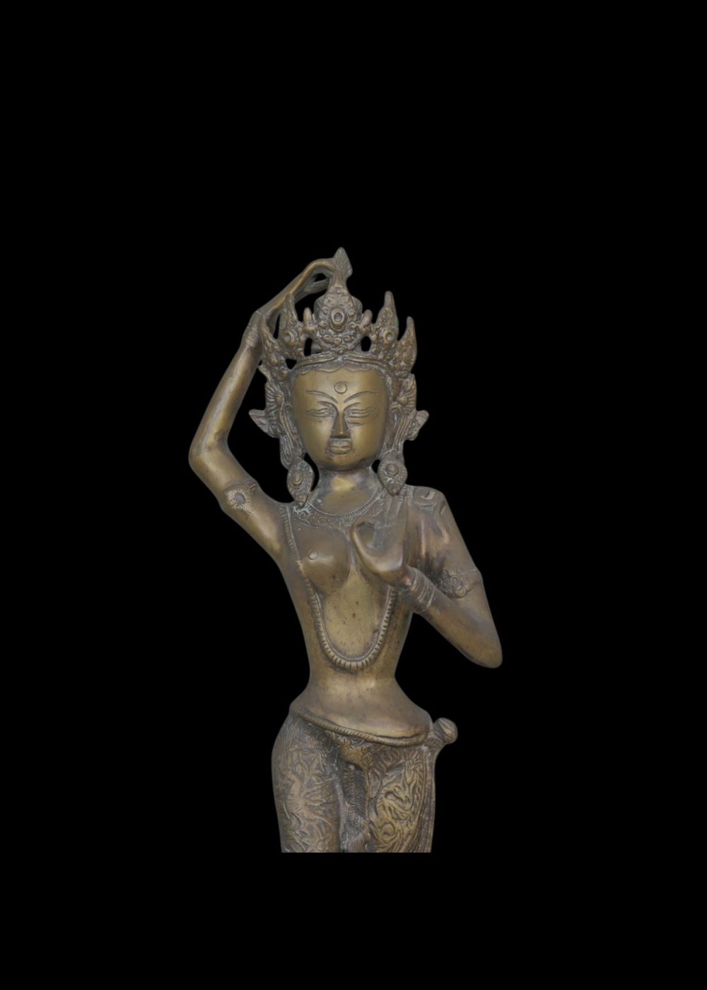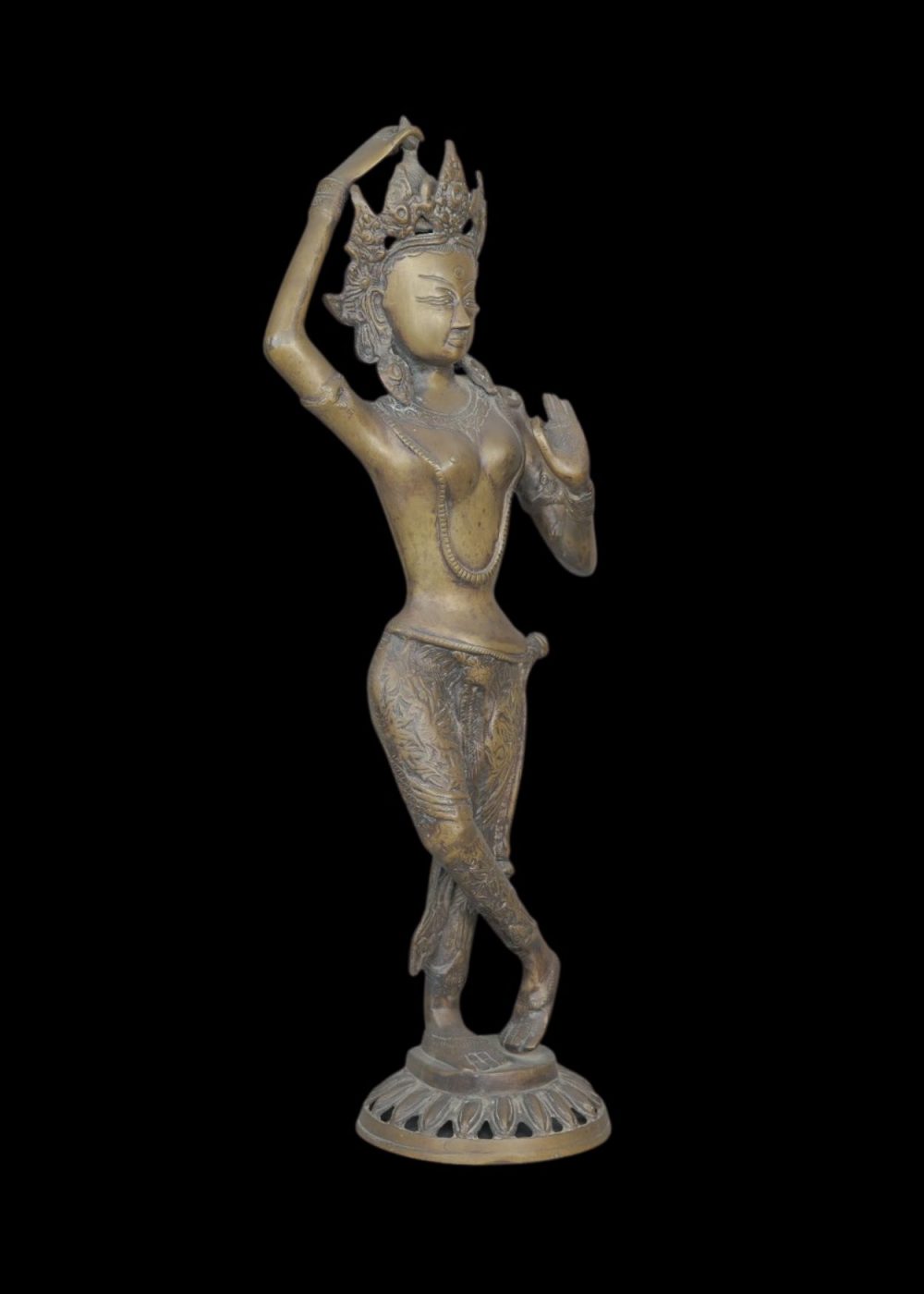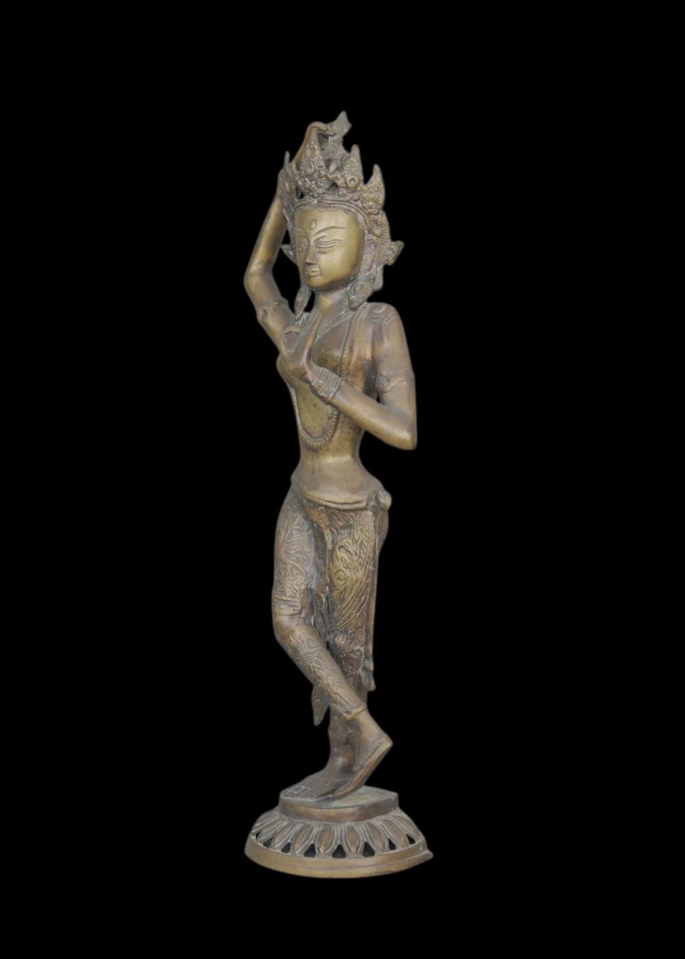 This elegant bronze sculpture represents Tara, the revered Buddhist goddess of compassion and protection. Crafted with intricate detail, she stands in a graceful tribhanga pose atop a lotus pedestal, symbolizing spiritual purity. The serene expression, elaborate crown, and finely engraved garments reflect traditional Himalayan artistry. Tara’s raised hand forms a gesture of blessing and reassurance, embodying divine grace and feminine energy.