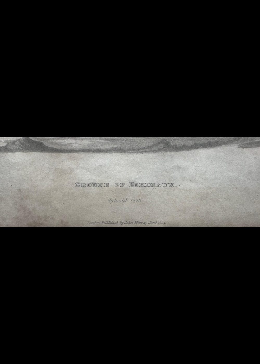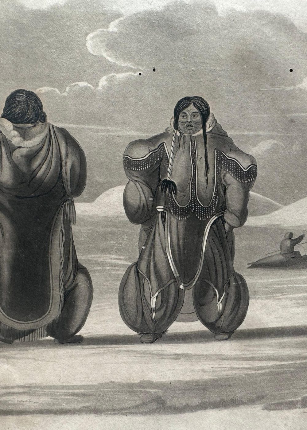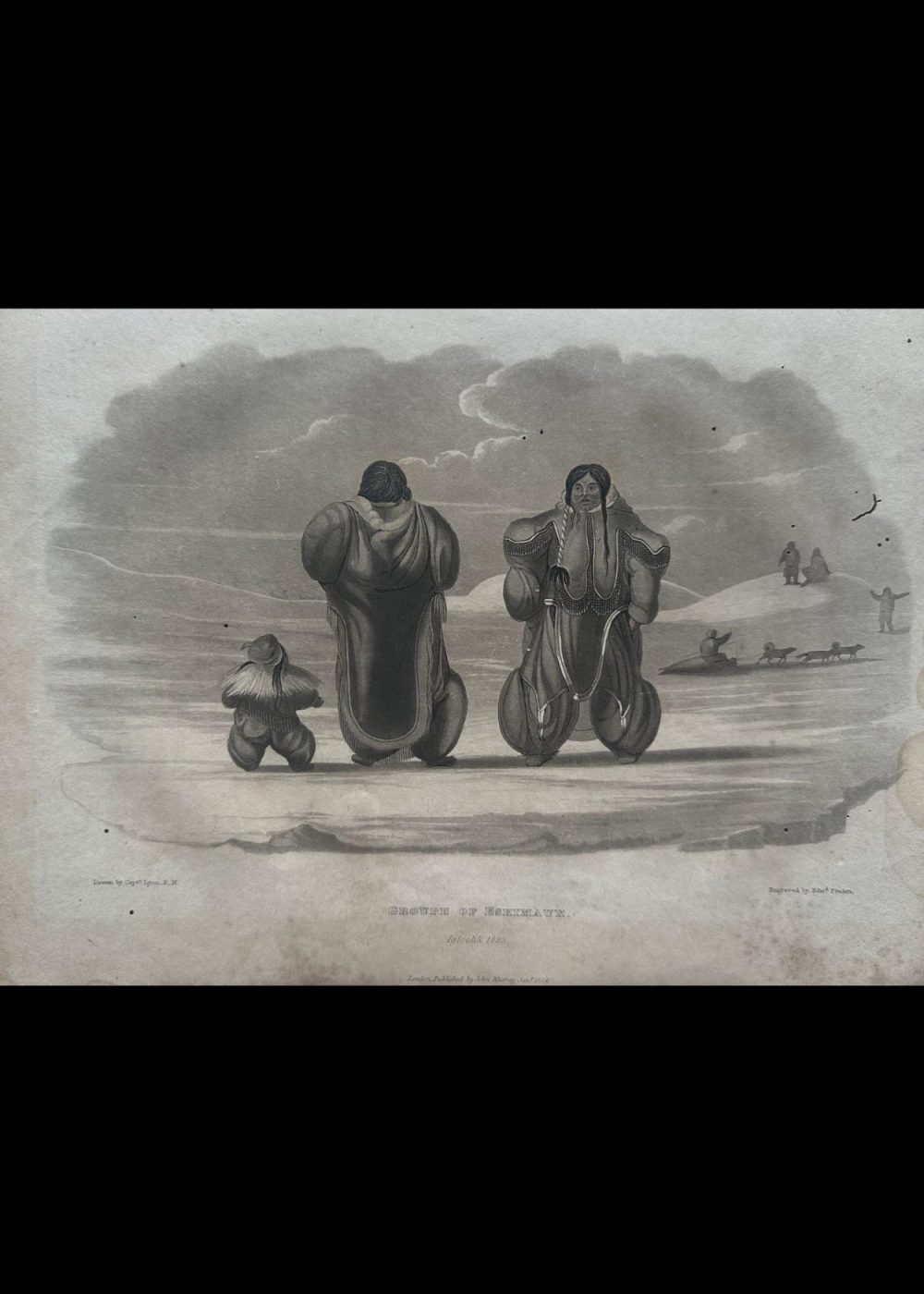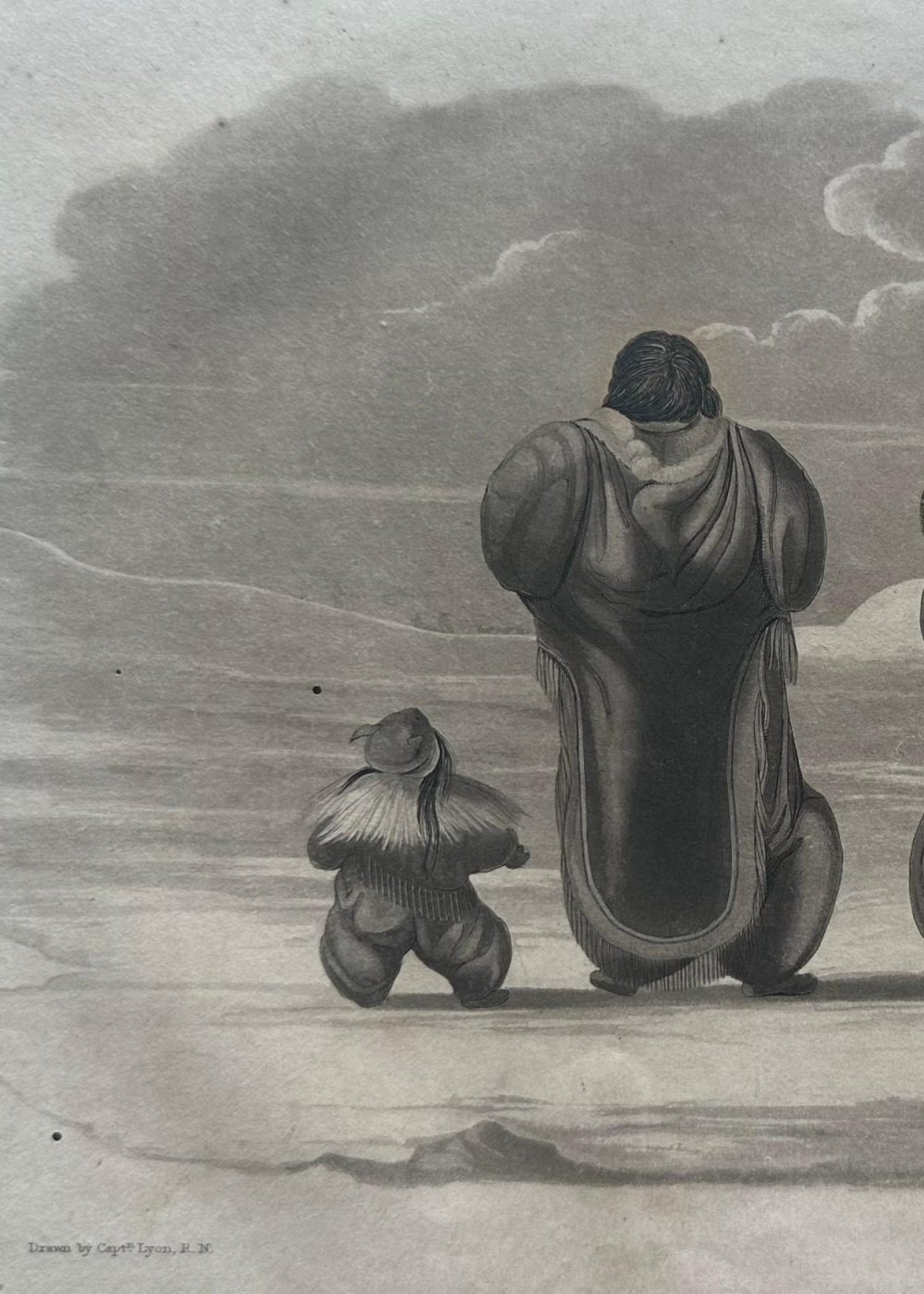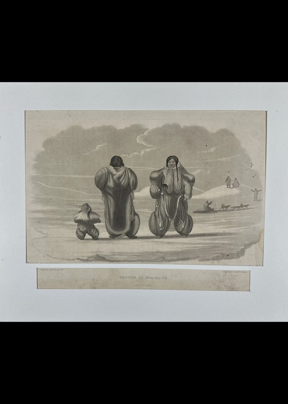 This expressive engraving, drawn by Captain Lyon R.N. and engraved by Edward Finden, depicts a family group of Inuit (Esquimaux) figures in traditional Arctic clothing at Igloolik in 1822. The figures, including a man, woman, and child, are dressed in voluminous fur garments adapted for extreme cold, their postures calm and dignified. In the background, a sled team, scattered individuals, and snow-covered terrain complete the setting, illustrating daily life in the Arctic. The artwork serves as a respectful visual record of Inuit culture and community during early 19th-century exploration.