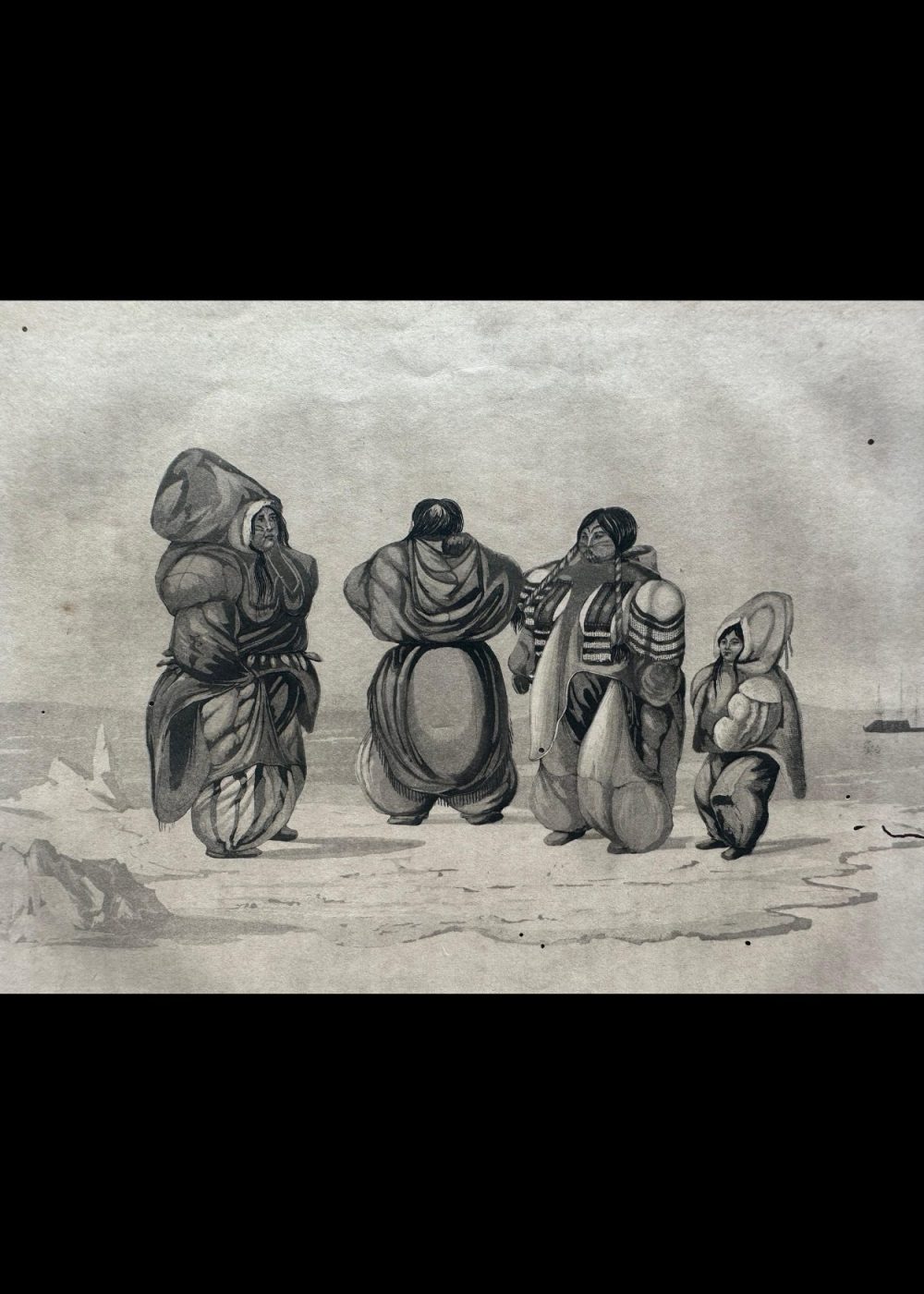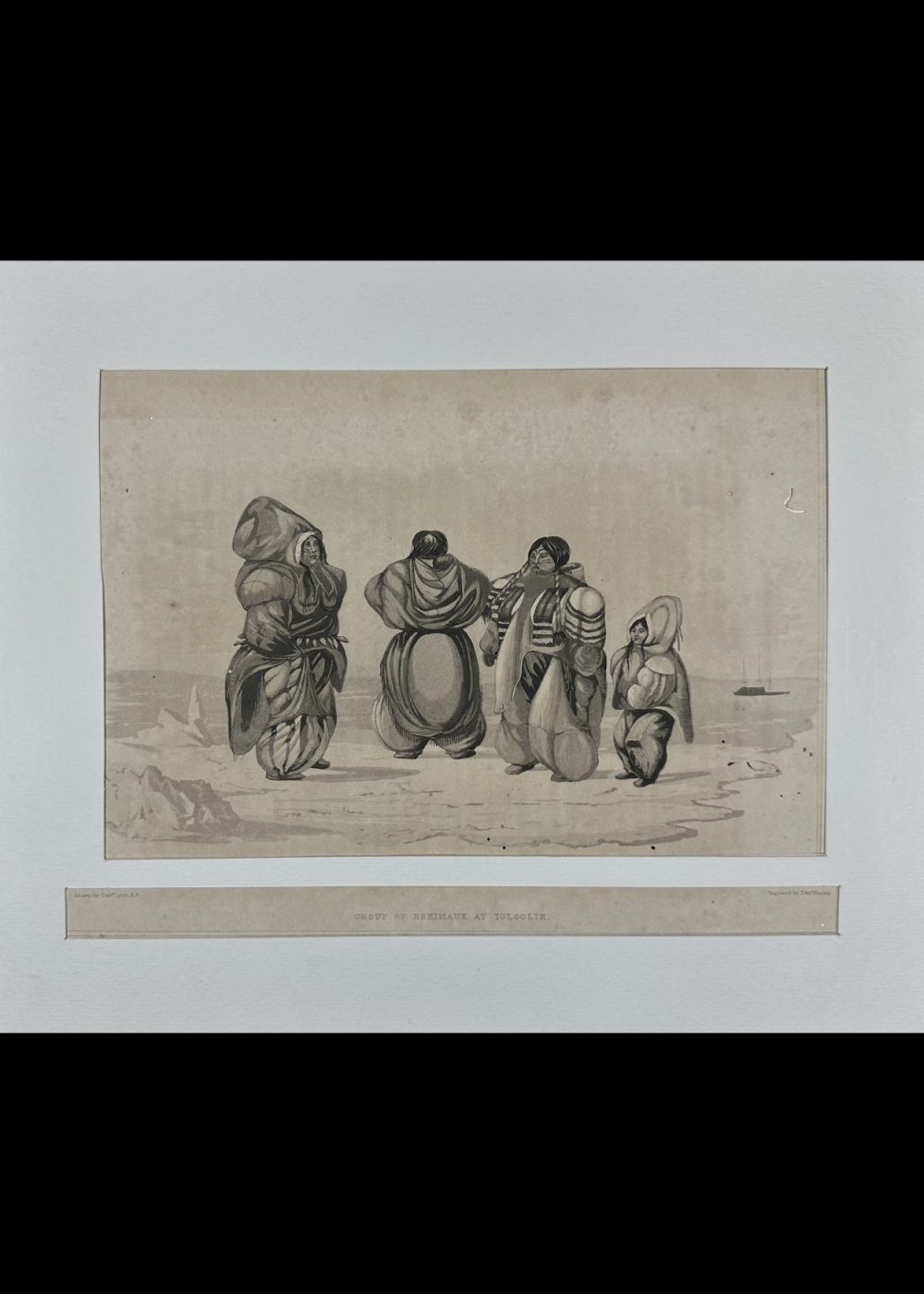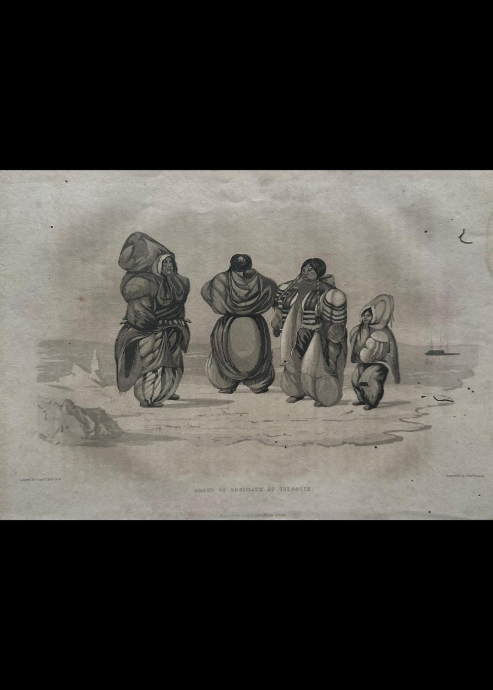 This engraving, drawn by Captain Lyon R.N. and engraved by Edward Finden, presents a vivid scene of daily Inuit (Esquimaux) life in Igloolik. A group of five figures, including men, women, and a child, stand together dressed in traditional, thickly padded garments suited for the harsh Arctic climate. Their postures and expressions convey a sense of community and conversation. In the background, the silhouette of a ship hints at the presence of European explorers. The image captures both the resilience and cultural richness of Inuit society during early 19th-century exploration in the North.