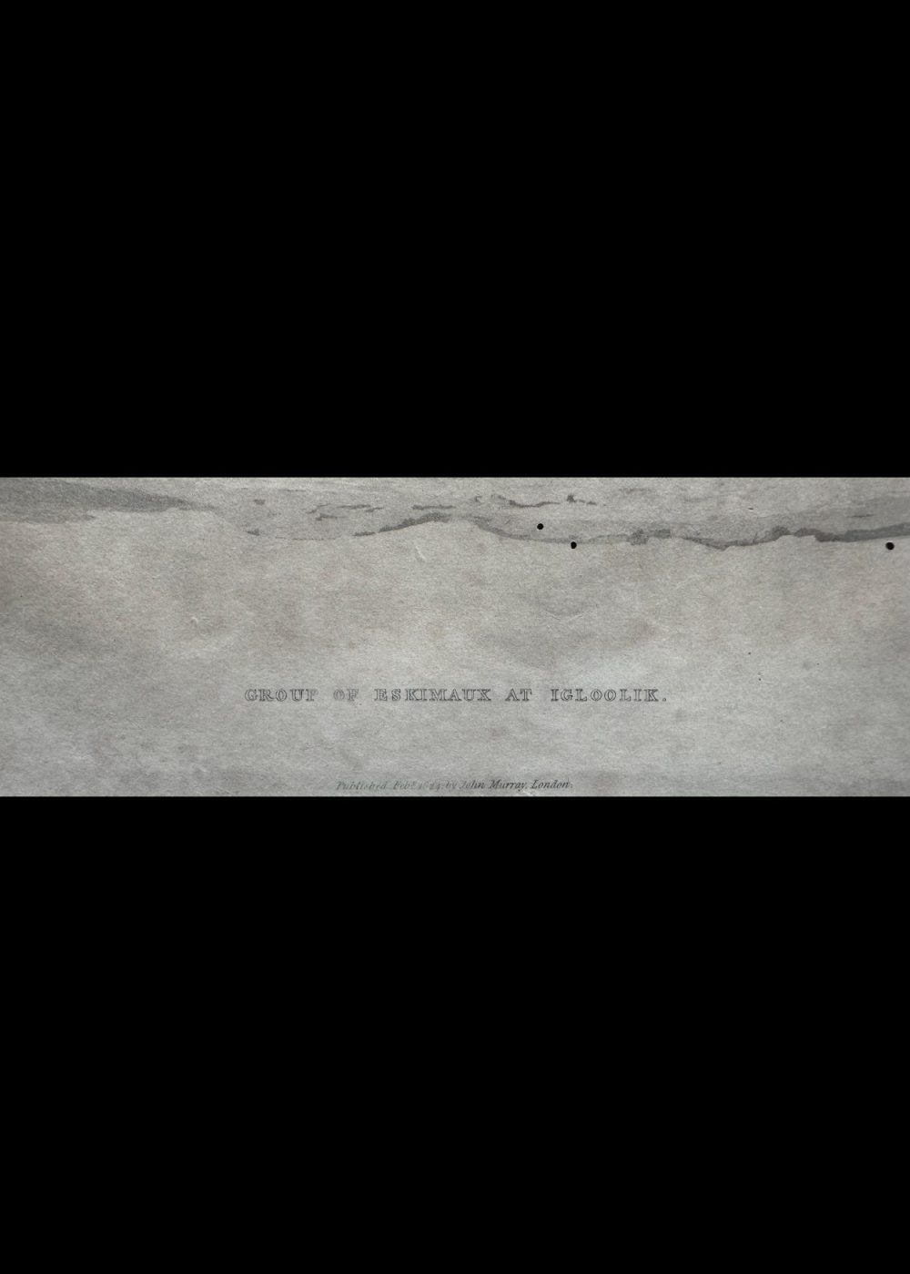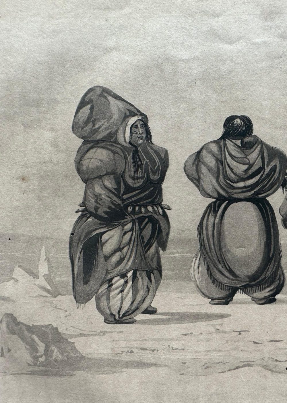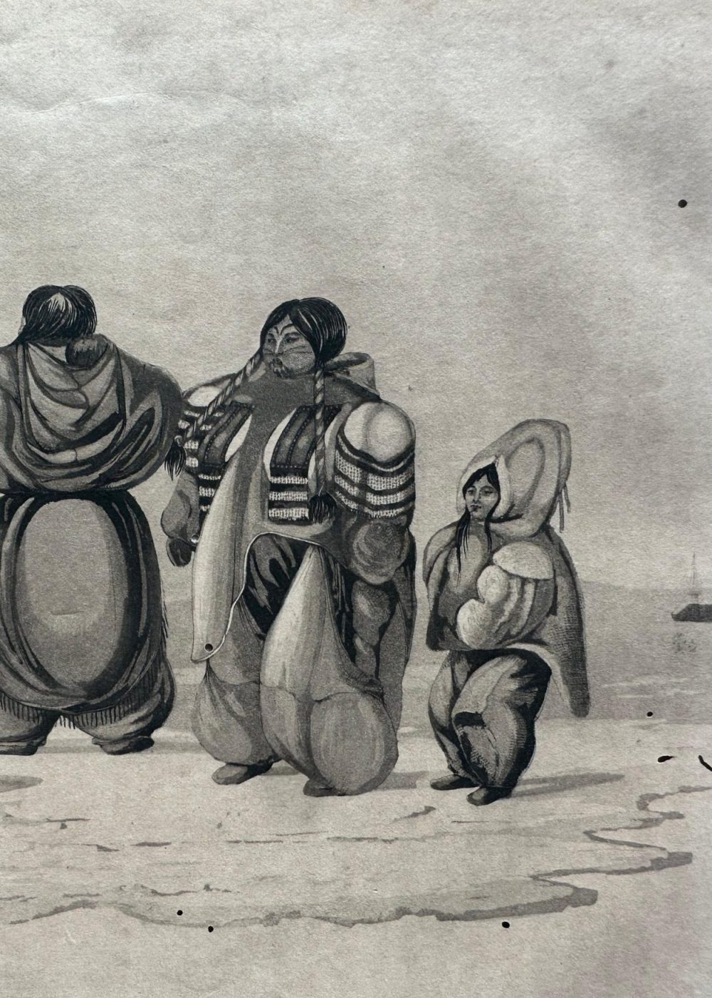 This engraving, drawn by Captain Lyon R.N. and engraved by Edward Finden, presents a vivid scene of daily Inuit (Esquimaux) life in Igloolik. A group of five figures, including men, women, and a child, stand together dressed in traditional, thickly padded garments suited for the harsh Arctic climate. Their postures and expressions convey a sense of community and conversation. In the background, the silhouette of a ship hints at the presence of European explorers. The image captures both the resilience and cultural richness of Inuit society during early 19th-century exploration in the North.