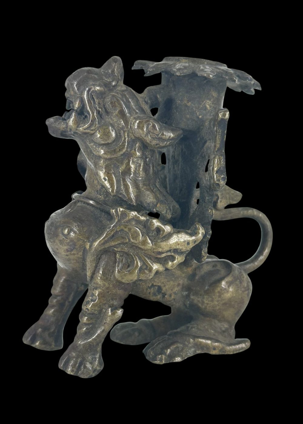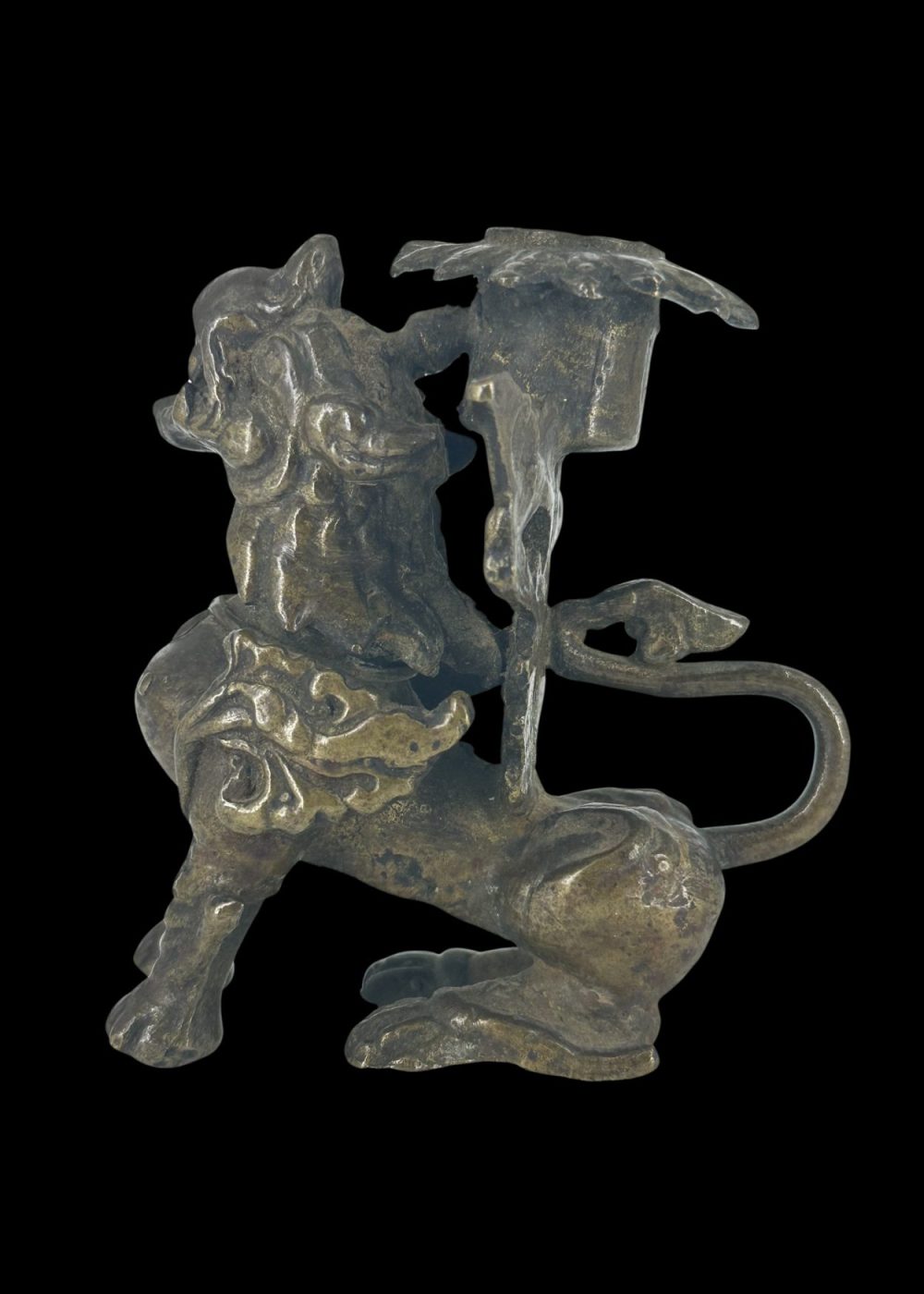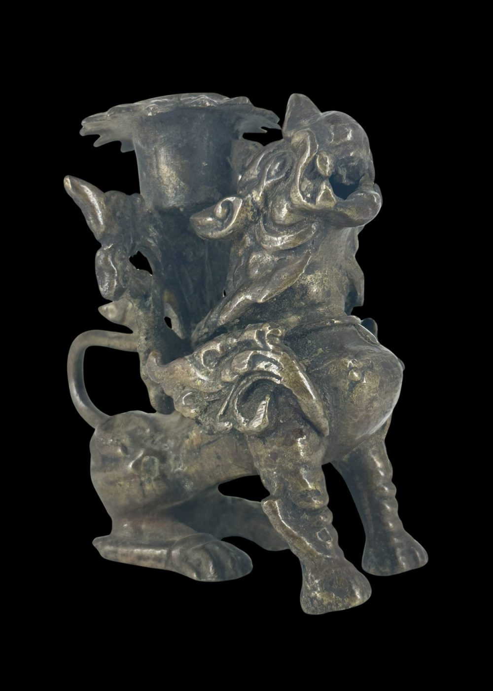 This dynamic bronze candle holder from Nepal is crafted in the form of a mythical guardian creature—likely a lion or dragon—poised mid-stride. Richly detailed with a flowing mane and sinuous tail, the figure supports a floral candle mount atop its back. Combining functional design with protective symbolism, it reflects Nepalese artisanship steeped in ritual and folklore.