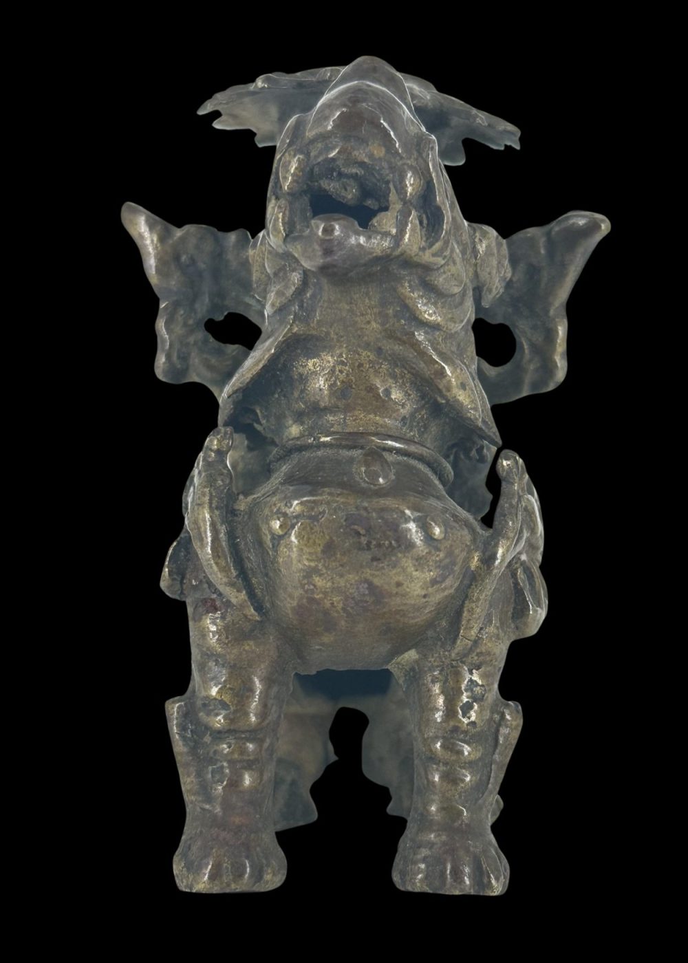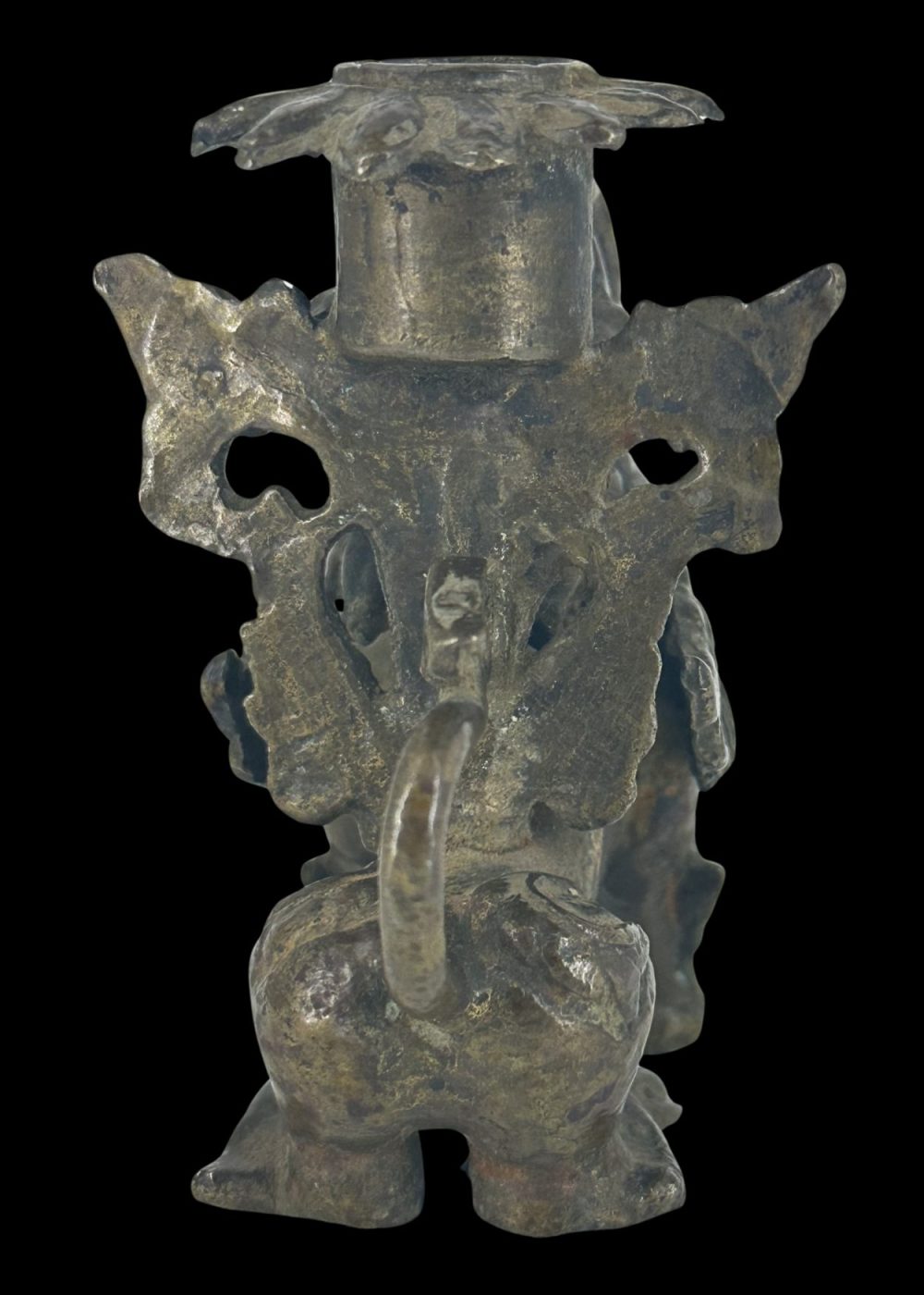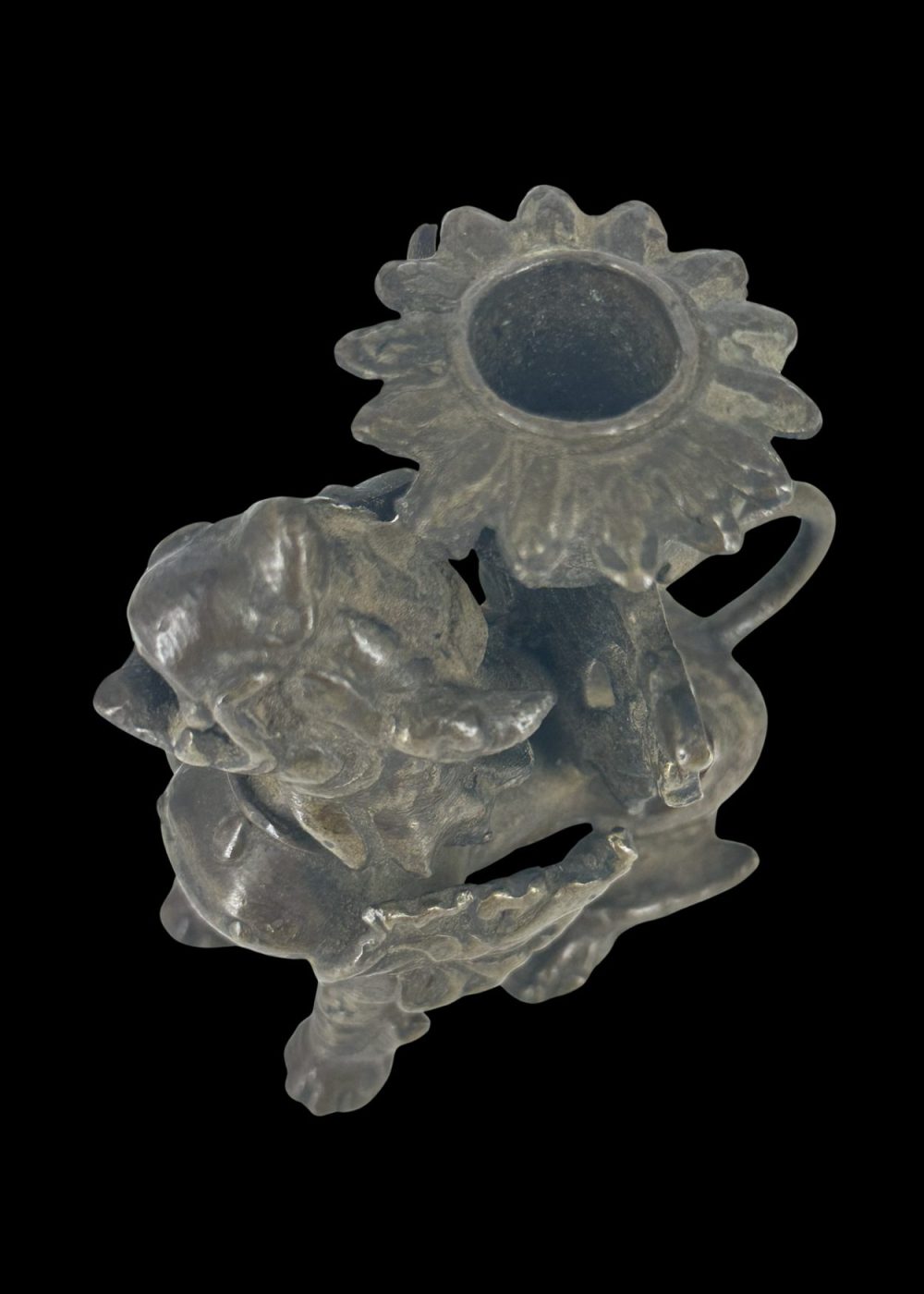 This dynamic bronze candle holder from Nepal is crafted in the form of a mythical guardian creature—likely a lion or dragon—poised mid-stride. Richly detailed with a flowing mane and sinuous tail, the figure supports a floral candle mount atop its back. Combining functional design with protective symbolism, it reflects Nepalese artisanship steeped in ritual and folklore.