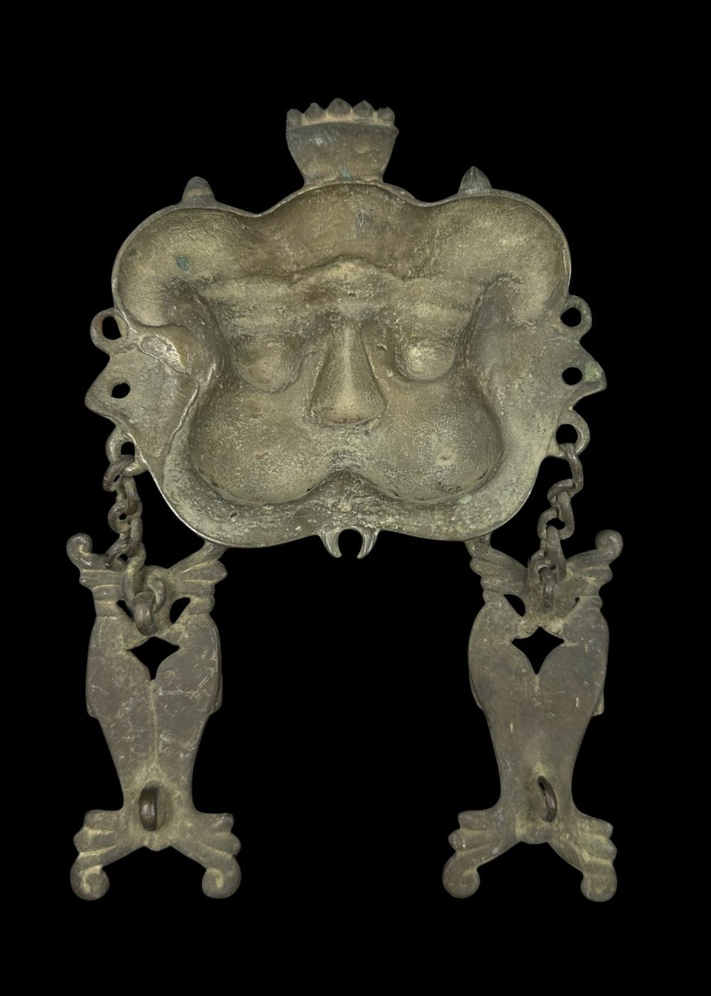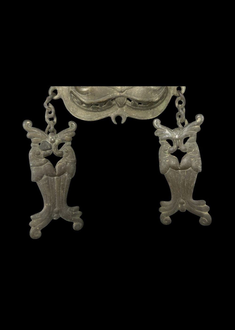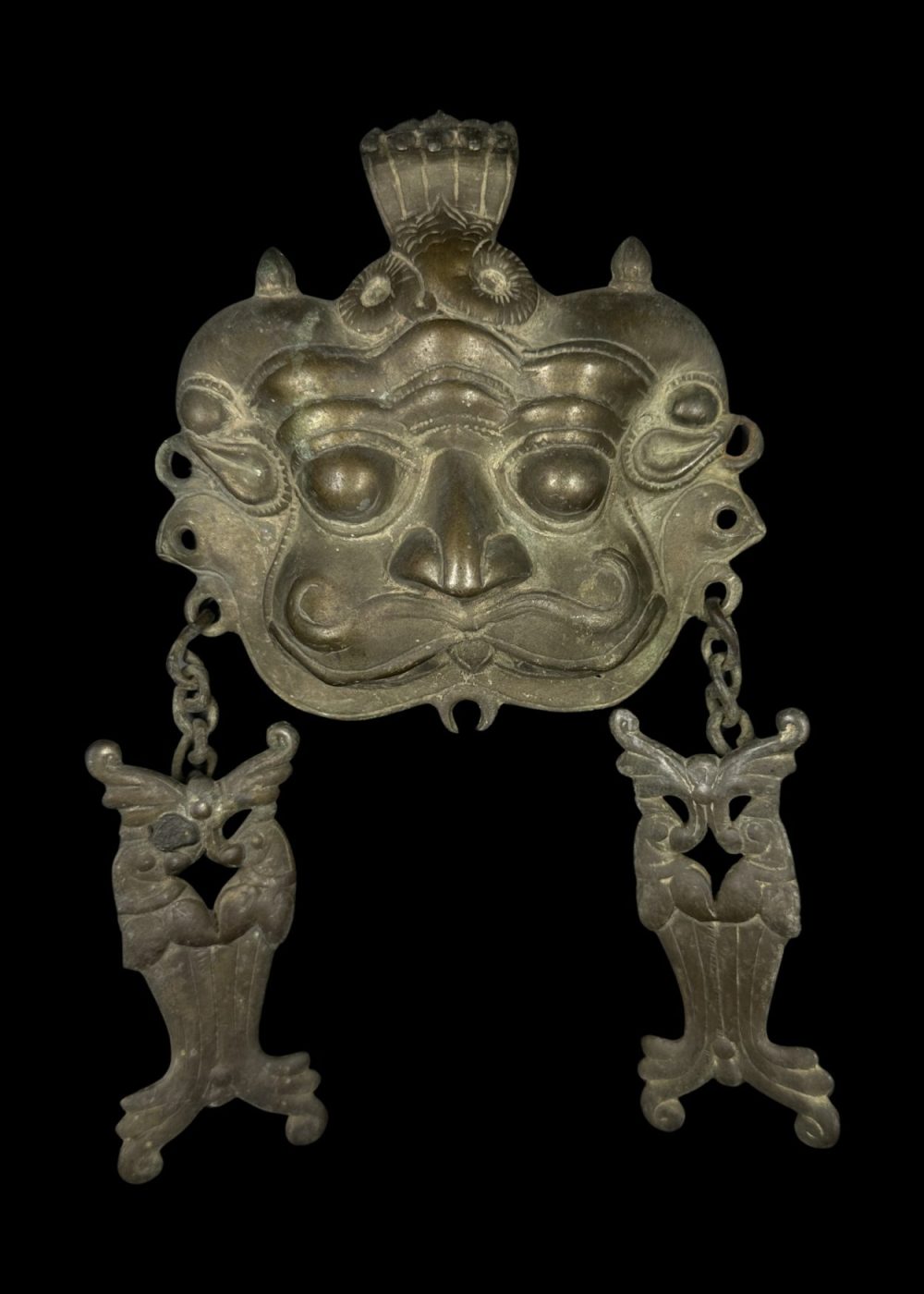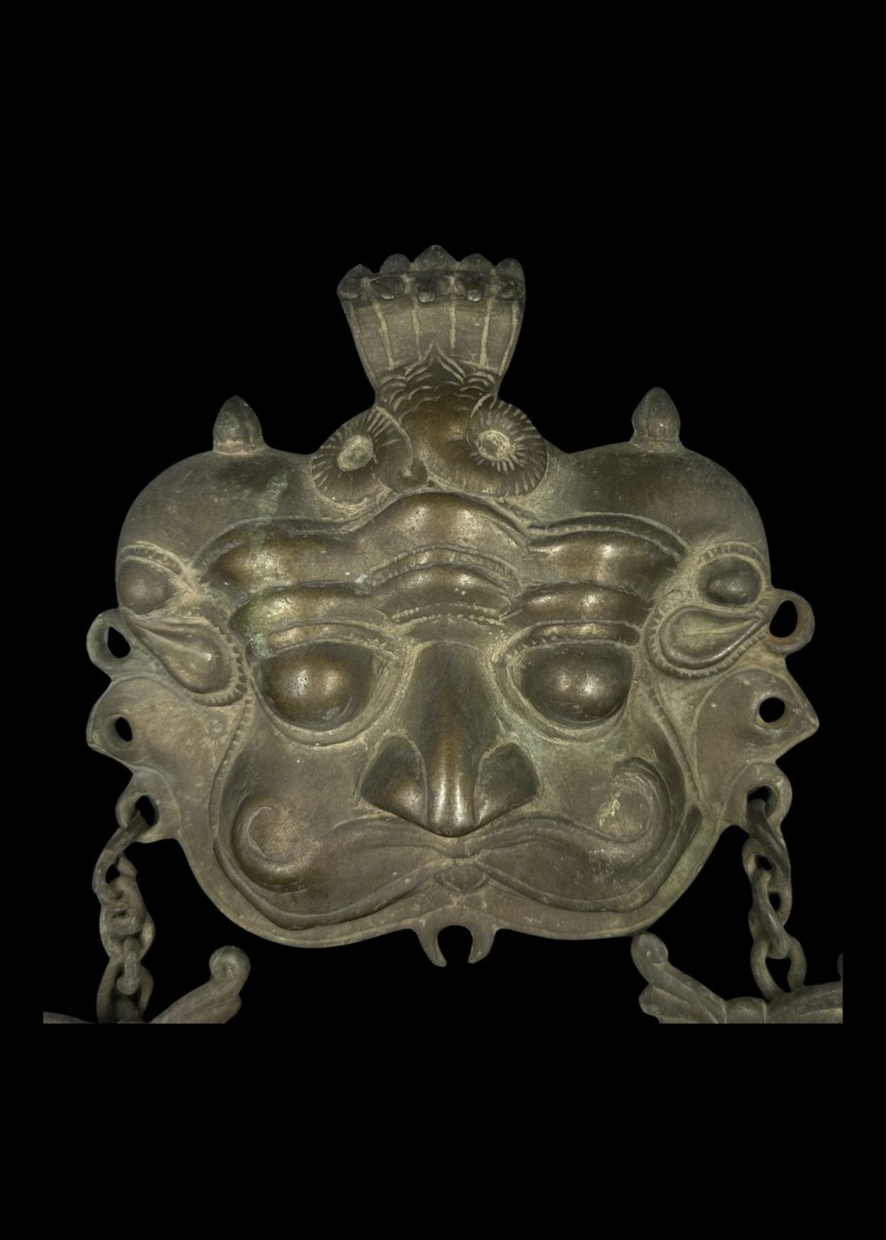 This bronze mask from Nepal features a fierce, stylized face with prominent eyes, a mustache, and ornate detailing, likely representing a protective deity or guardian figure. The mask is adorned with two suspended bird-like ornaments, enhancing its ceremonial or architectural function, possibly used to ward off evil in religious or domestic spaces.
