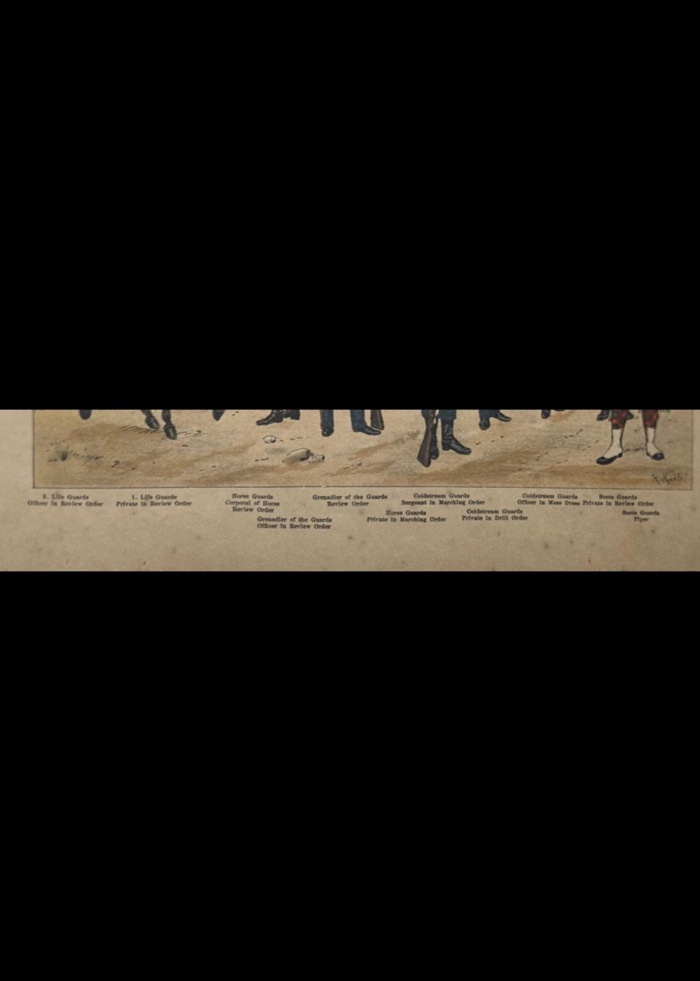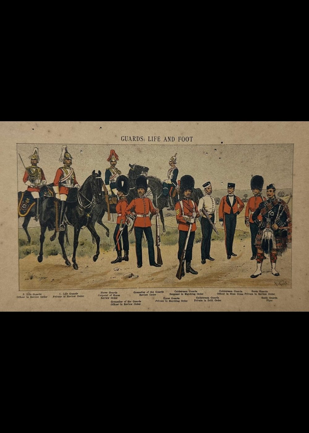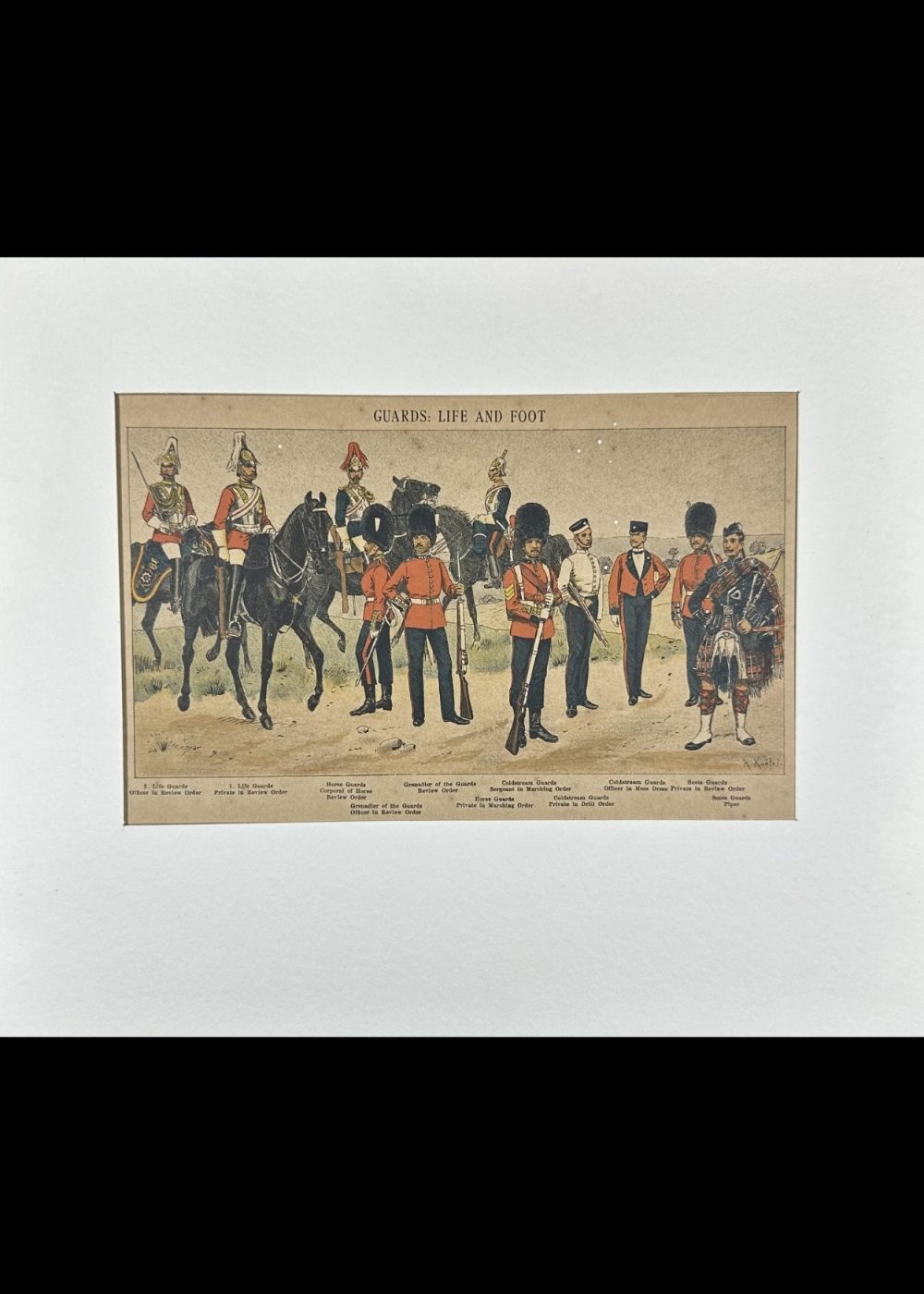 This vintage lithograph illustration depicts various regiments of the British Army’s Guards Division, both cavalry and infantry. The left side features the Life Guards and Horse Guards mounted on horses, adorned with plumed helmets and ceremonial armor. The center and right sections showcase the Foot Guards, including the Grenadier, Coldstream, Scots, Irish, and Welsh Guards, distinguished by their iconic red tunics and bearskin hats. A Highland regiment piper in traditional Scottish attire stands at the far right. The artwork highlights the rich diversity, pageantry, and formal dress of Britain’s elite military units during the late 19th to early 20th century.