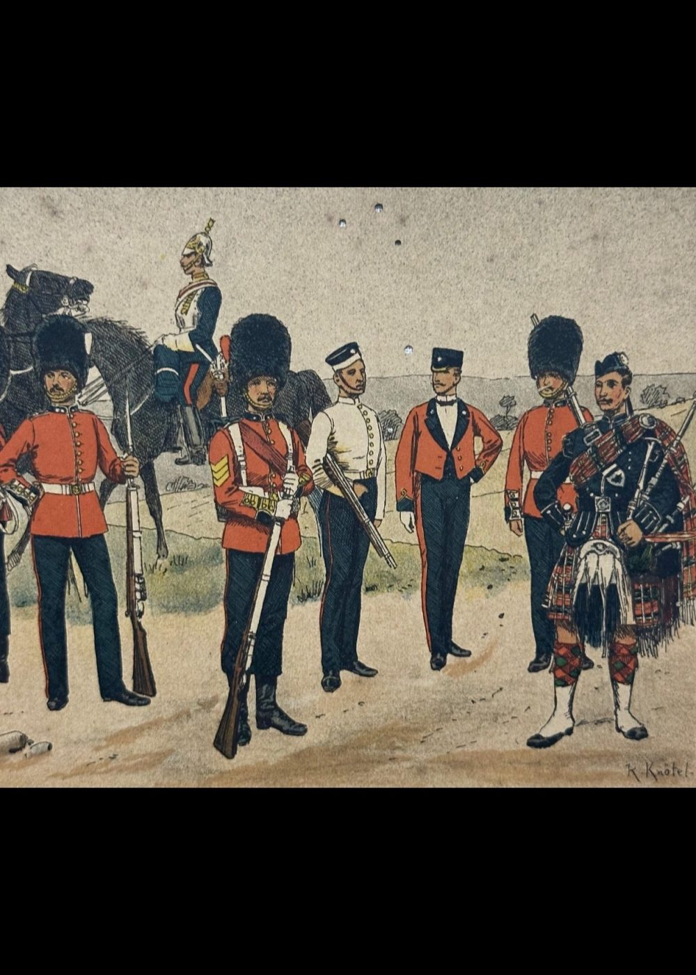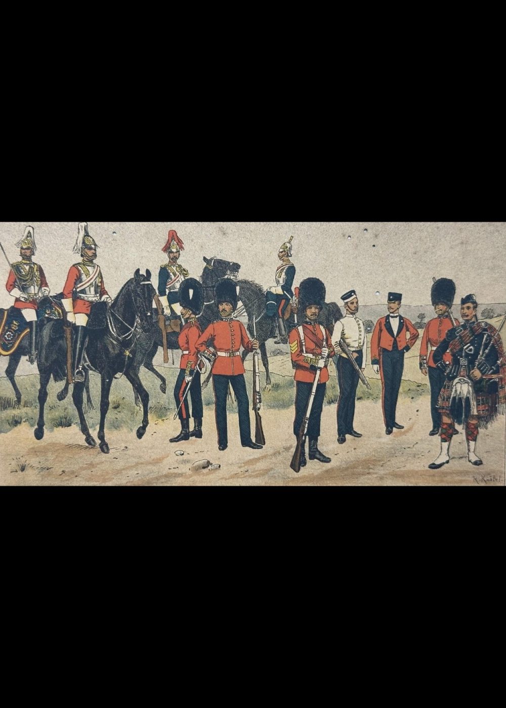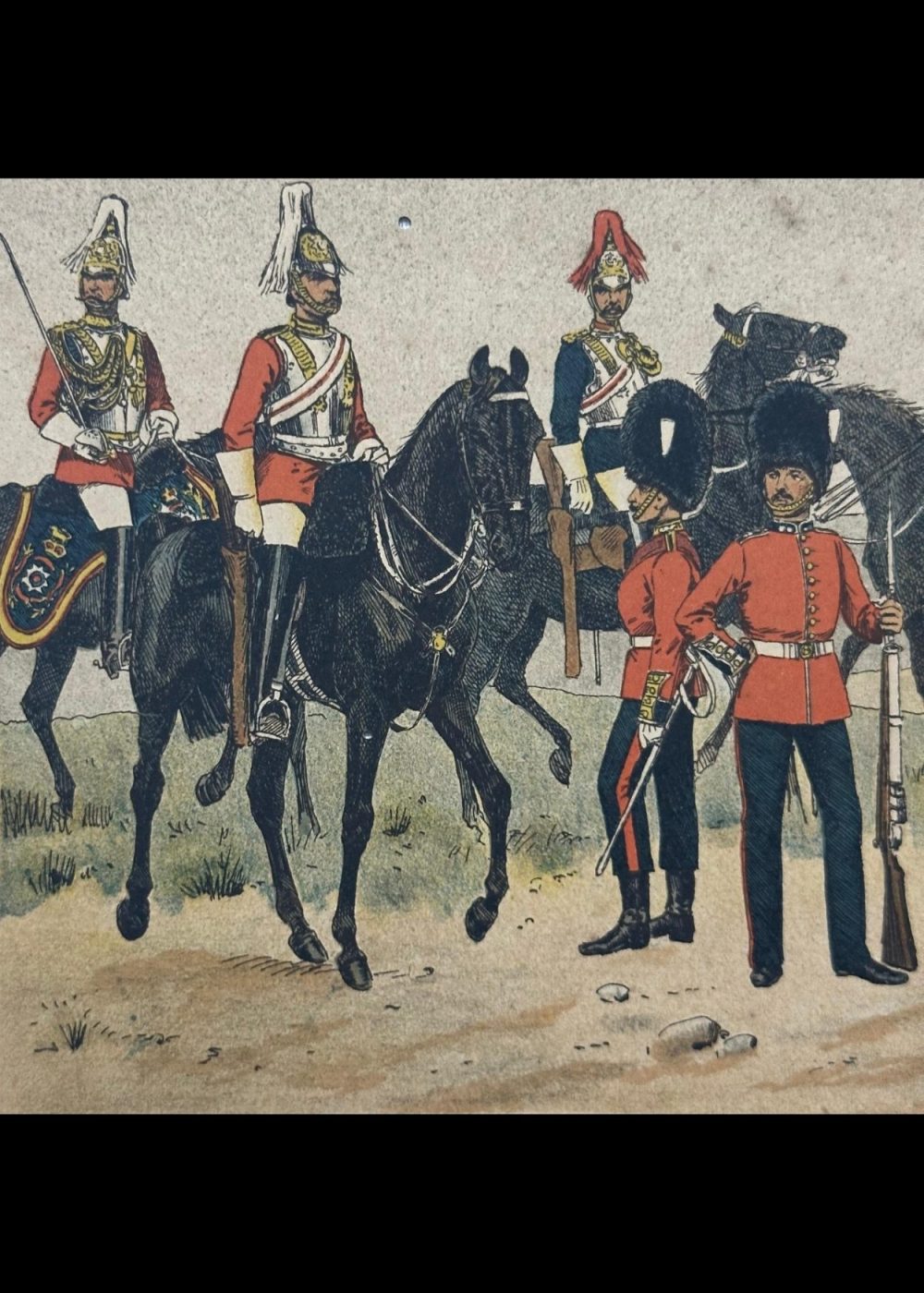 This vintage lithograph illustration depicts various regiments of the British Army’s Guards Division, both cavalry and infantry. The left side features the Life Guards and Horse Guards mounted on horses, adorned with plumed helmets and ceremonial armor. The center and right sections showcase the Foot Guards, including the Grenadier, Coldstream, Scots, Irish, and Welsh Guards, distinguished by their iconic red tunics and bearskin hats. A Highland regiment piper in traditional Scottish attire stands at the far right. The artwork highlights the rich diversity, pageantry, and formal dress of Britain’s elite military units during the late 19th to early 20th century.